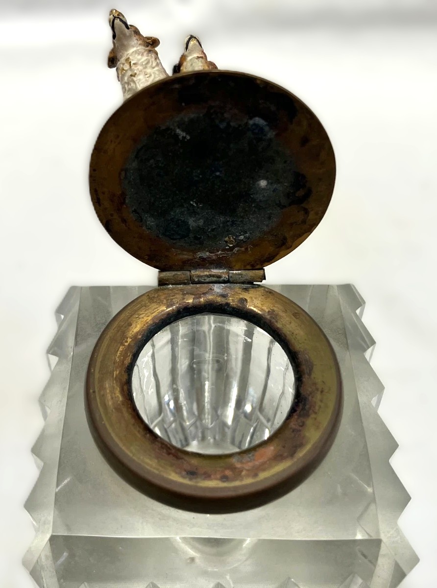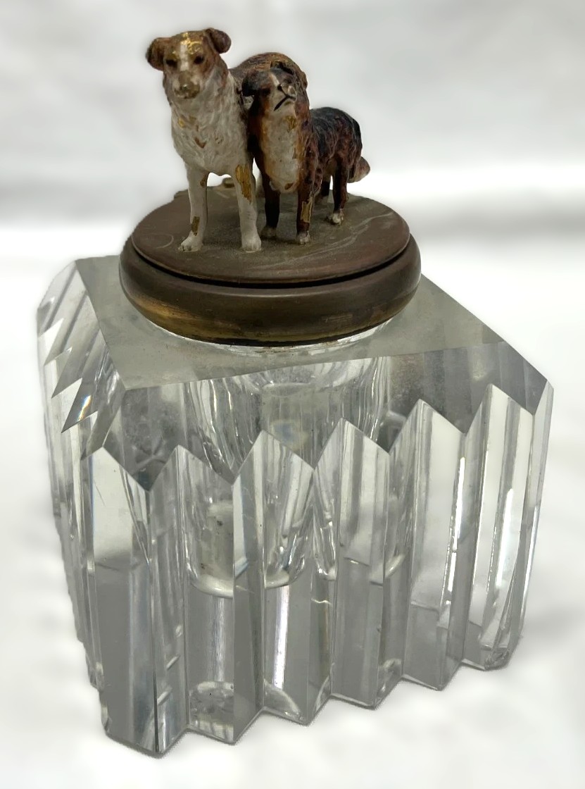 This is a late-19th to early-20th-century inkwell featuring a heavy, clear cut-glass base and a decorative cold-painted bronze lid.