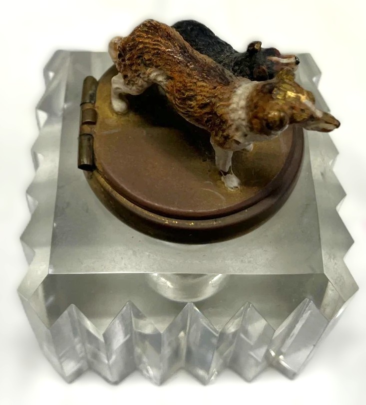 - The Lid: The circular hinged lid is made of patinated brass and serves as a stage for two exceptionally detailed Collies.