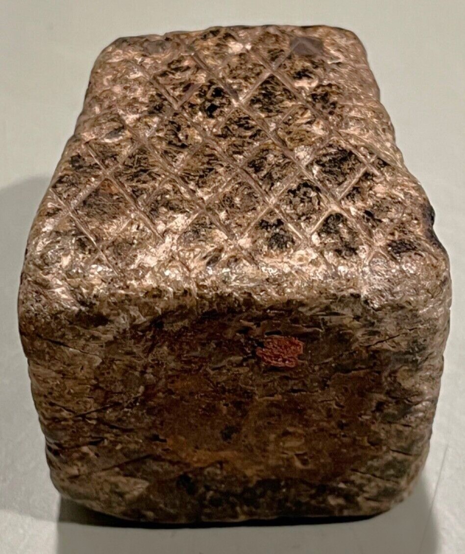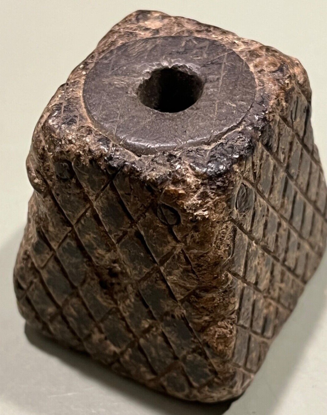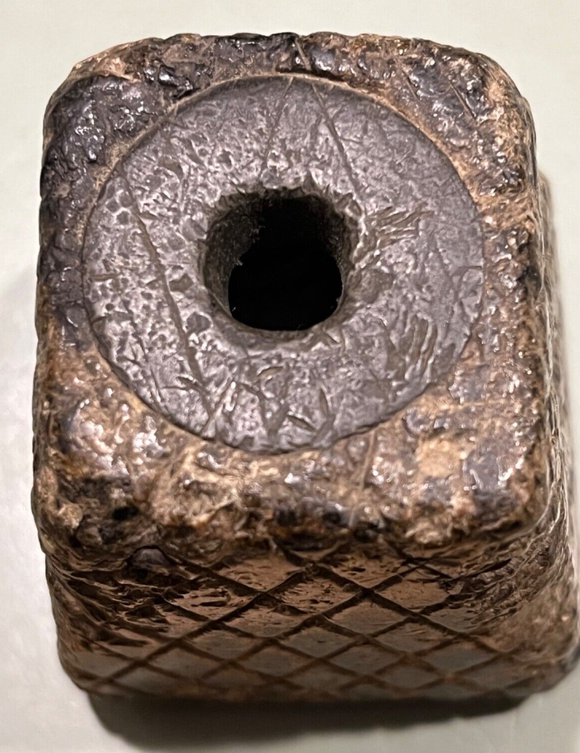 Obelisk form soapstone inkwell with an iron receptacle mounted to the interior by bolts. The sides have a carved cross hatch decoration.