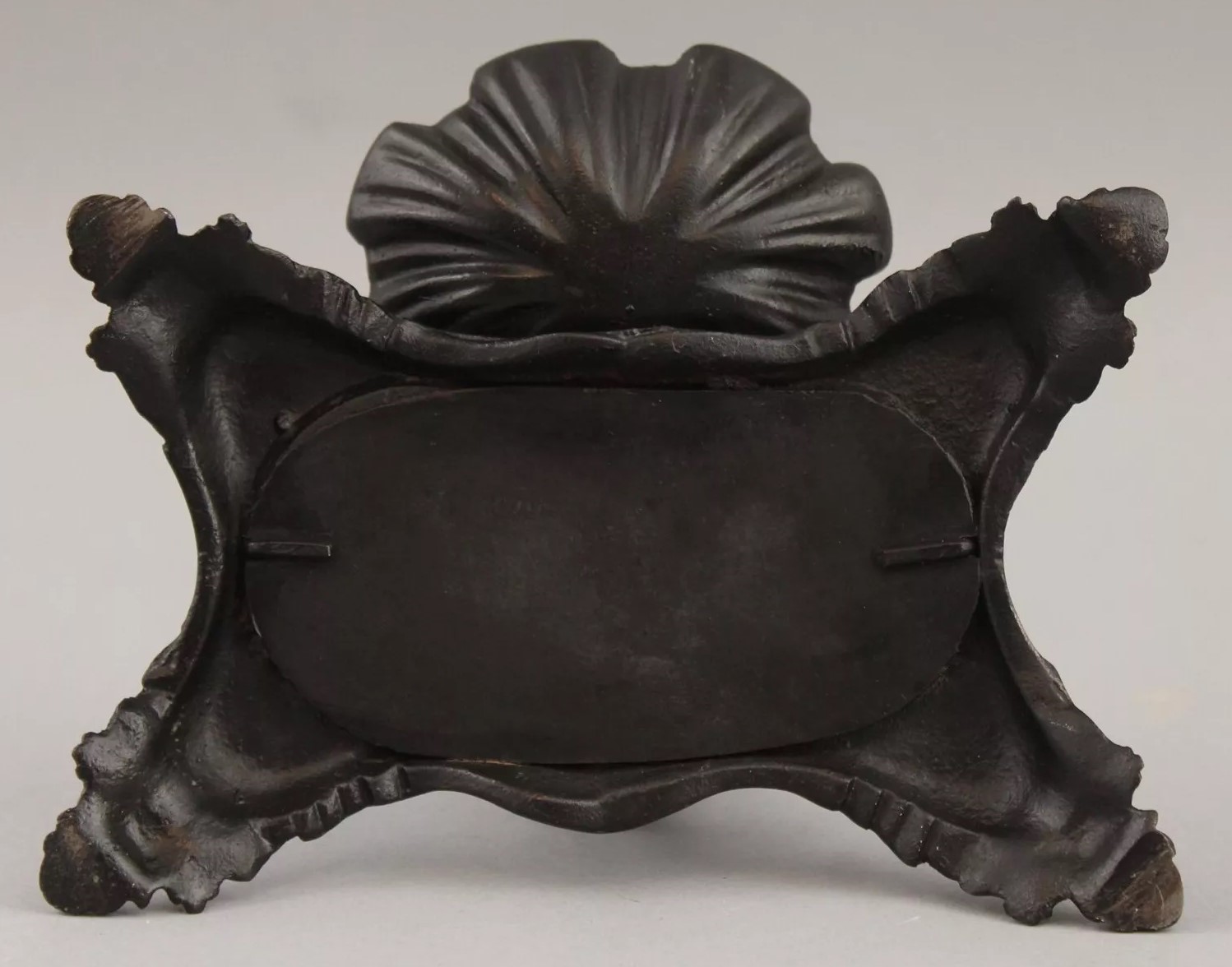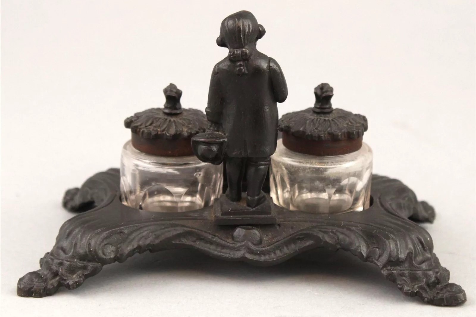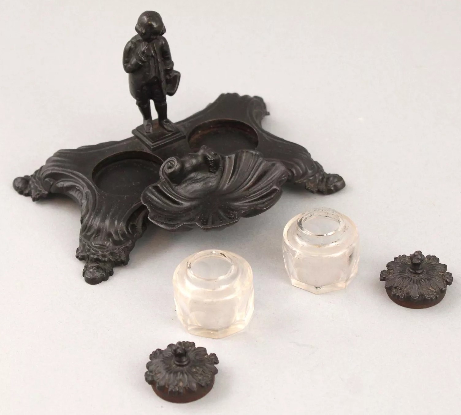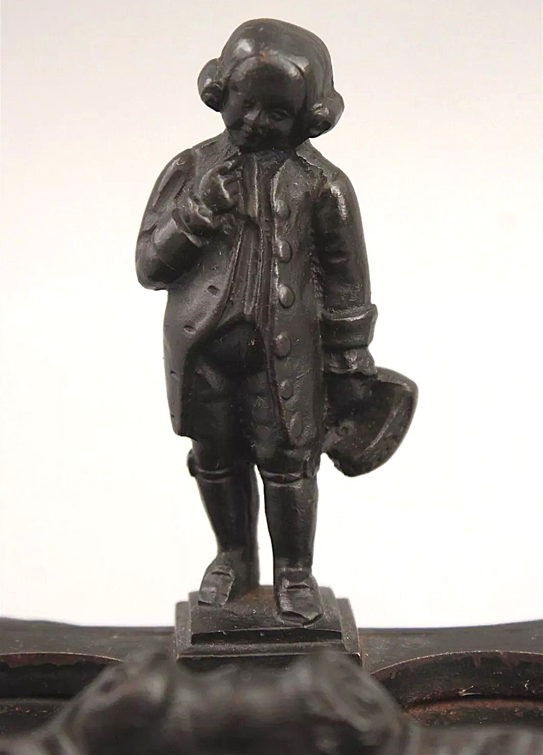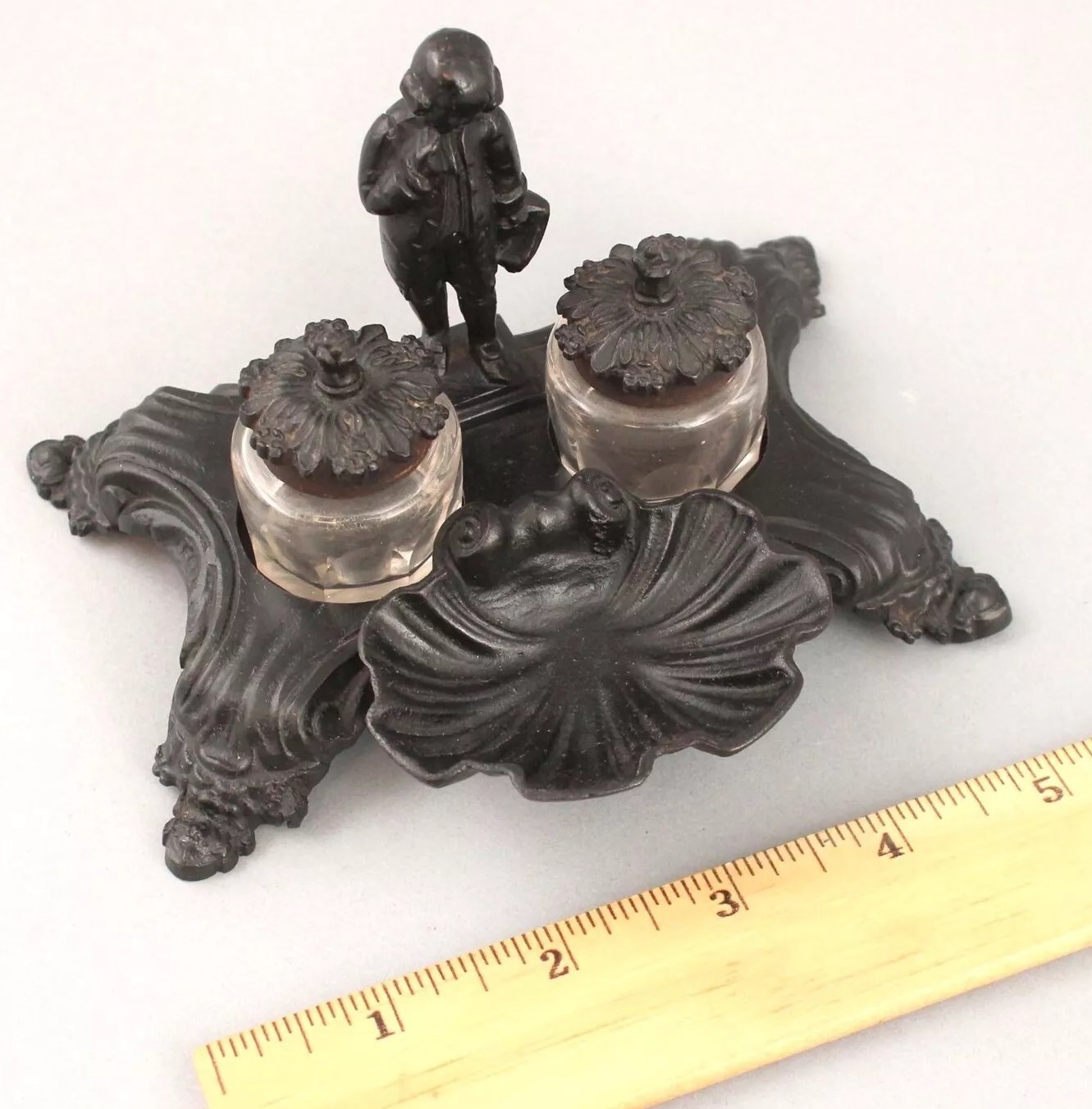 This inkstand holds a pair of inkwells with ornate lids on a cast iron base which features a shell-shaped area to hold writing accessories. At the center stands a figure of a colonial man, dressed in period attire. He is wearing a queue wig, characterized by its tail-like feature at the back, and is holding a tri-corner hat by his side.