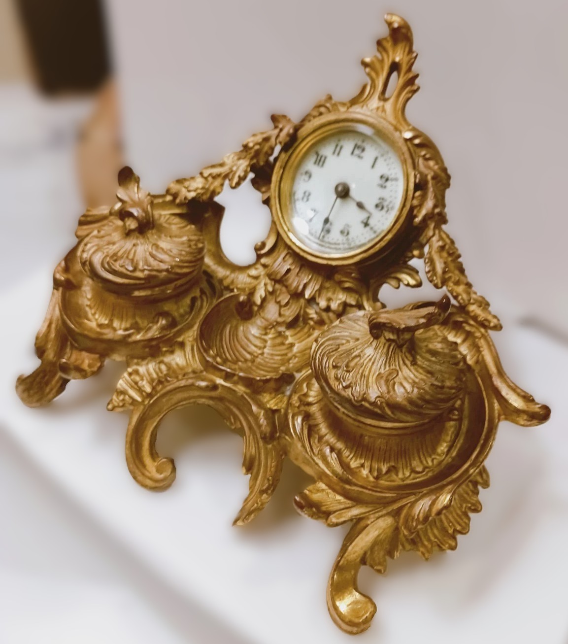 - Two hinged-lid inkwells, symmetrically flanking the clock