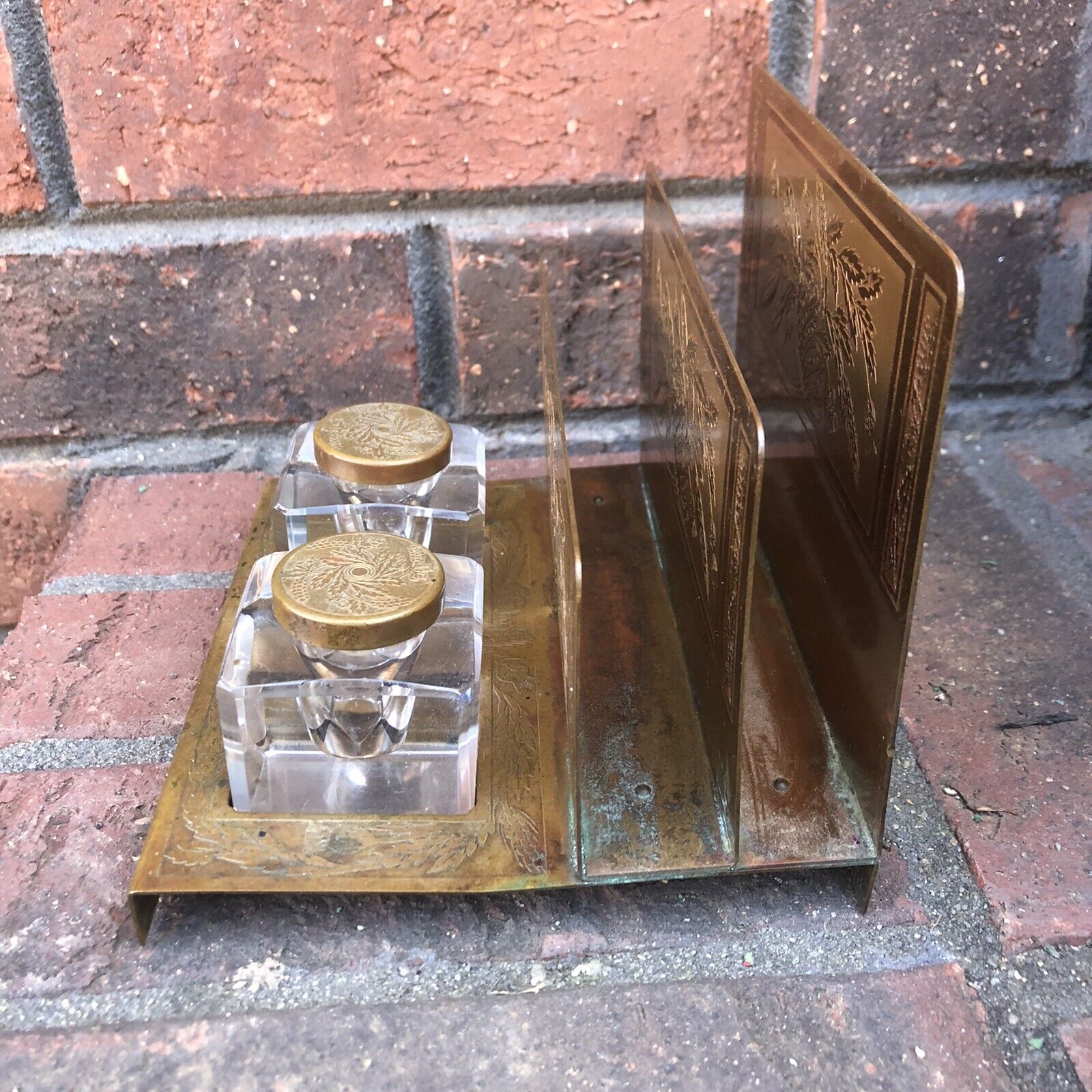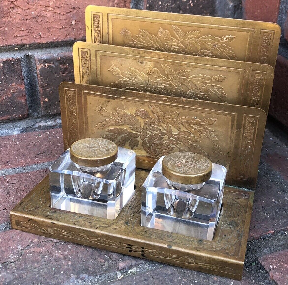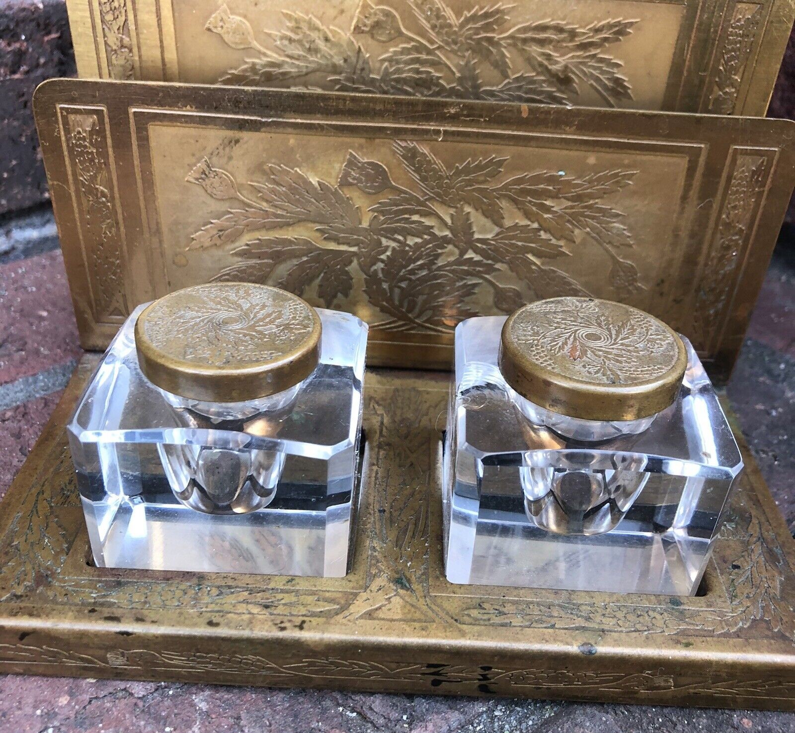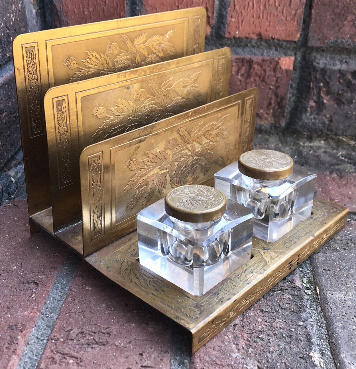 Two cut glass inkwells with separate lids rest on a brass base with letter dividers. The dividers are etched with a floral pattern (possibly poppies).