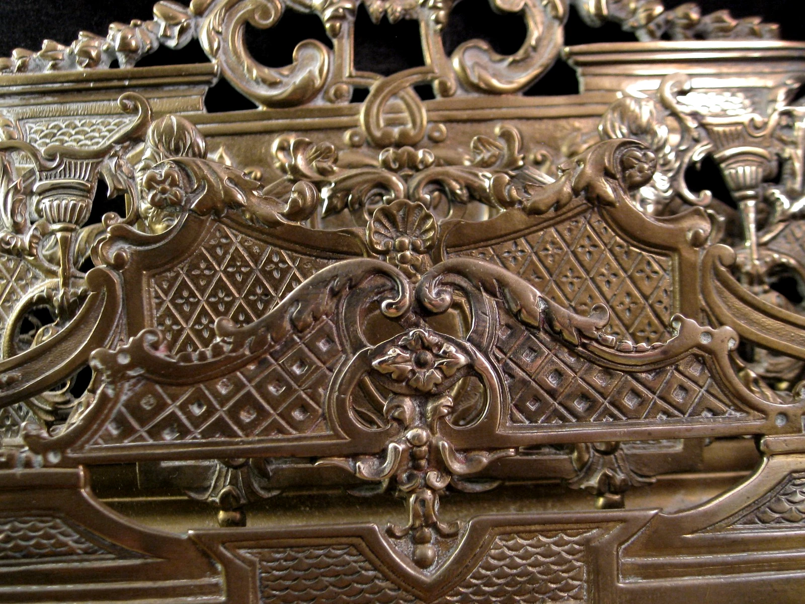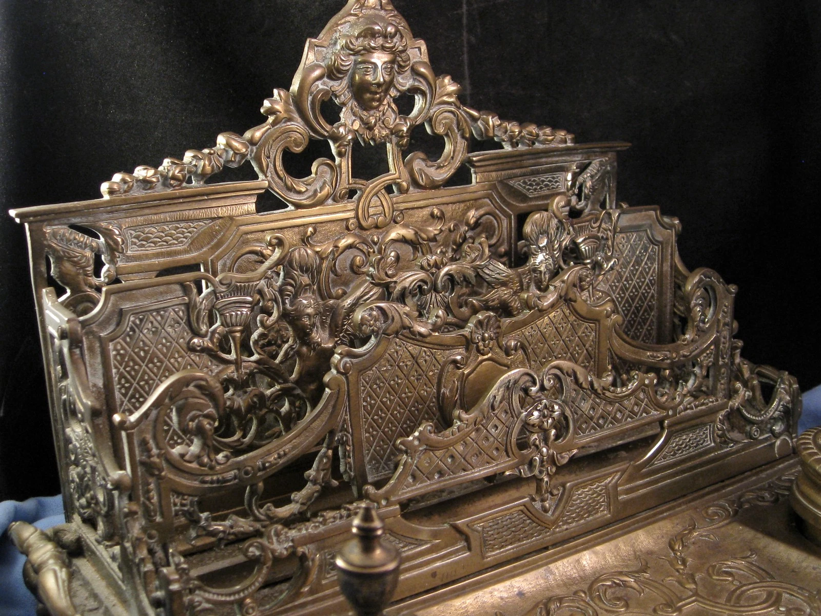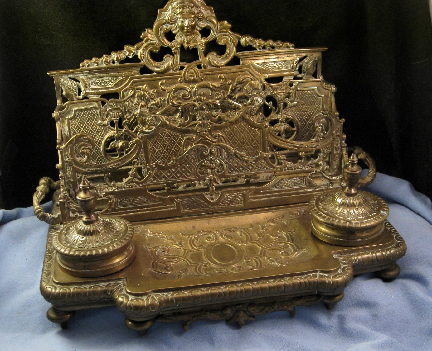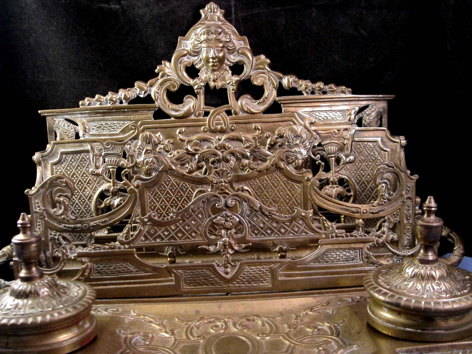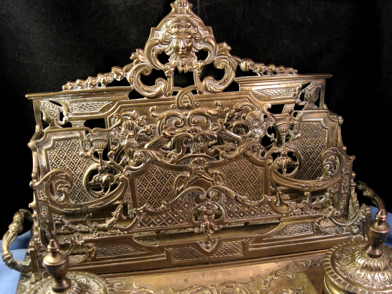 This is a highly ornate and elaborate desk set, combining a cast brass letter holder and a double inkstand. It is composed of a single, flowing structure that integrates multiple functions: