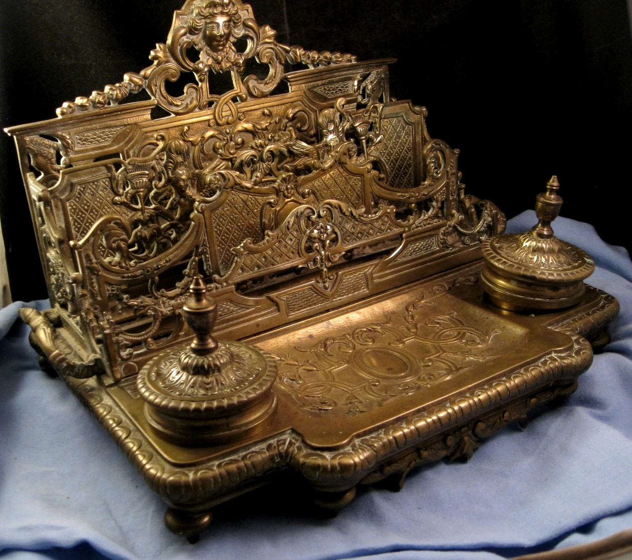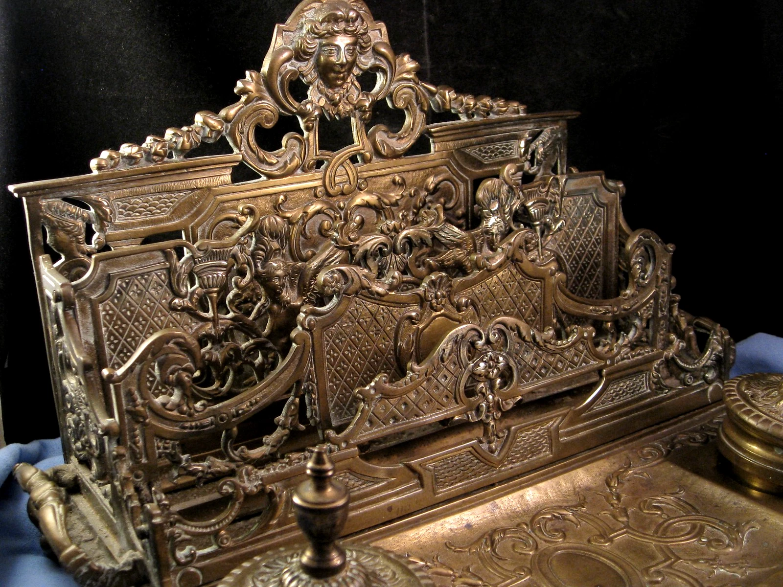 - Floral and Foliate Motifs: The ornate dividers and the finials on the inkwell lids are decorated with flowing floral, acanthus, and foliate designs.