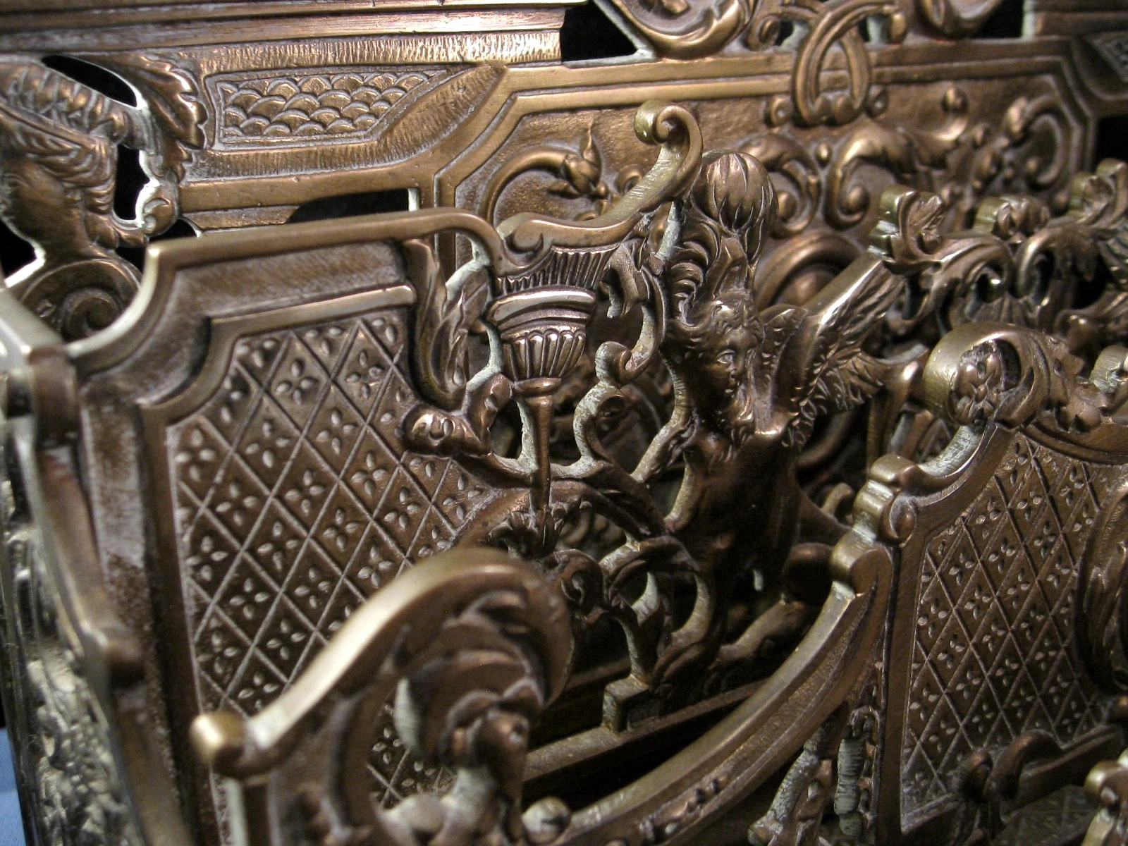 - Masks: Small, decorative masks or faces are integrated into the design, particularly at the bottom of the front section of the letter dividers.