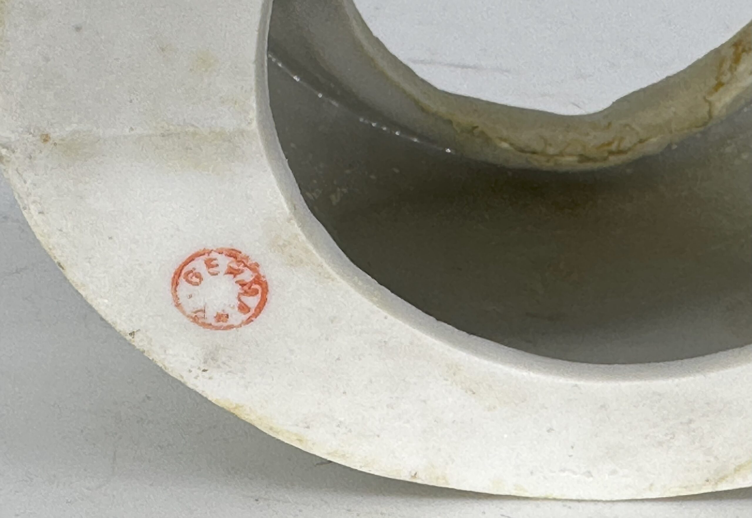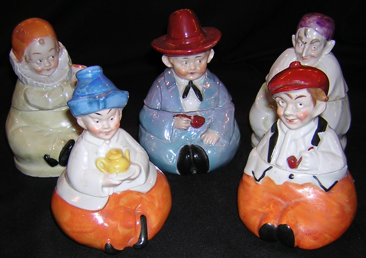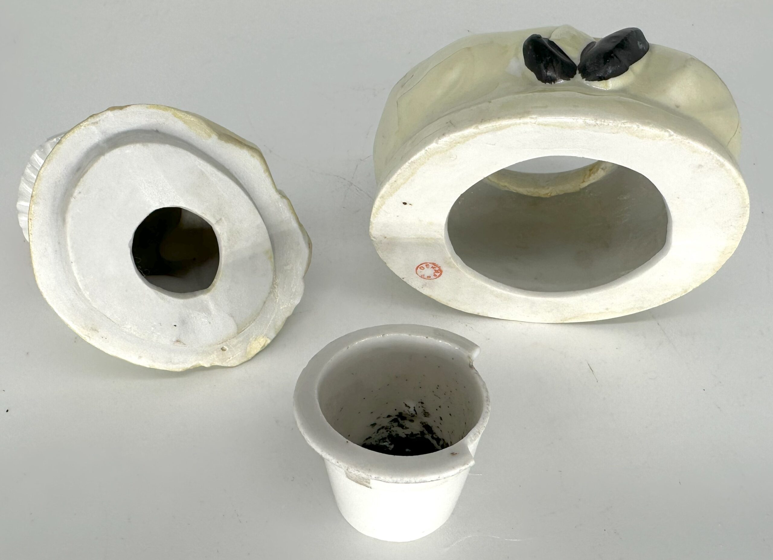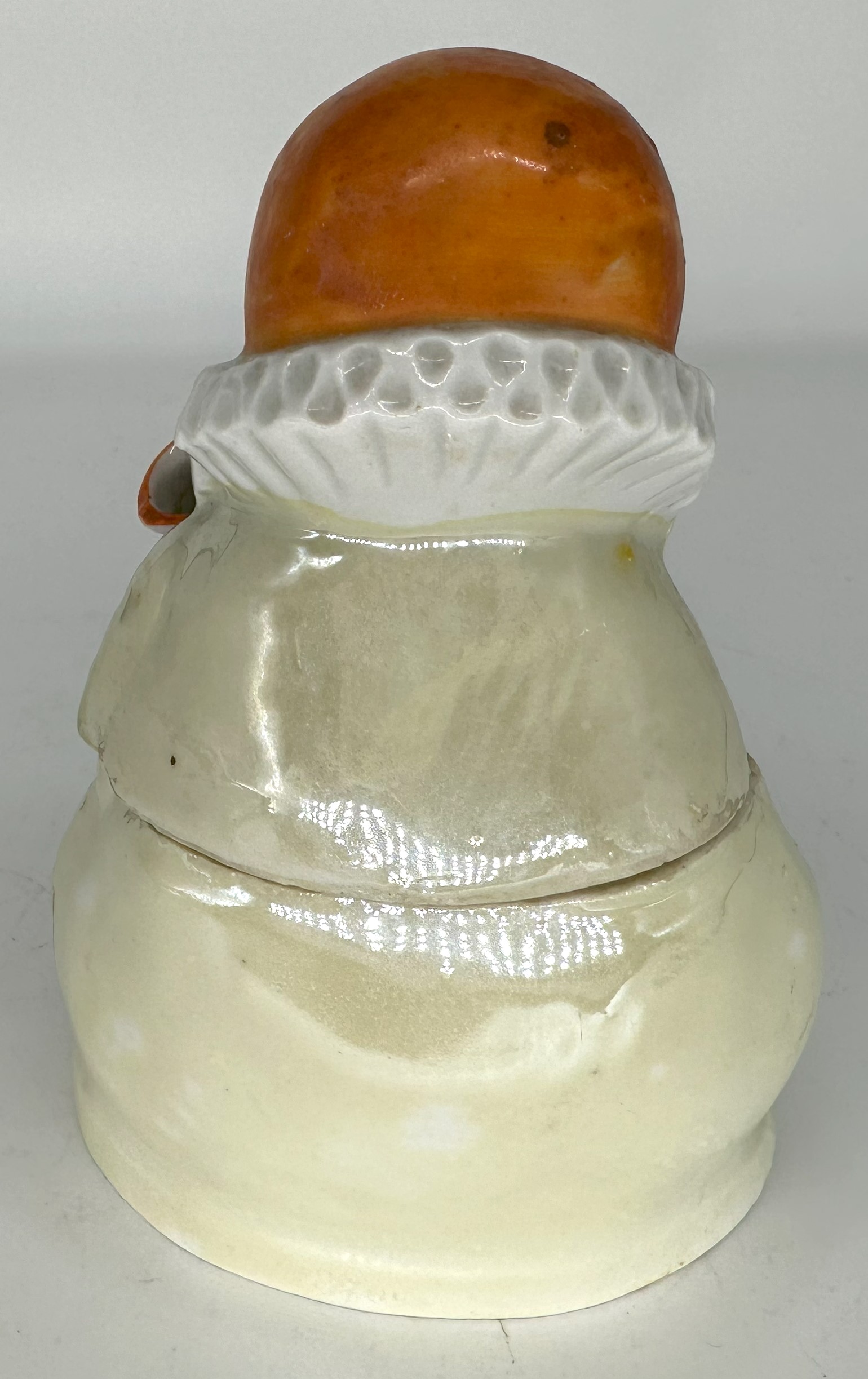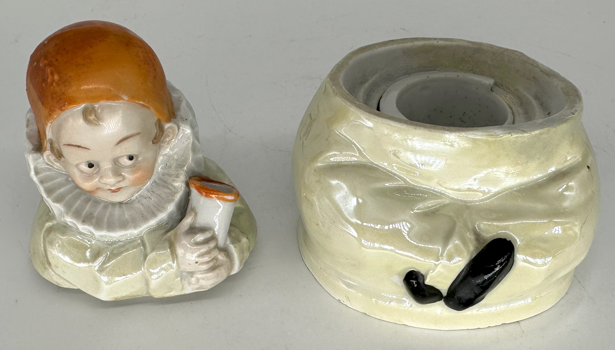 This inkwell is one of a series – cartoonish characters with bulbous bottoms and a lift off top to reveal the ink pot. Each has a place to hold a pen. All were made in Germany.