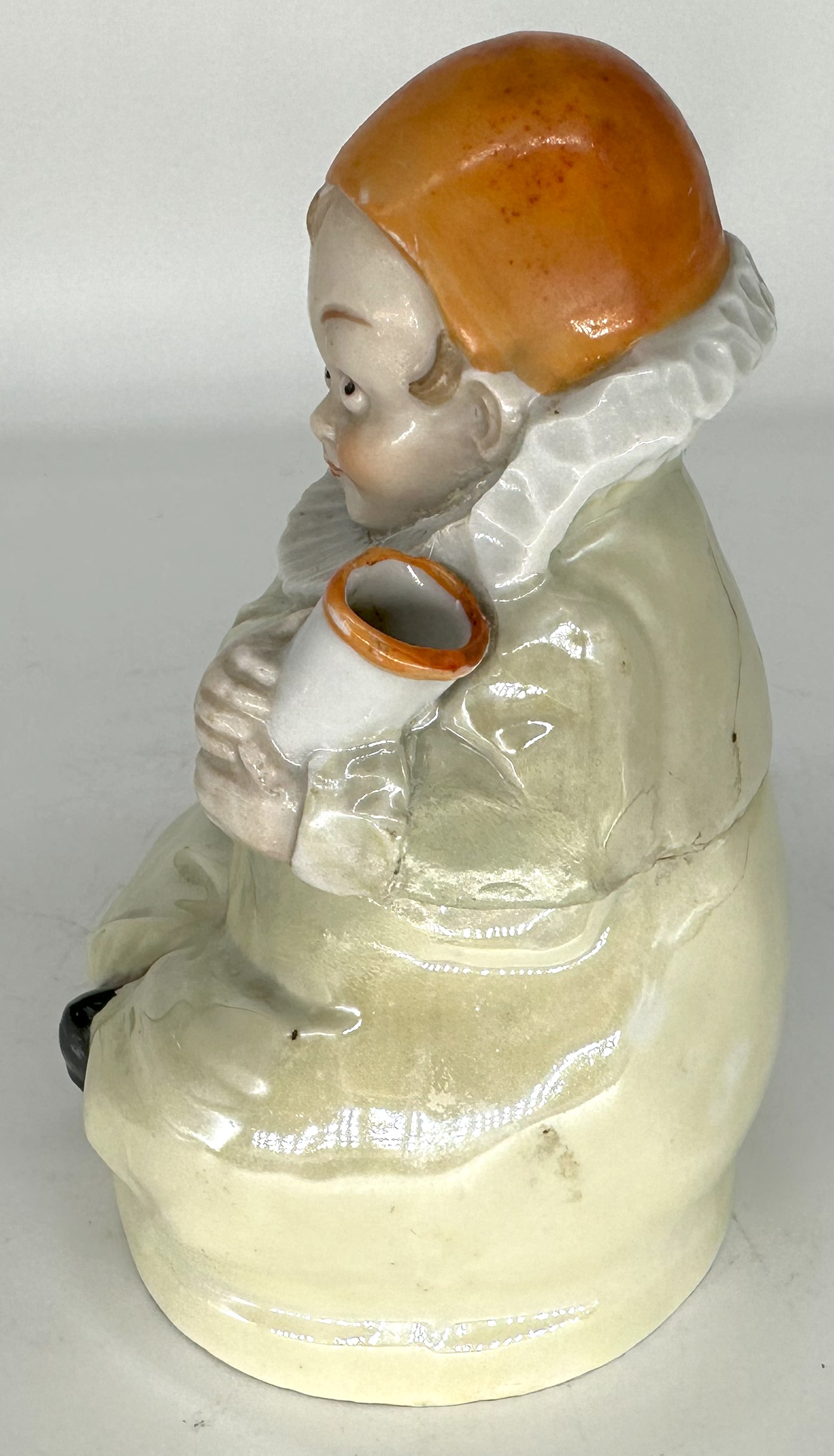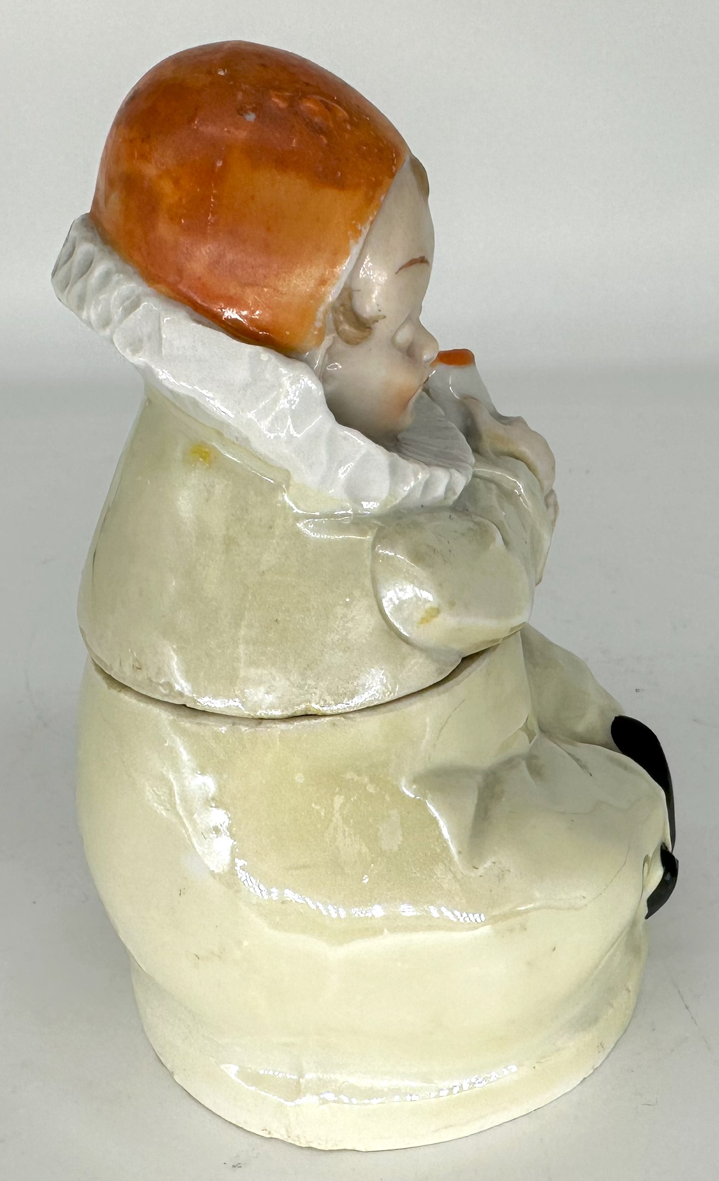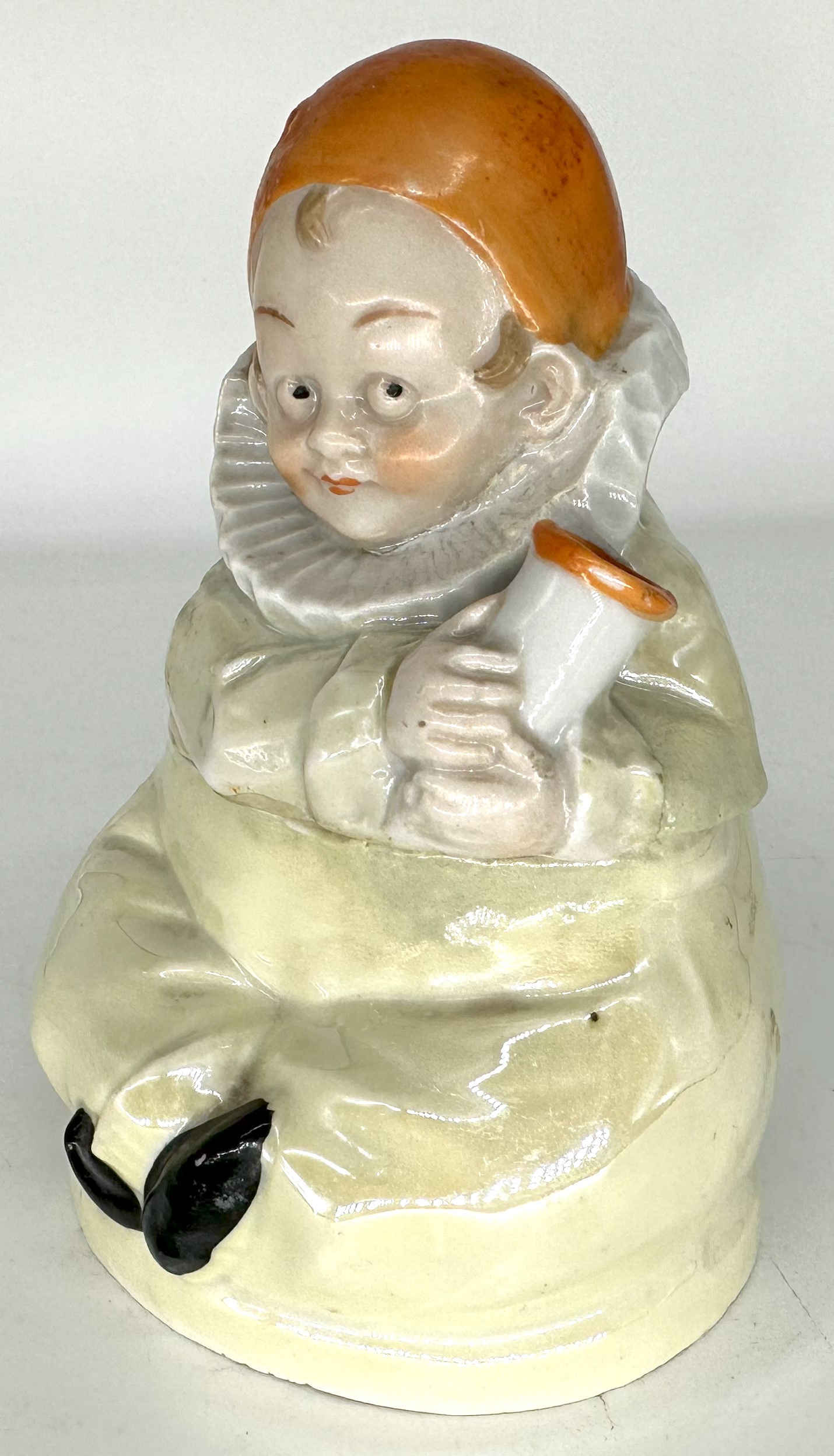 A sitting baby clown with a ruffled collar can hold a pen in his empty bottle. Marked “Germany” on the bottom.