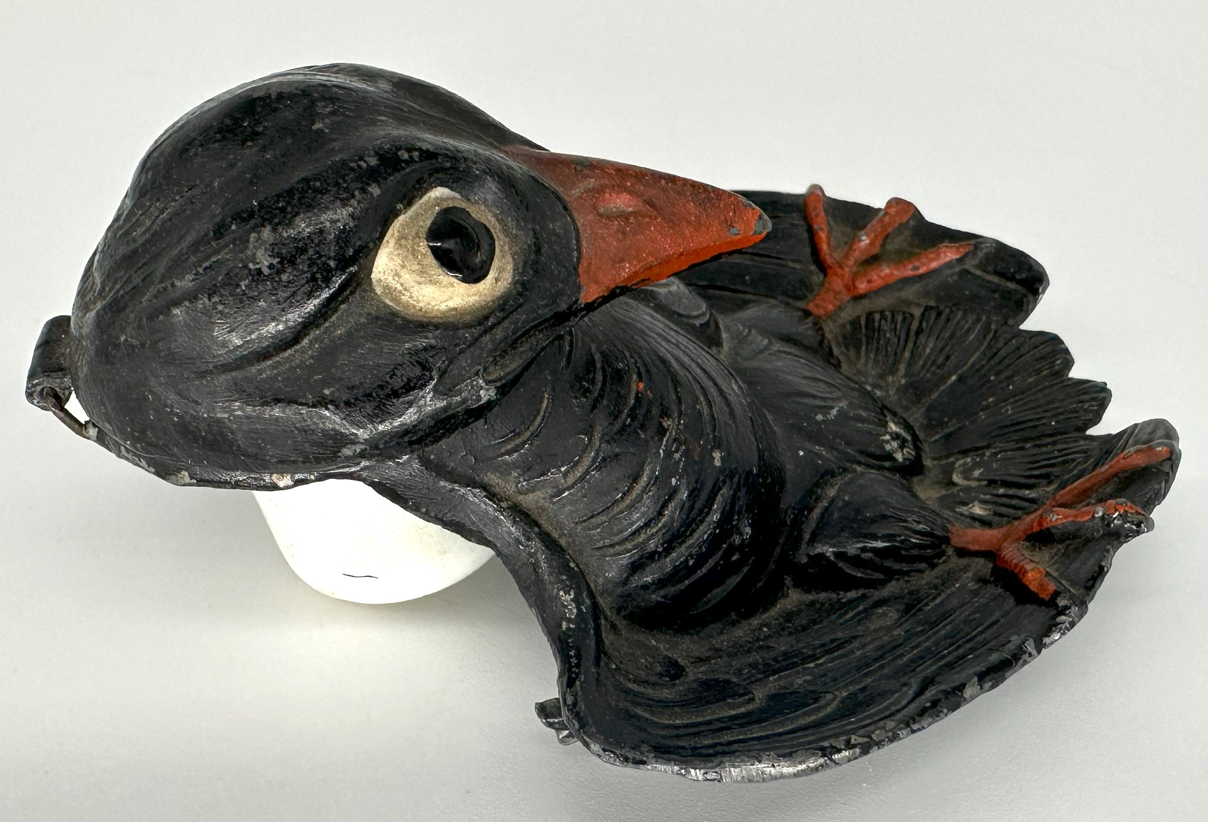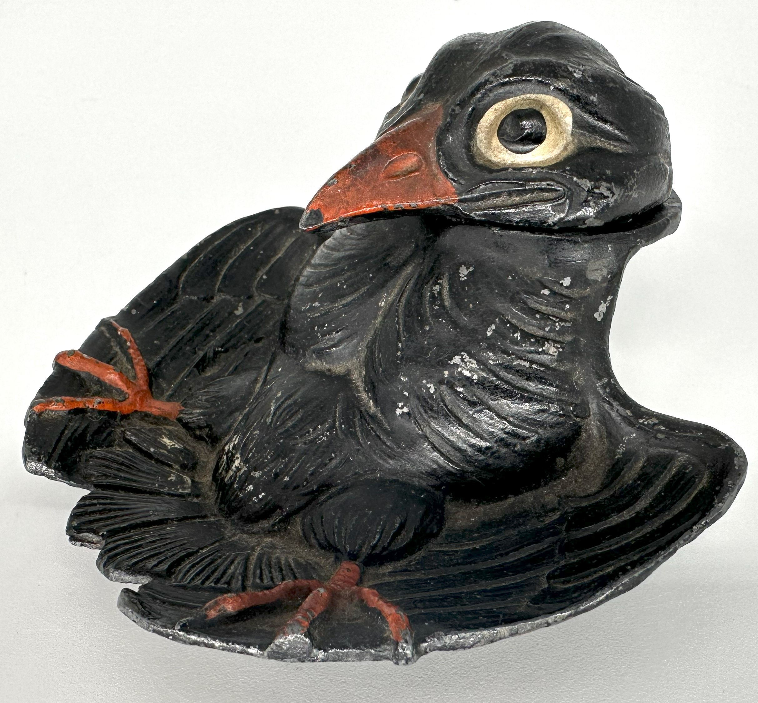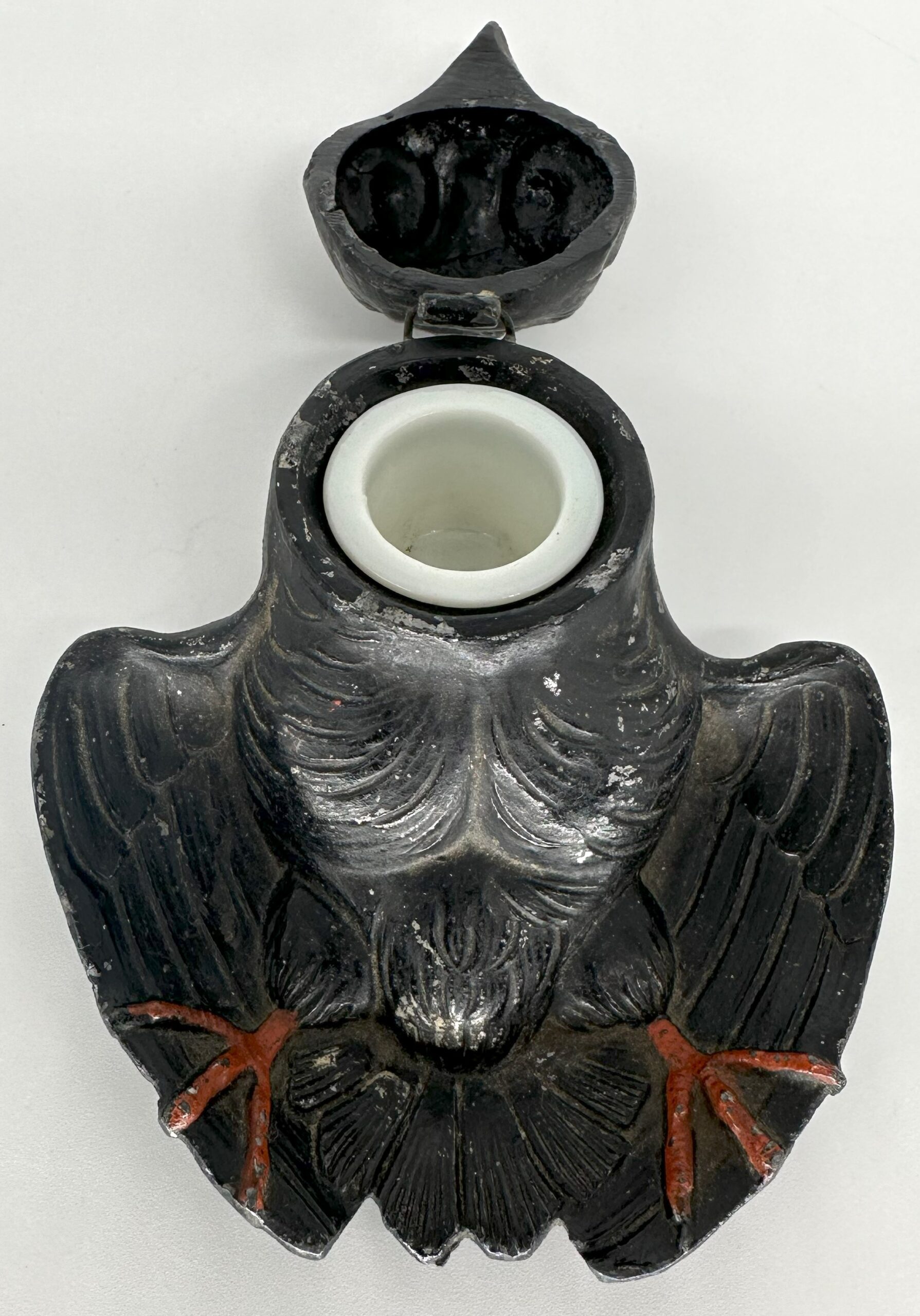 This painted metal crow’s wings are spread, forming a pen tray. Lift the head to access the ink.