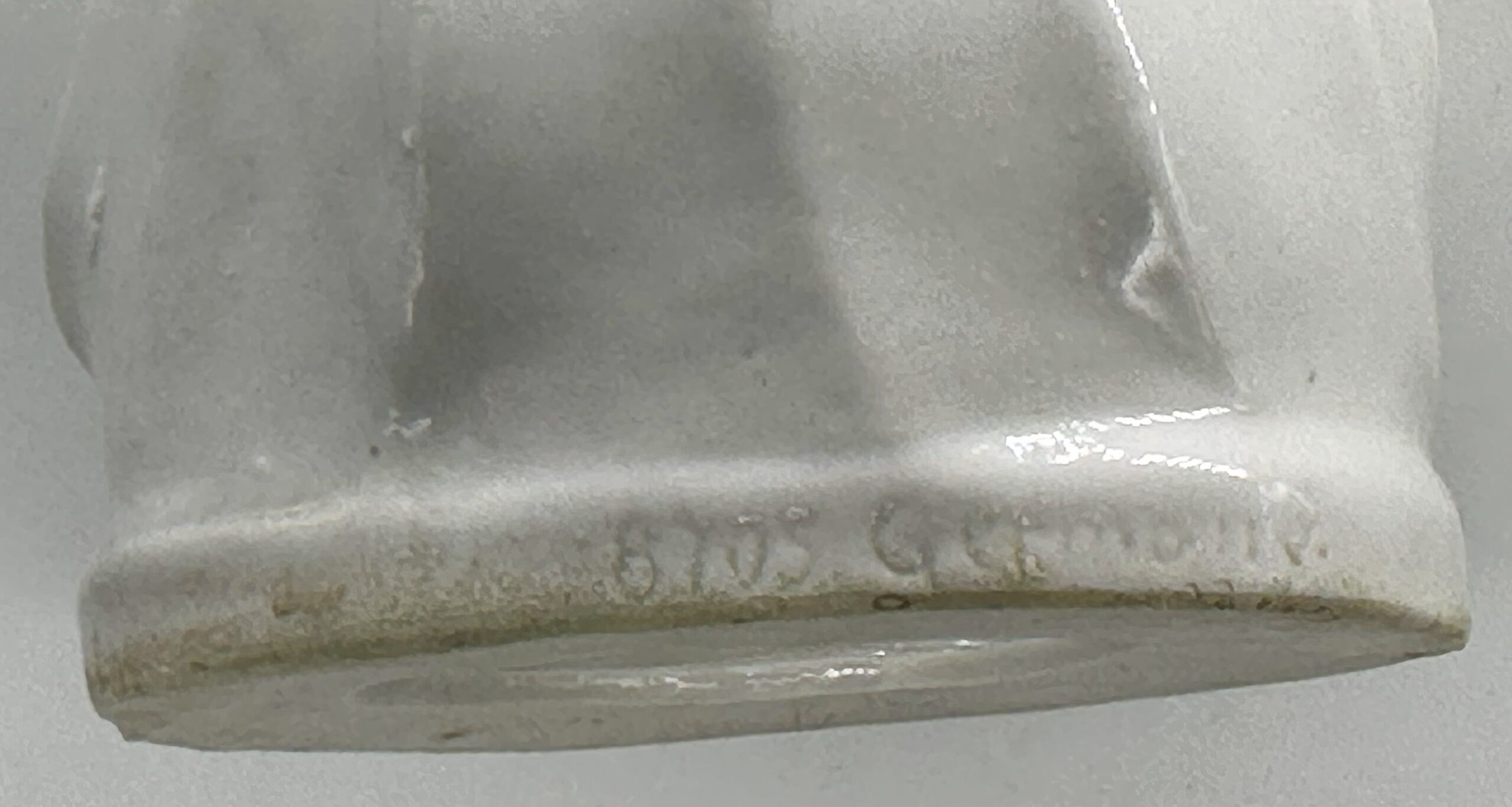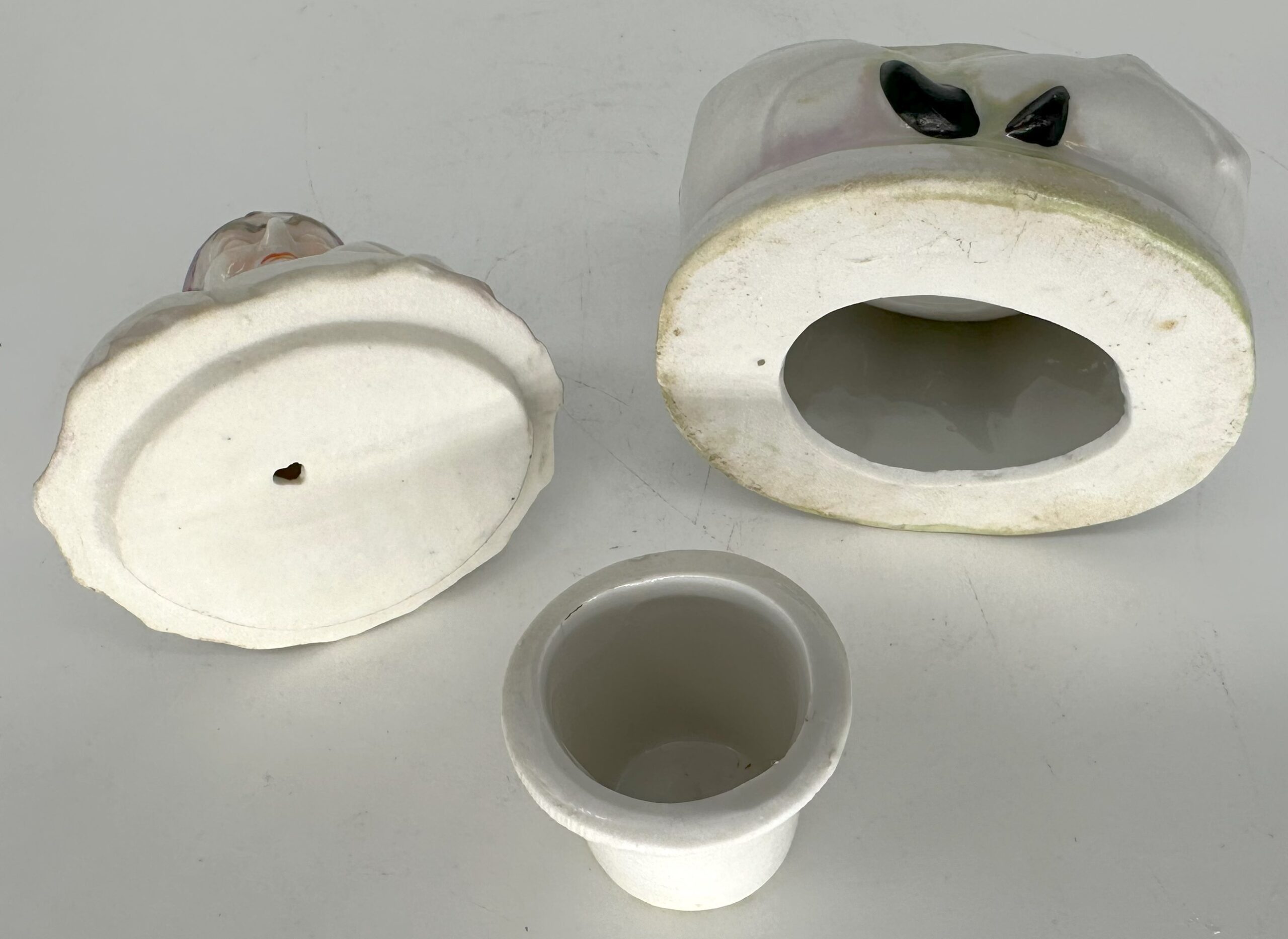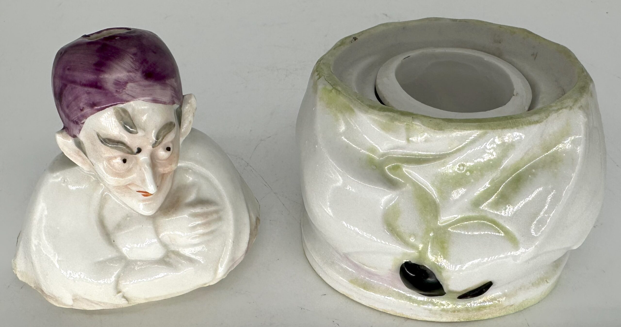 This inkwell is one of a series – cartoonish characters with bulbous bottoms and lift off top to reveal the ink pot. The head (top) has a hole to hold a pen. All were made in Germany.