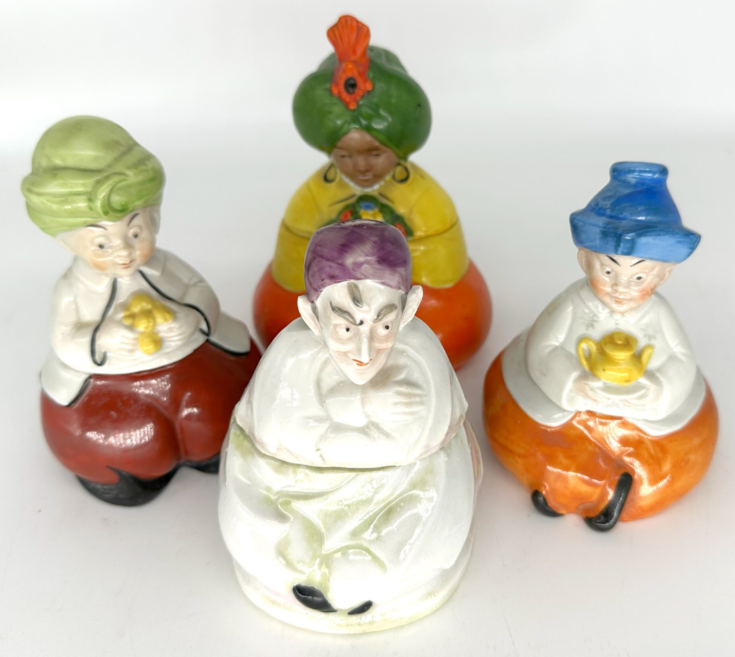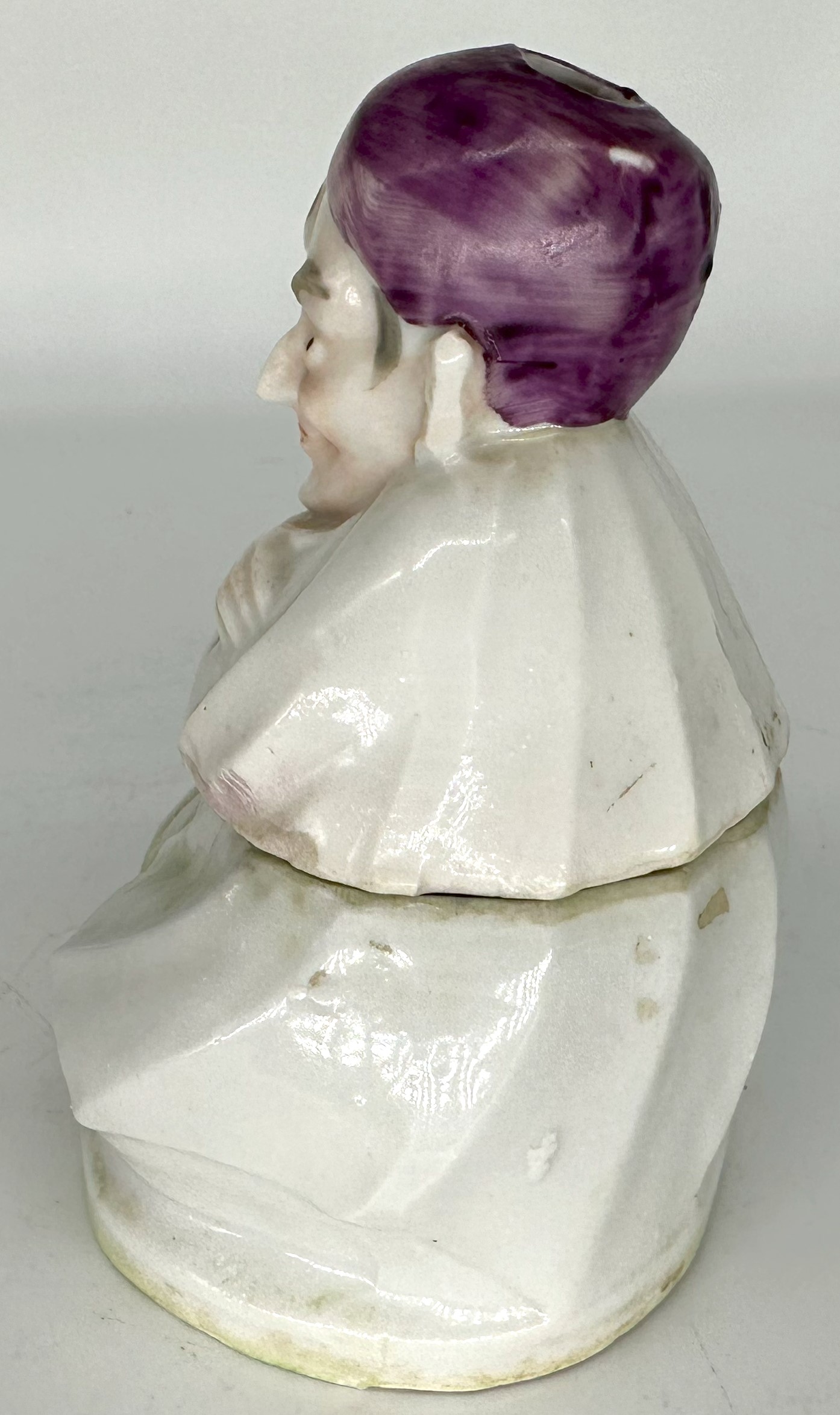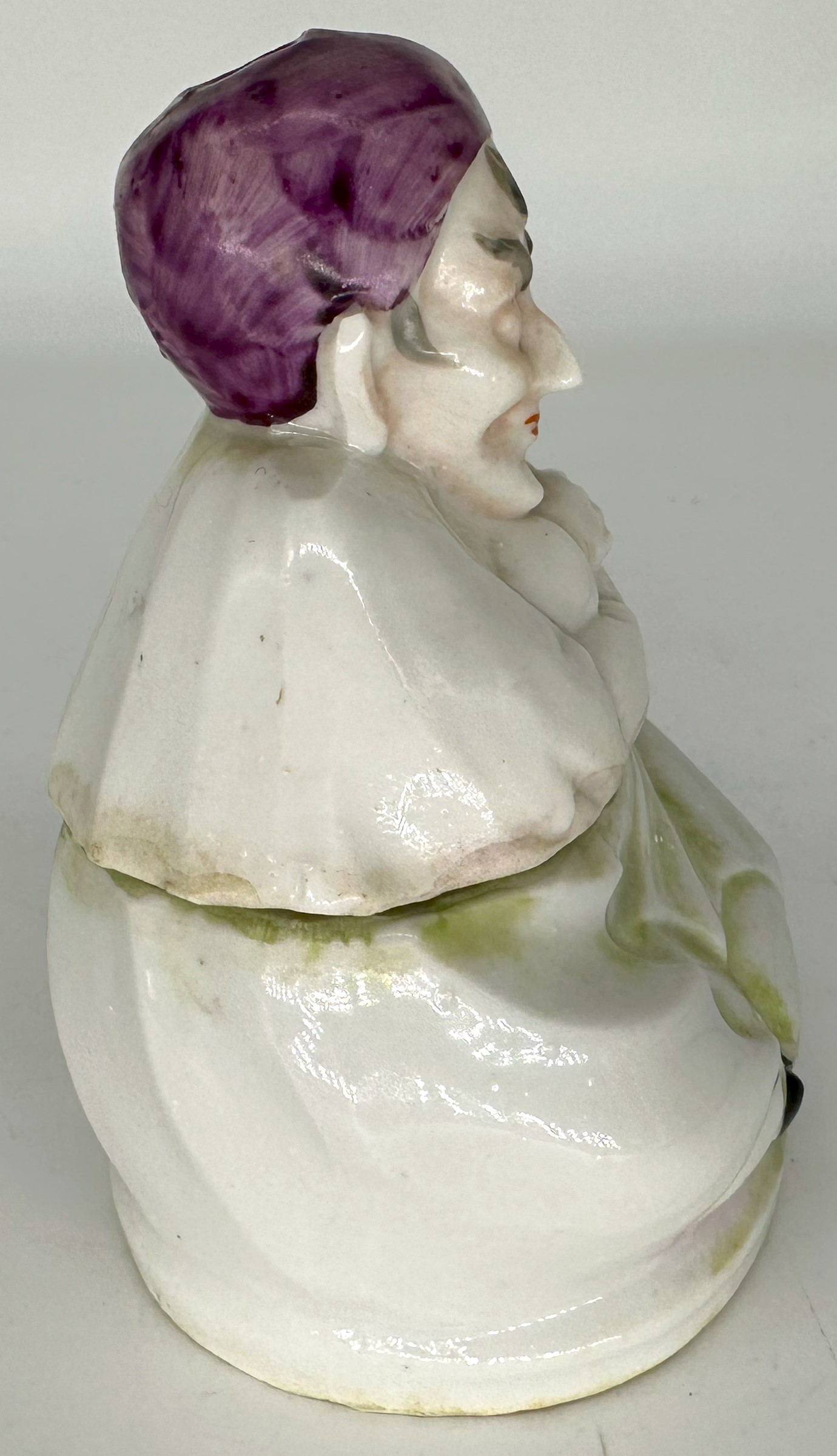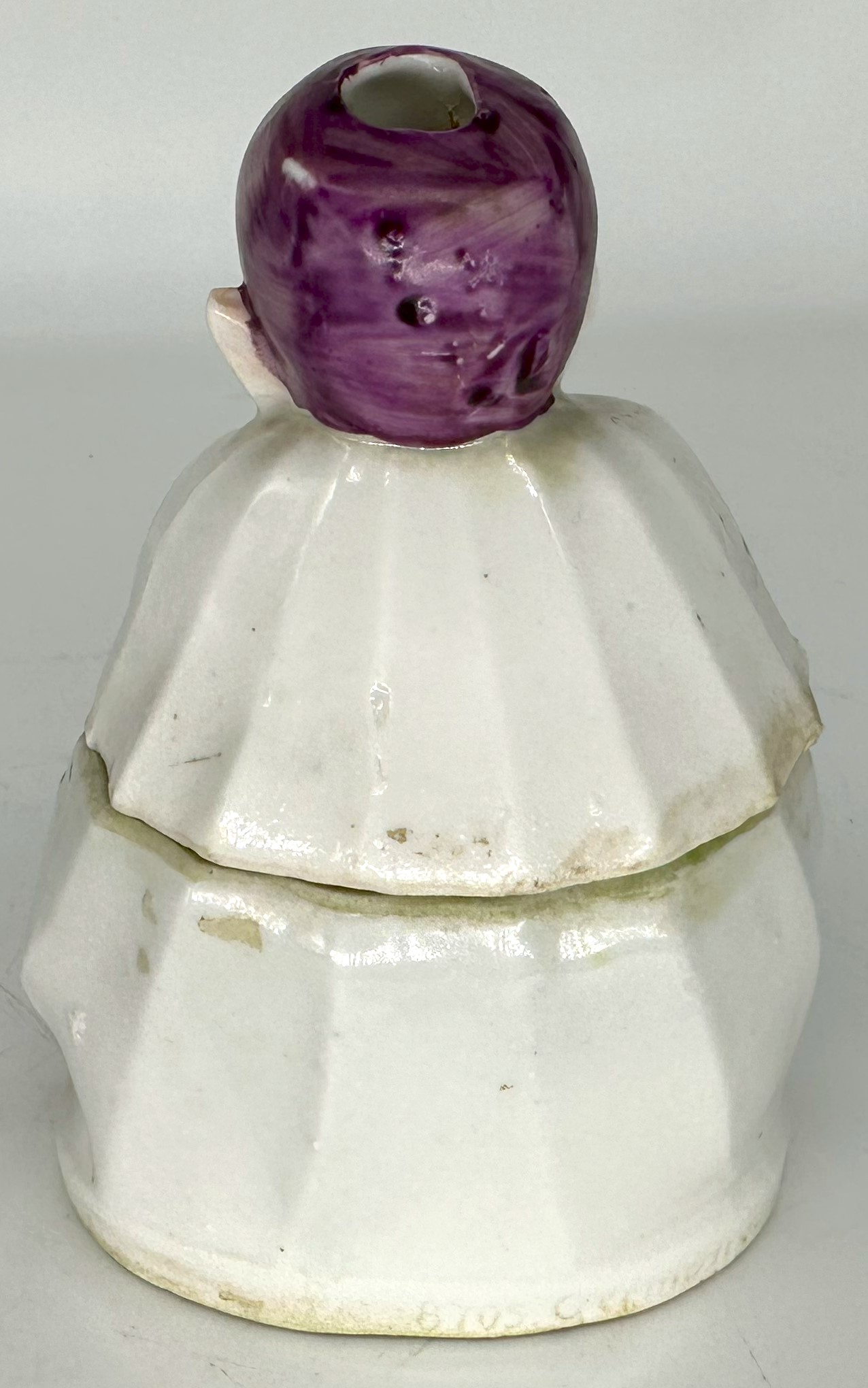 This inkwell is one of a series – cartoonish characters with bulbous bottoms and lift off top to reveal the ink pot. The head (top) has a hole to hold a pen. All were made in Germany.