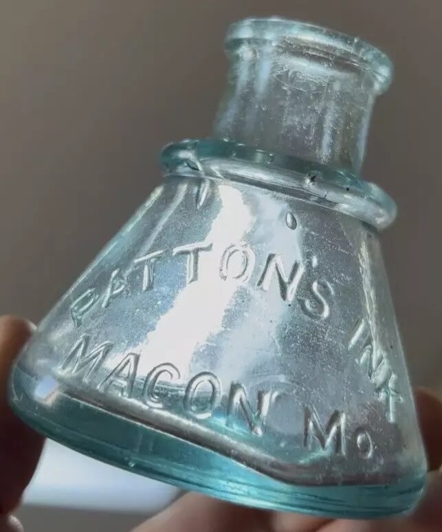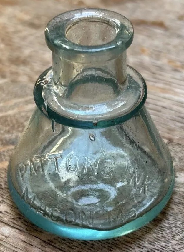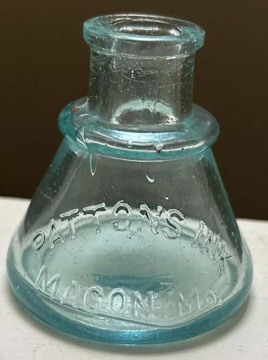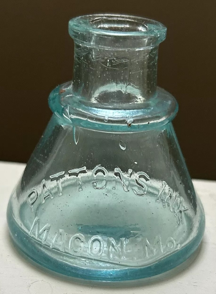 This conical aquamarine colored ink bottle is crudely mold-blown. The unevenly expanded side panel vary on thickness and have some light “whittle marks”, wavy glass swirls, suspended air bubbles. The front is embossed “PATTON’S INK – MACON MO”. The top of the bottle is crudely hand-tooled square collar that is enhanced with “toll divits” or tiny creases. The bottom is thick and slightly concaved. There is a small flake on the edge of the lip.