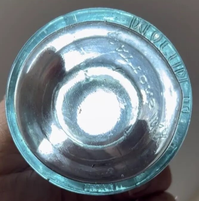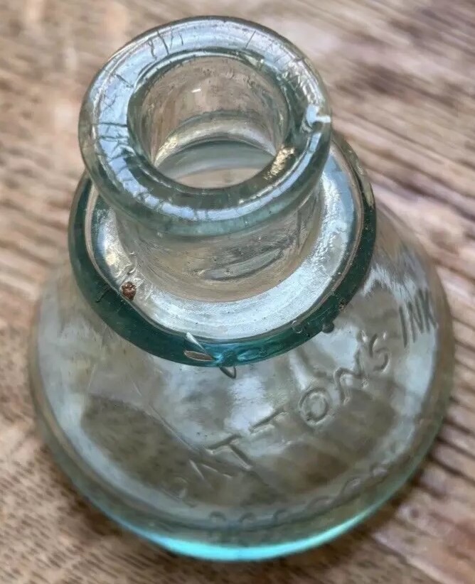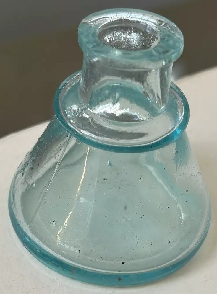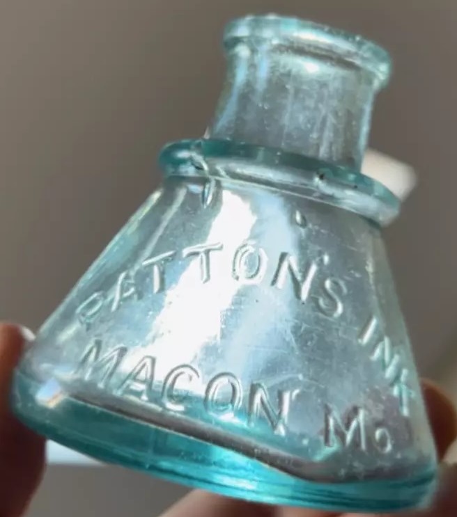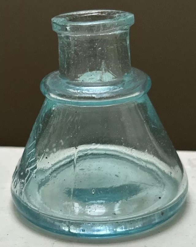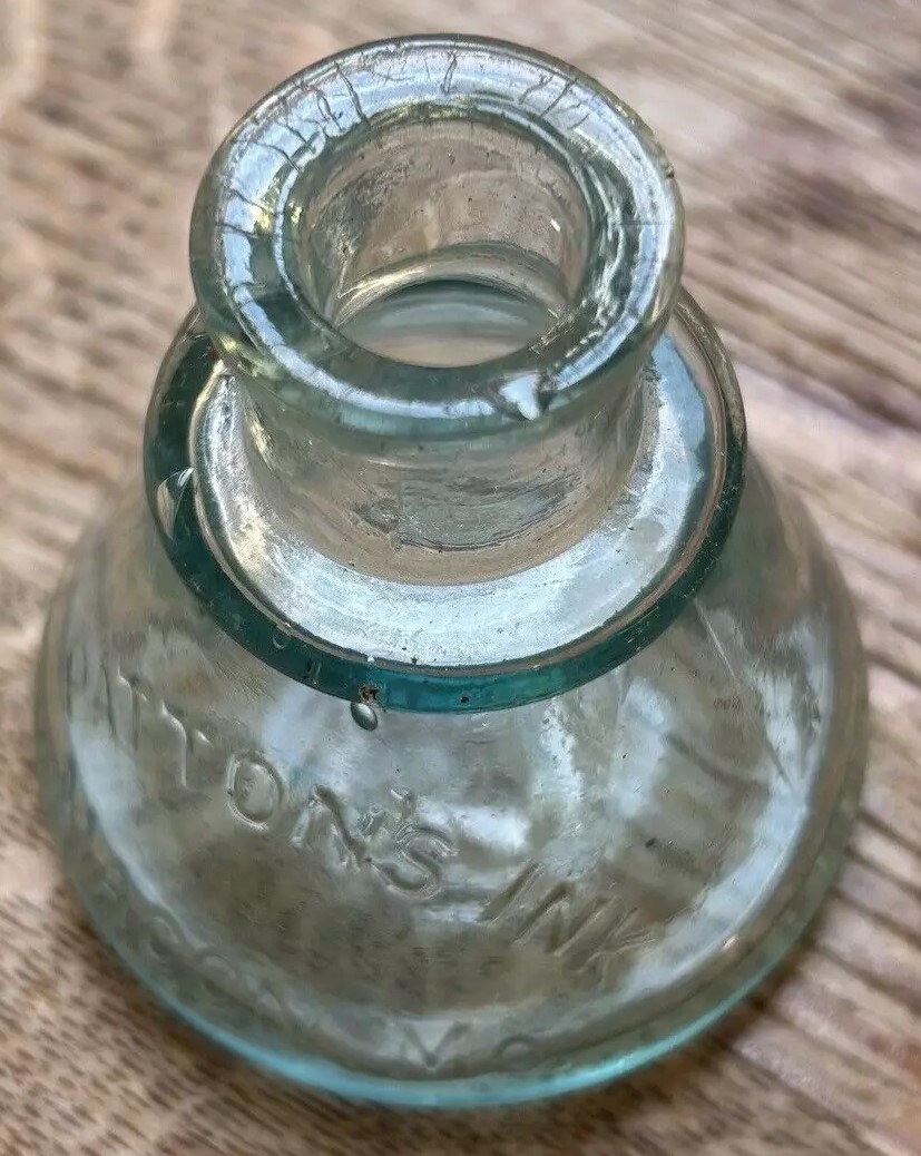 This conical aquamarine colored ink bottle is crudely mold-blown. The unevenly expanded side panel vary on thickness and have some light “whittle marks”, wavy glass swirls, suspended air bubbles. The front is embossed “PATTON’S INK – MACON MO”. The top of the bottle is crudely hand-tooled square collar that is enhanced with “toll divits” or tiny creases. The bottom is thick and slightly concaved. There is a small flake on the edge of the lip.