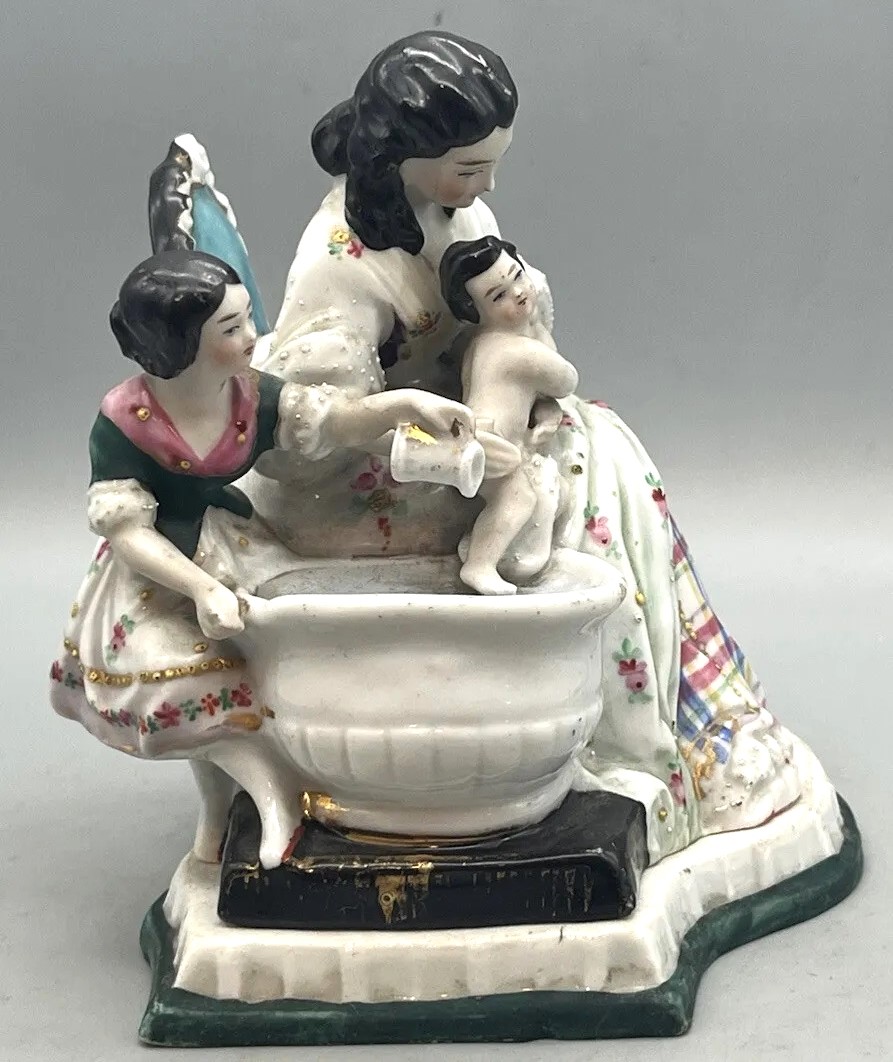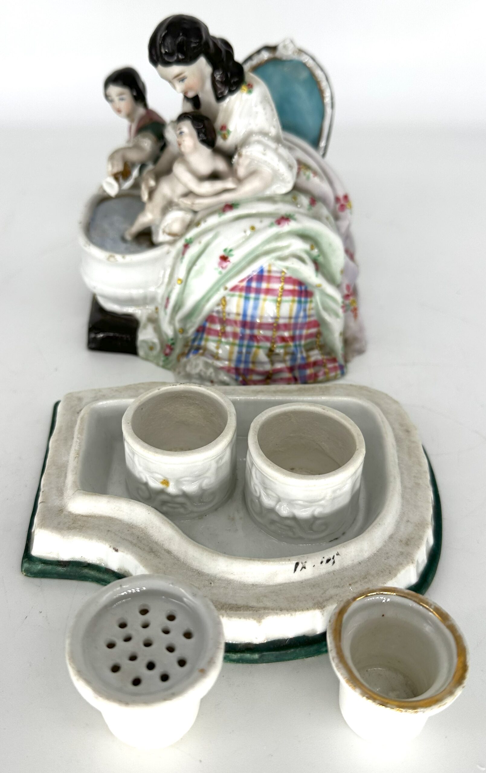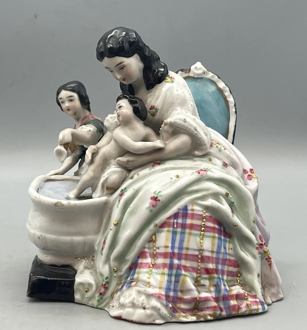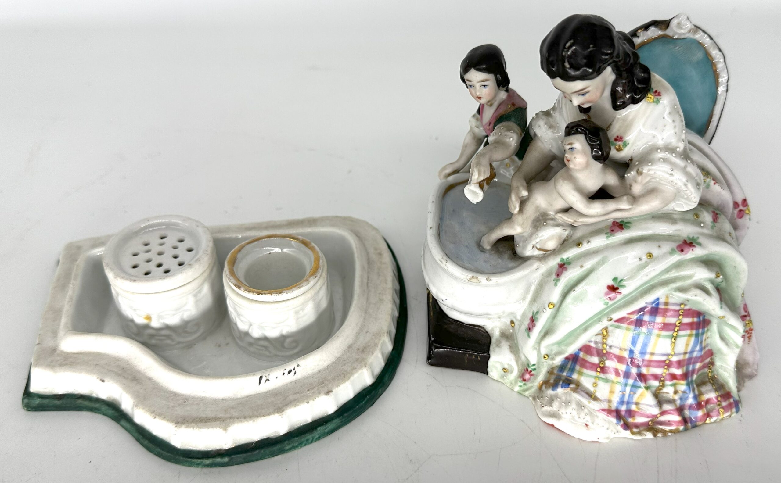 A mother and baby’s older sister giving baby a bath. The top lifts off to reveal an inkwell and sander.