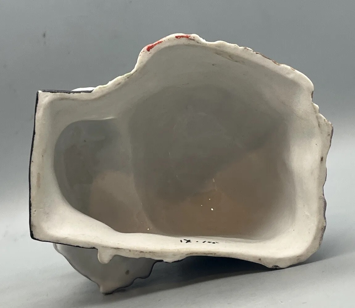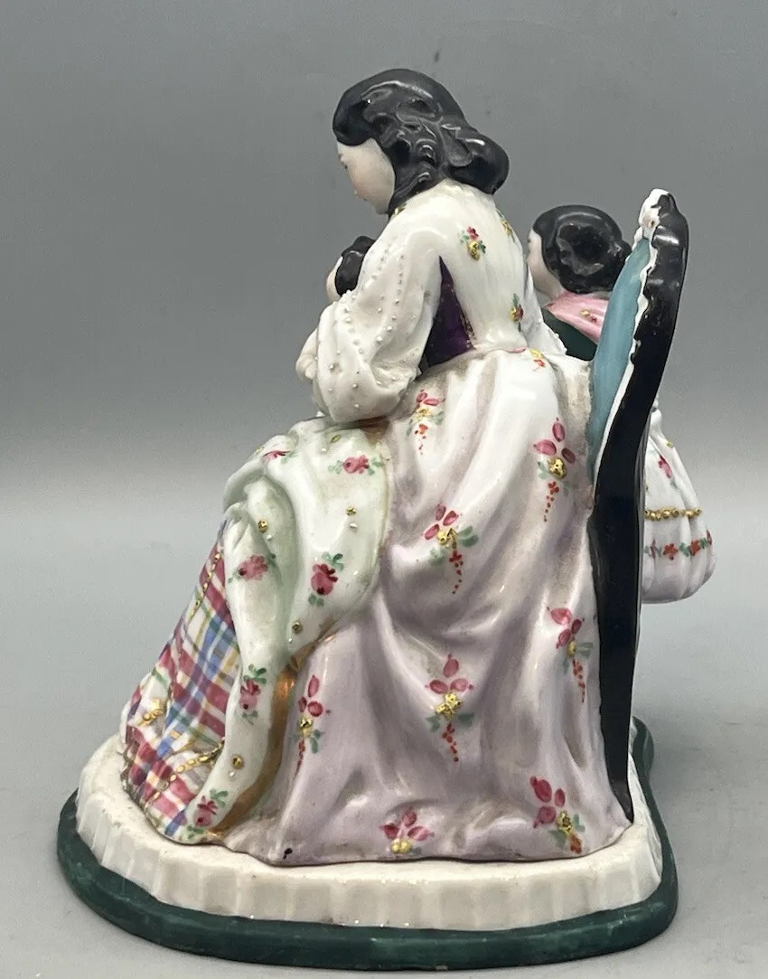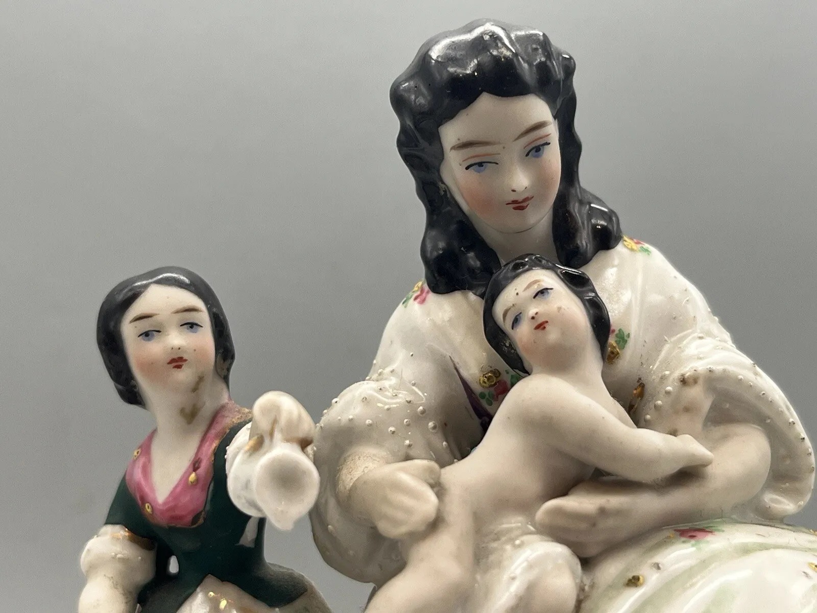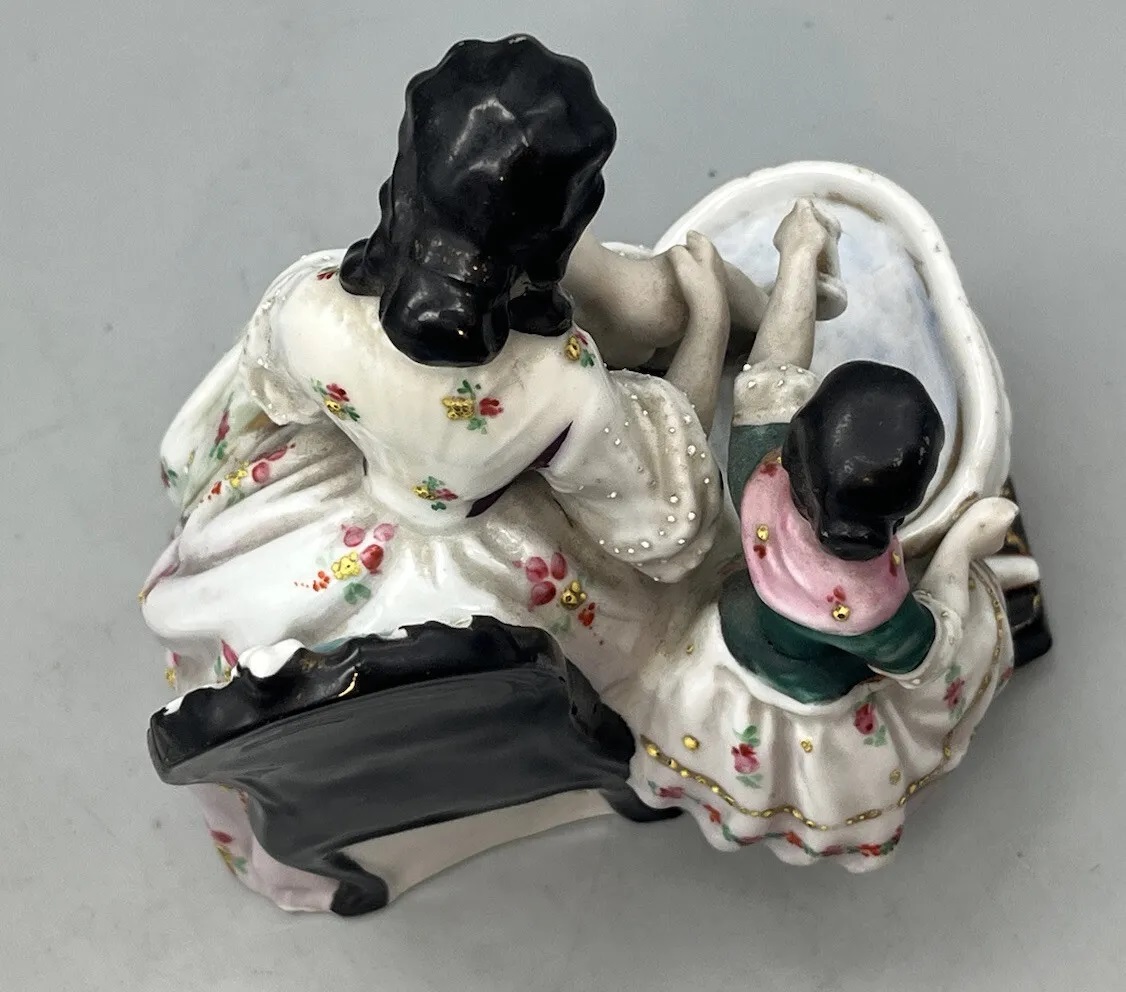 A mother and baby’s older sister giving baby a bath. The top lifts off to reveal an inkwell and sander.