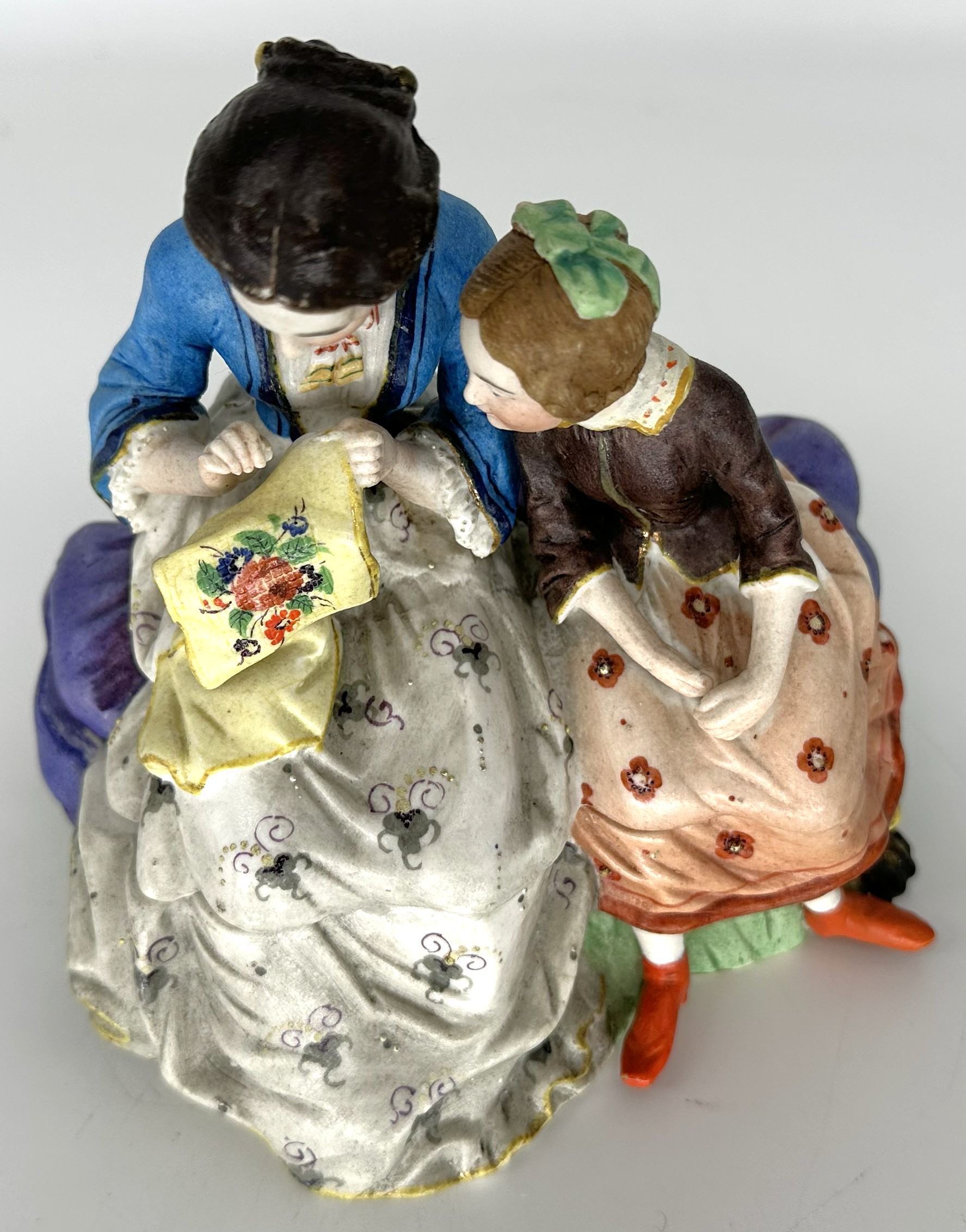 - Clothing Texture: The figures’ clothing is painted to define folds and borders. The mother’s dress and the settee are painted in deep tones (e.g., maroon, dark blue, or brown) to simulate rich, heavy fabric, contrasting with the stark white of the bisque.