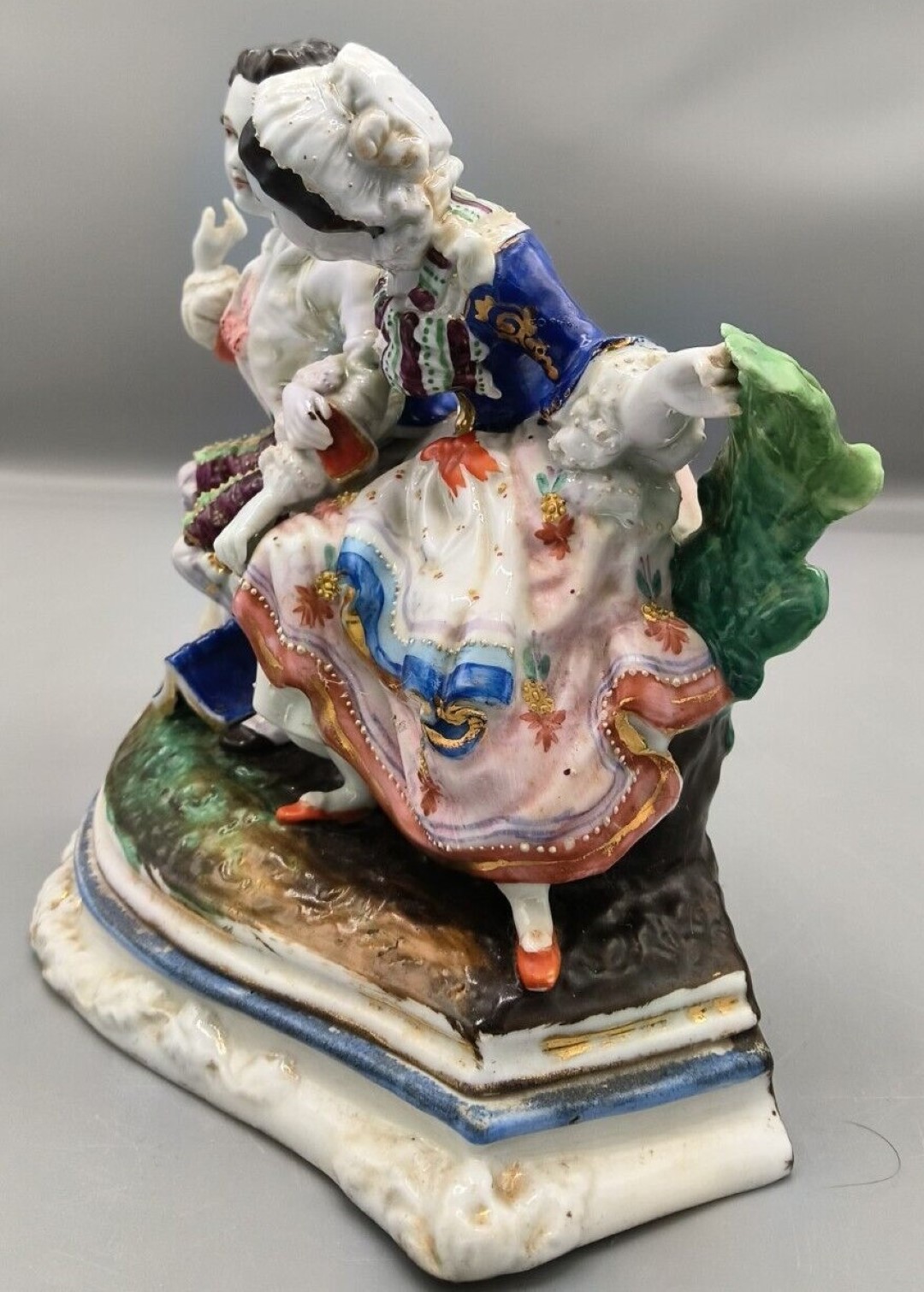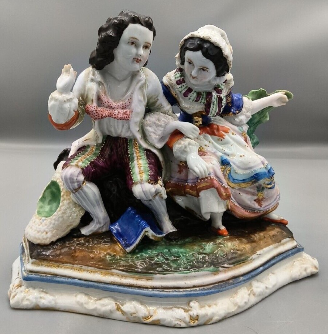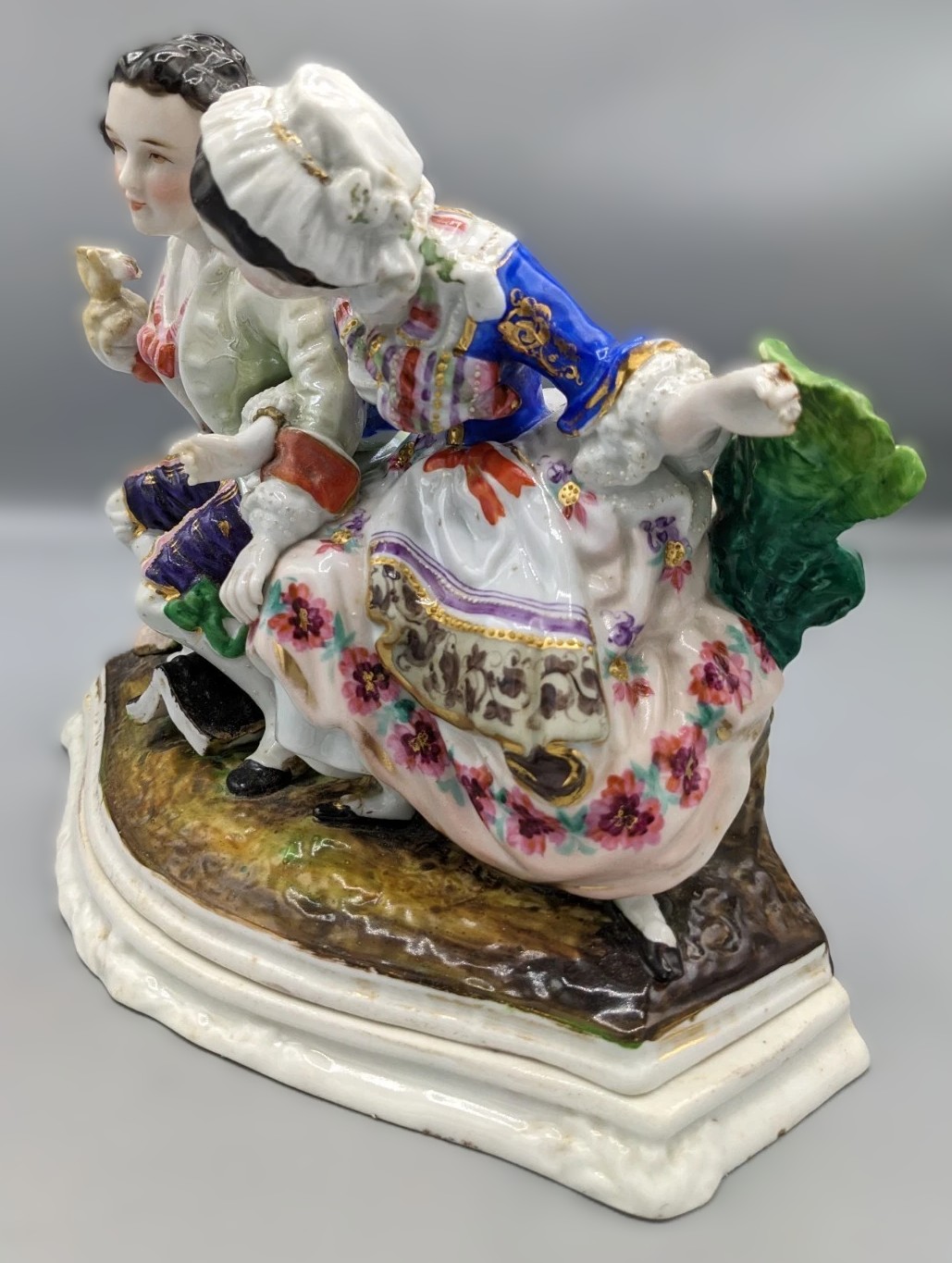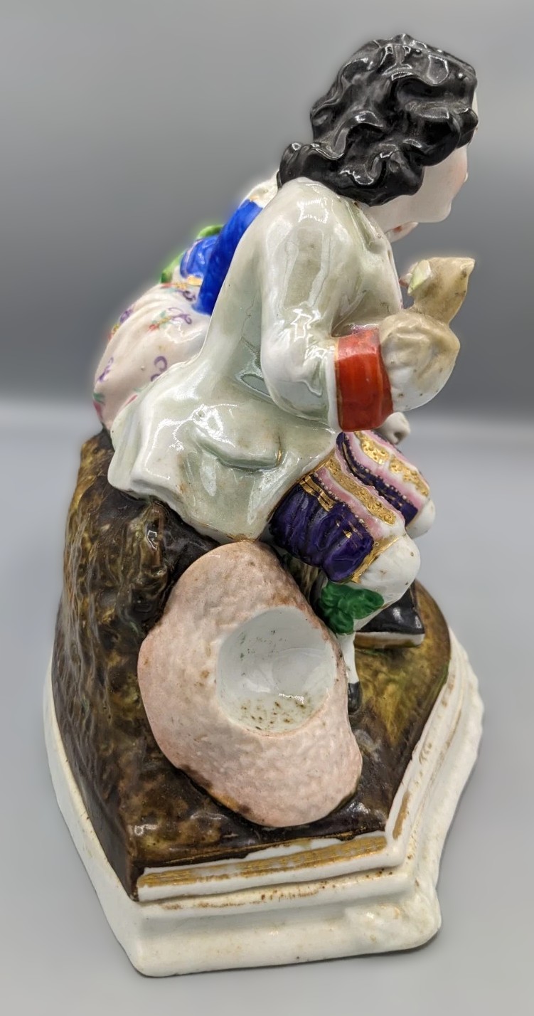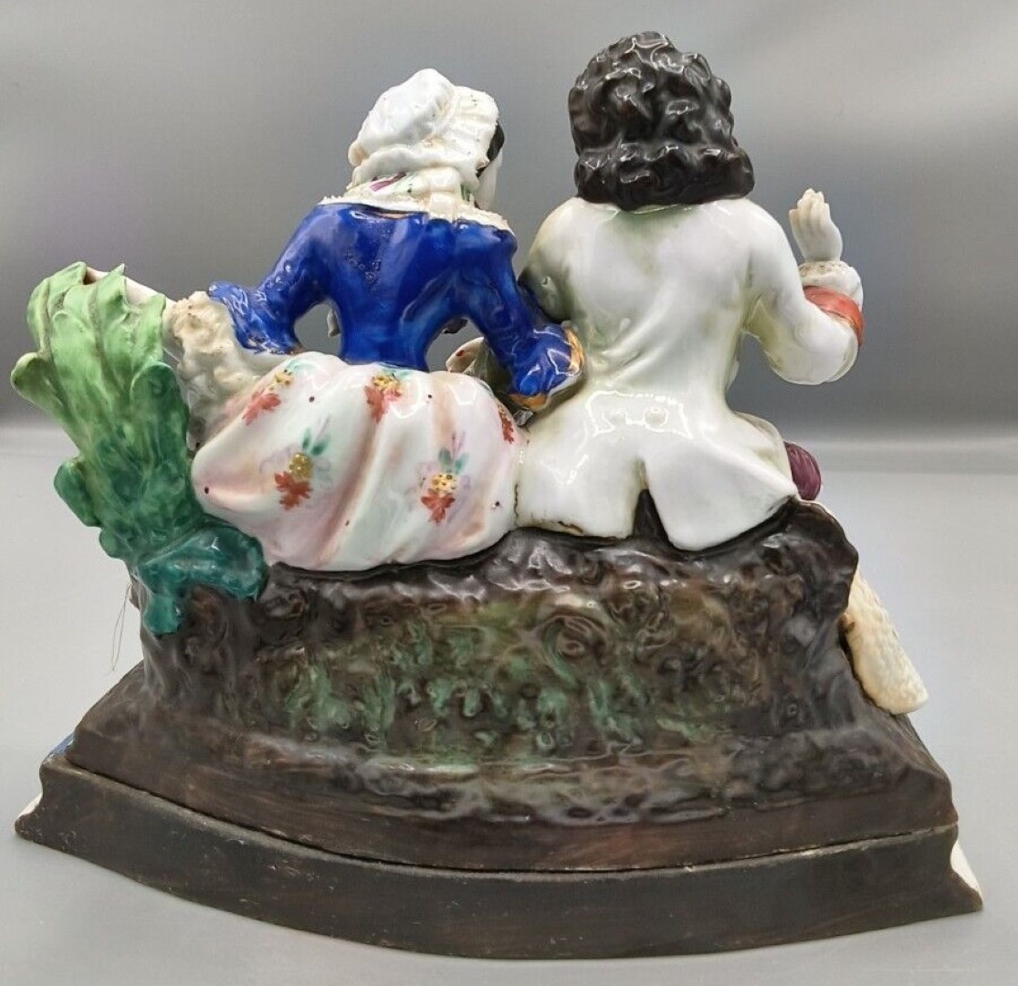 The porcelain group depicts a classic 18th-century “Gallant and Lady” scene, likely a moment of courtship in a pastoral setting.