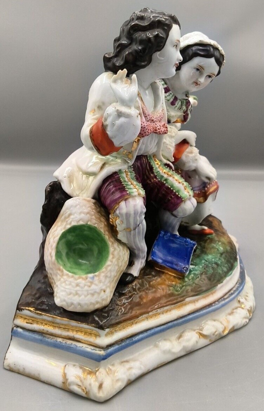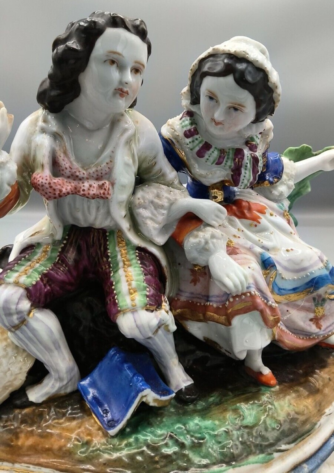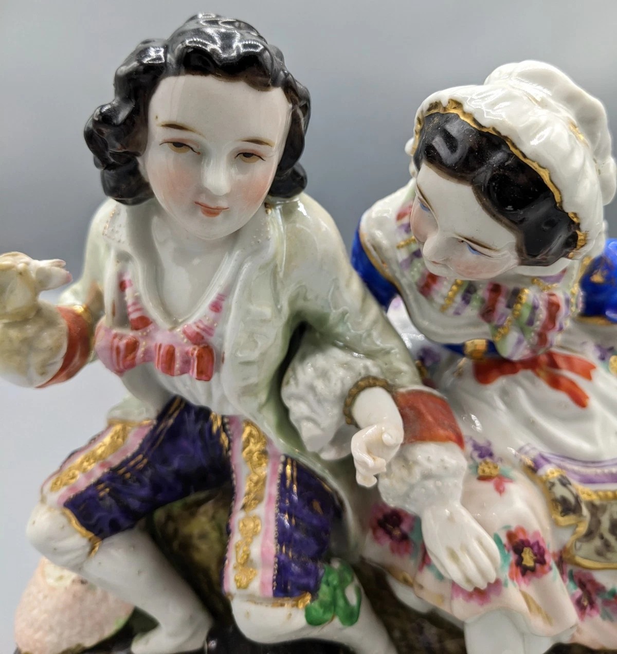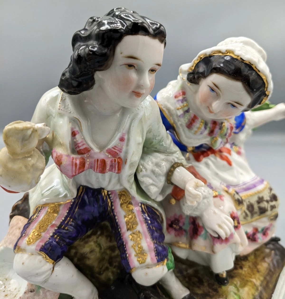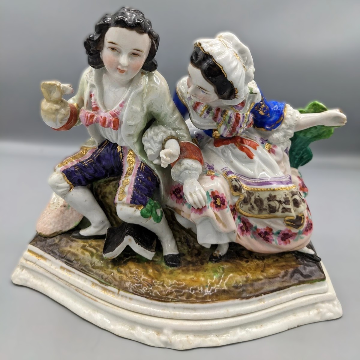 The porcelain group depicts a classic 18th-century “Gallant and Lady” scene, likely a moment of courtship in a pastoral setting.
