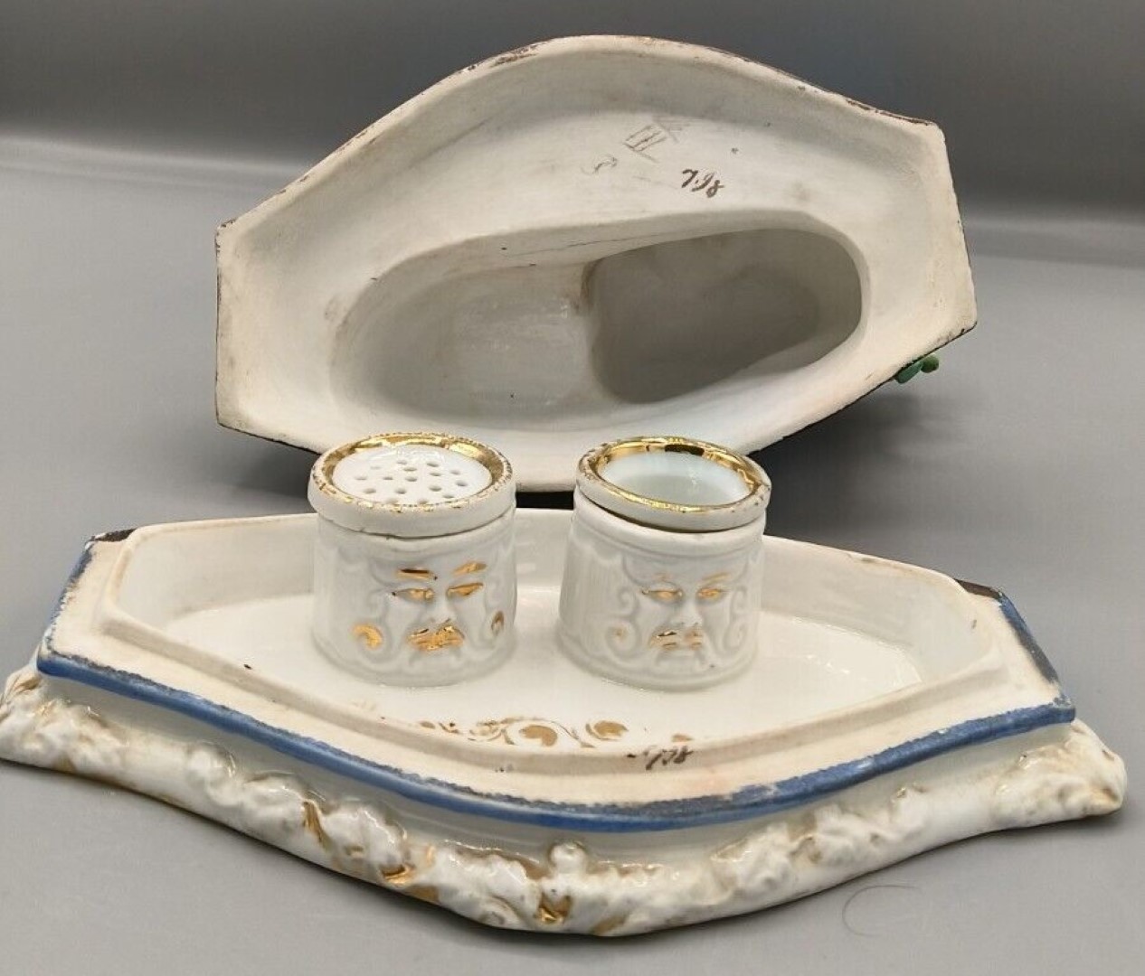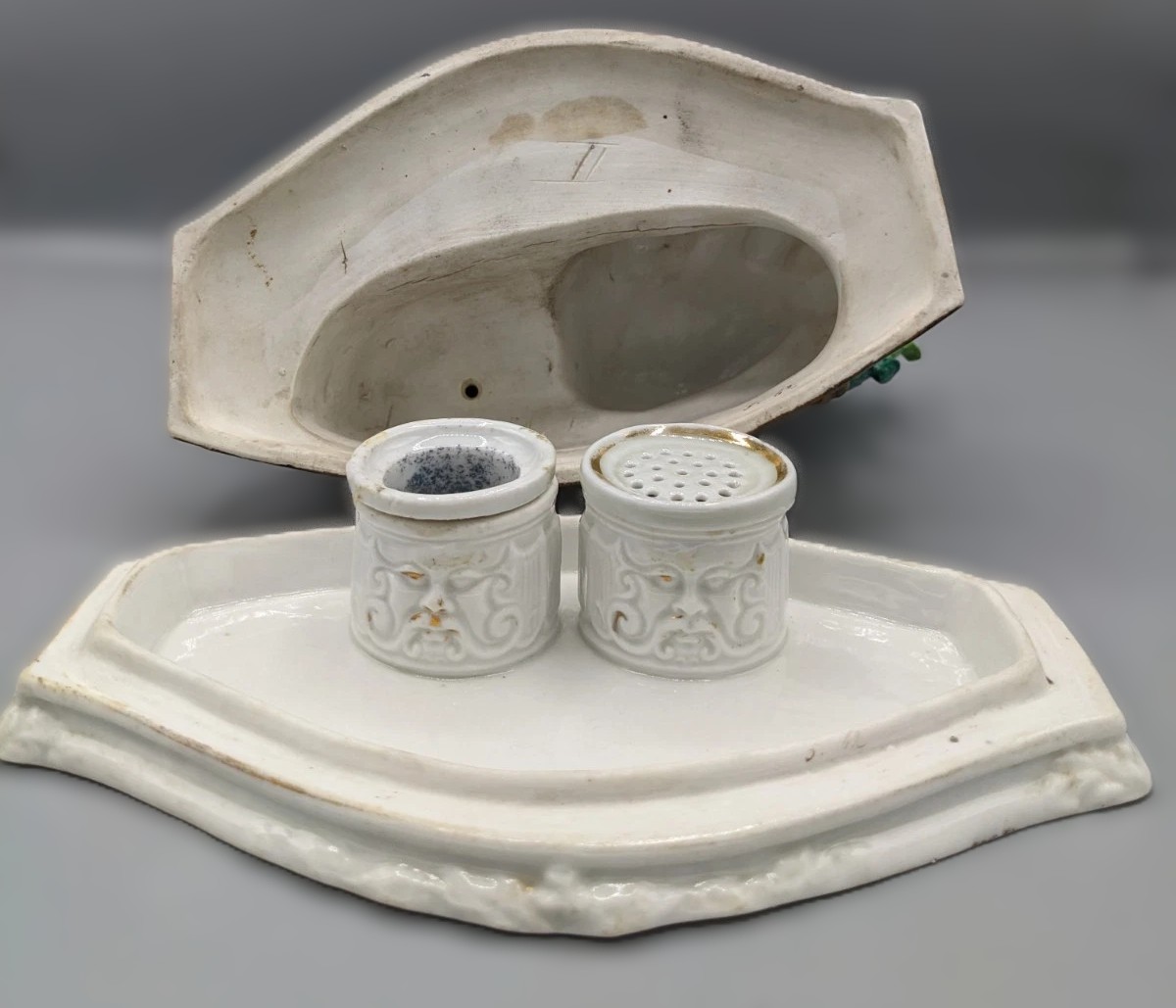 • Inkwell & Sander: The Inkwell (Left): A removable porcelain cup that shows slight blue staining inside from historical use.