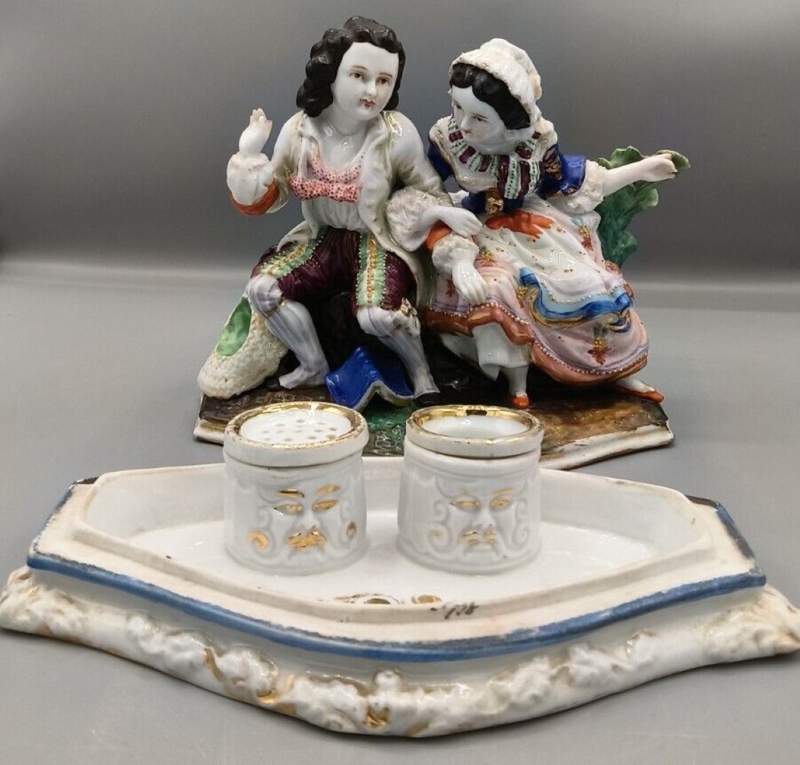 The figural group serves as a decorative lid. When lifted, it reveals a white porcelain base designed to hold two essential writing tools: