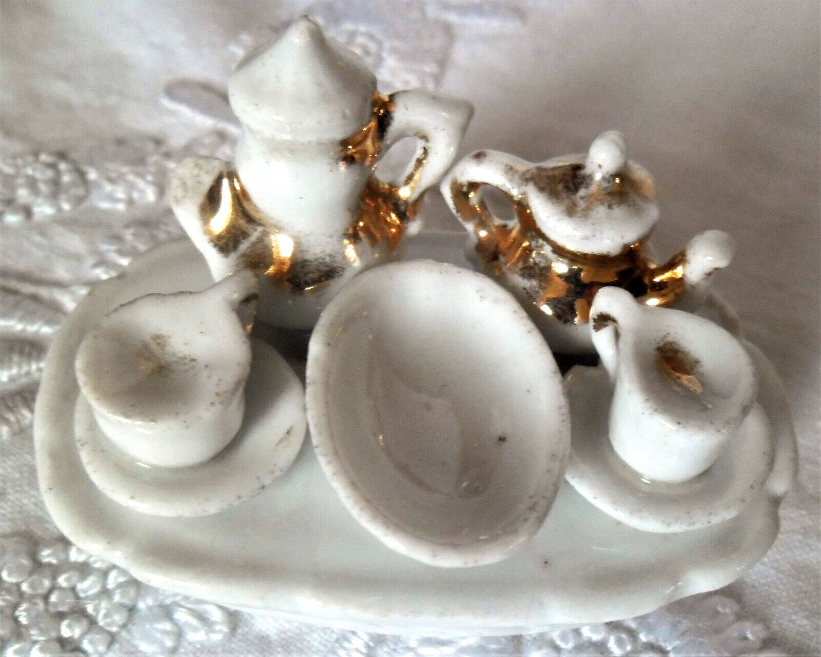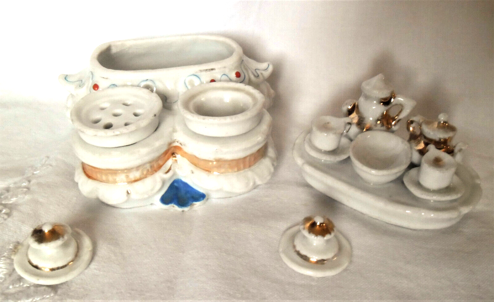 Small porcelain inkstand from Conta & Boehme featuring a tea service covering a trinket box. In front are two lidded pots – one for the ink, the other a sander. Model #3202.