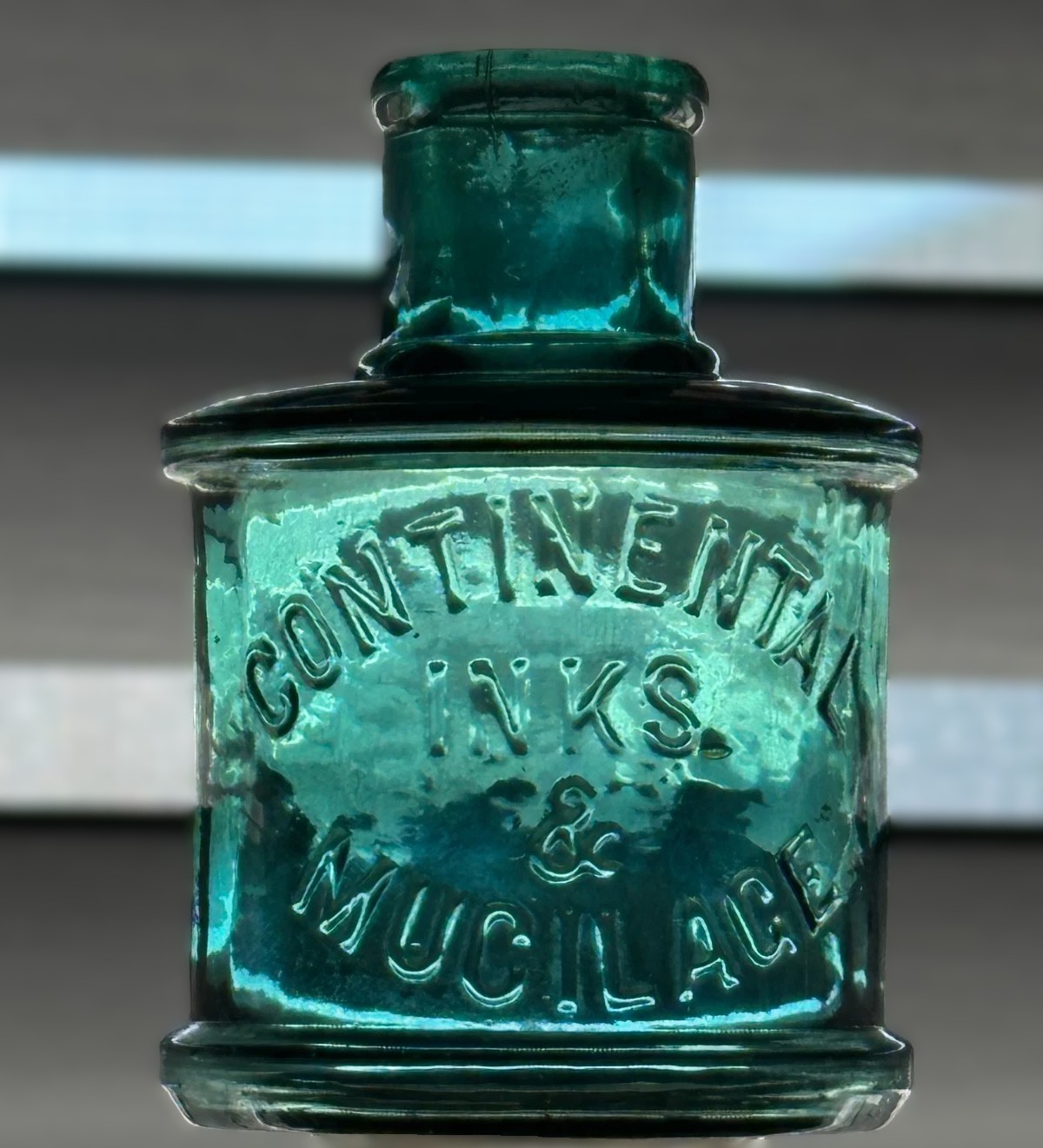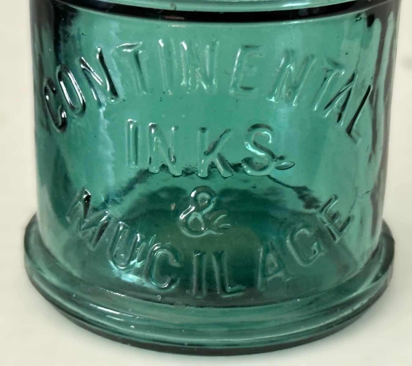 • Text: The bottle is boldly embossed on the front: “CONTINENTAL / INKS / & / MUCILAGE”.