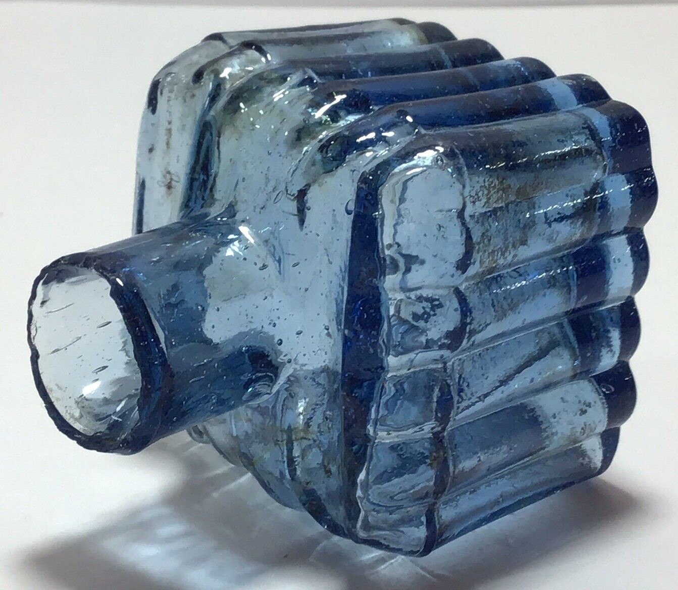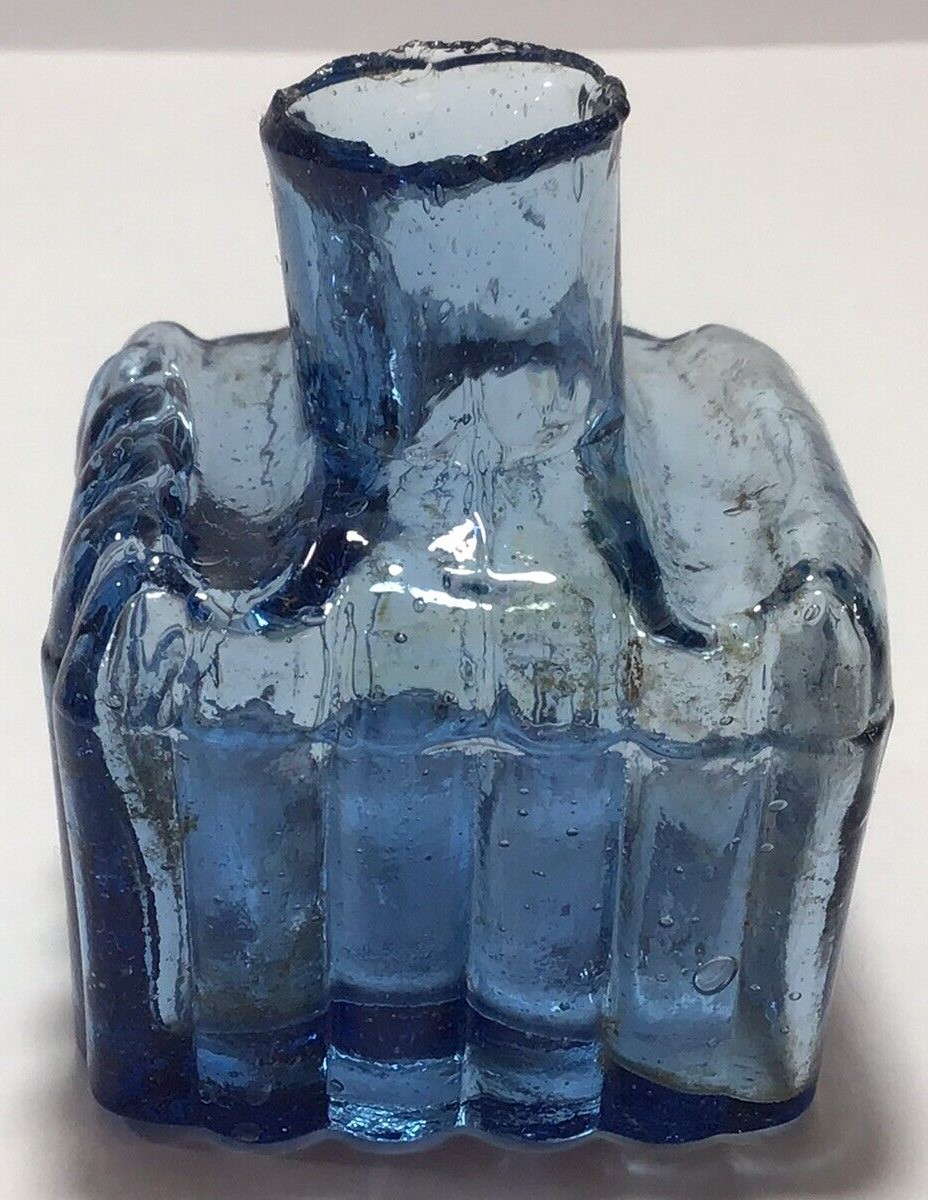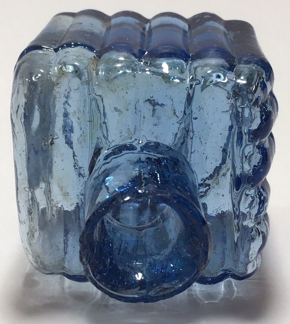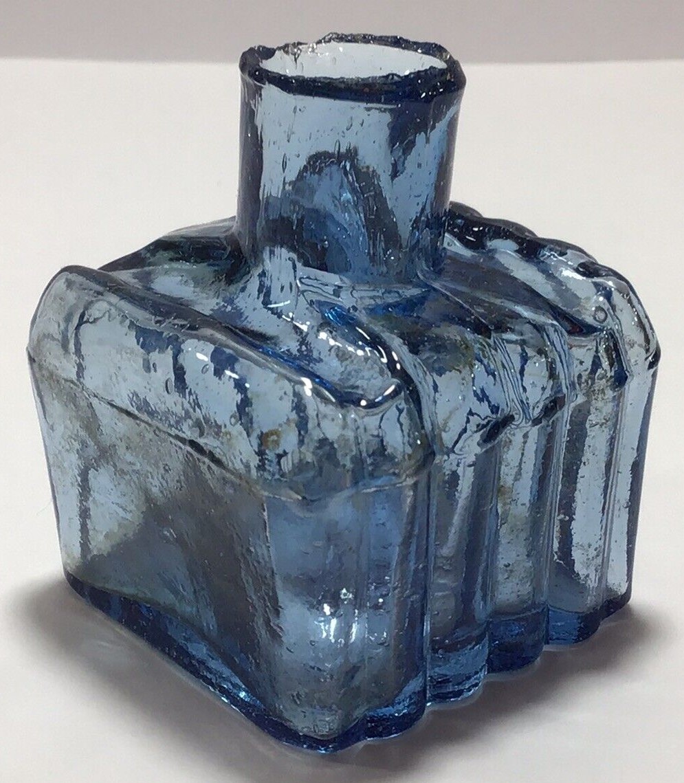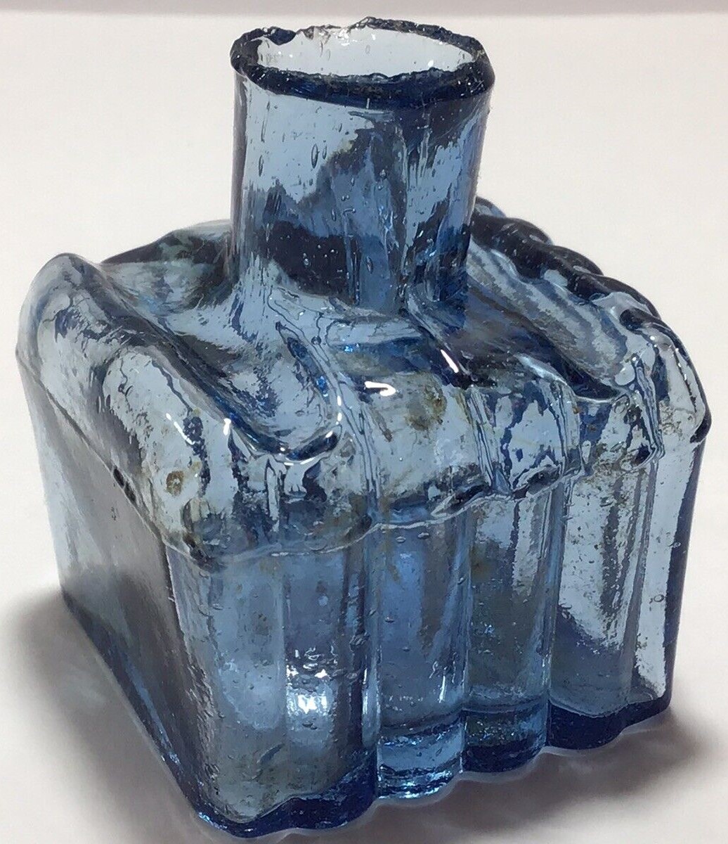 This copper blue ink bottle is square shaped with three ribbed sides and two pen rests on the top. It has a crude neck with sheared lip, and tiny seeds and bubbles to the body.