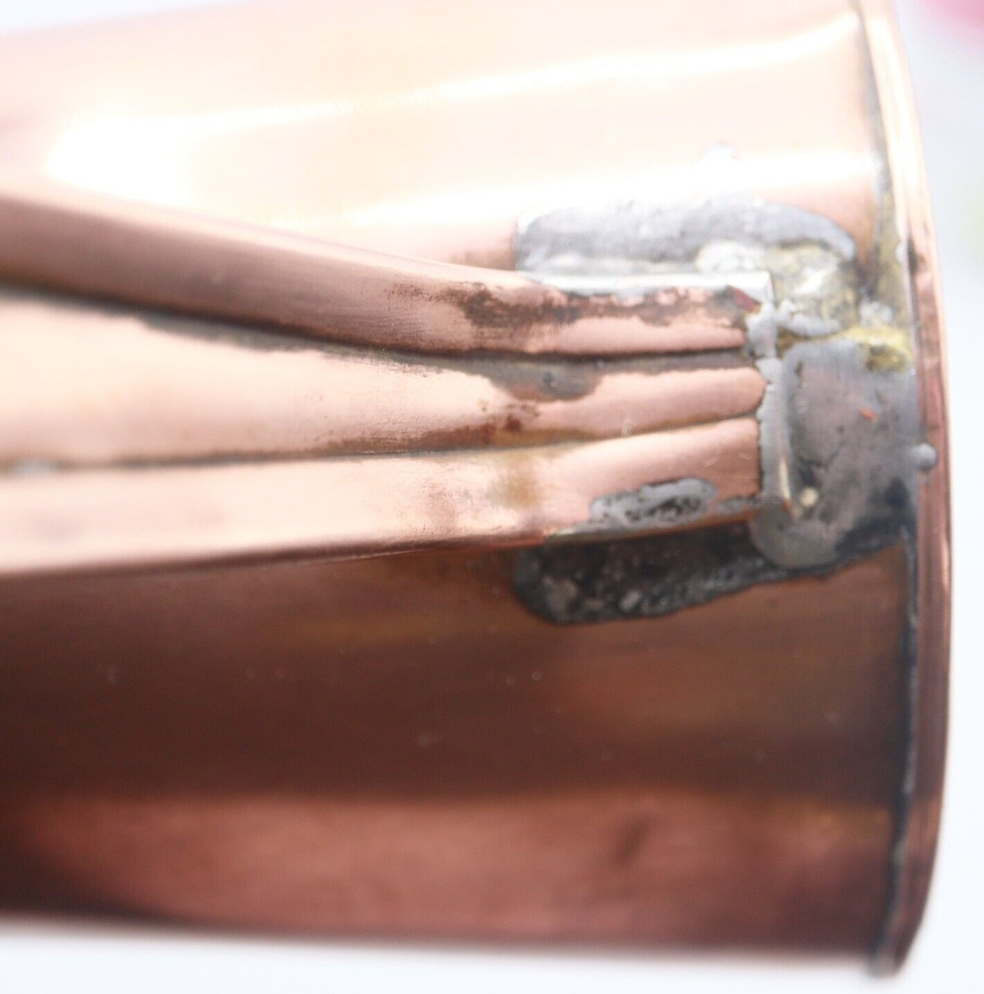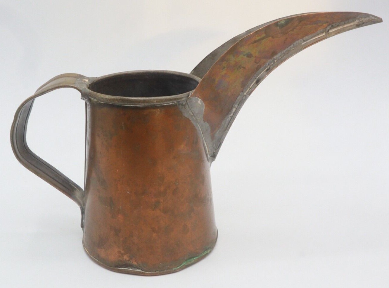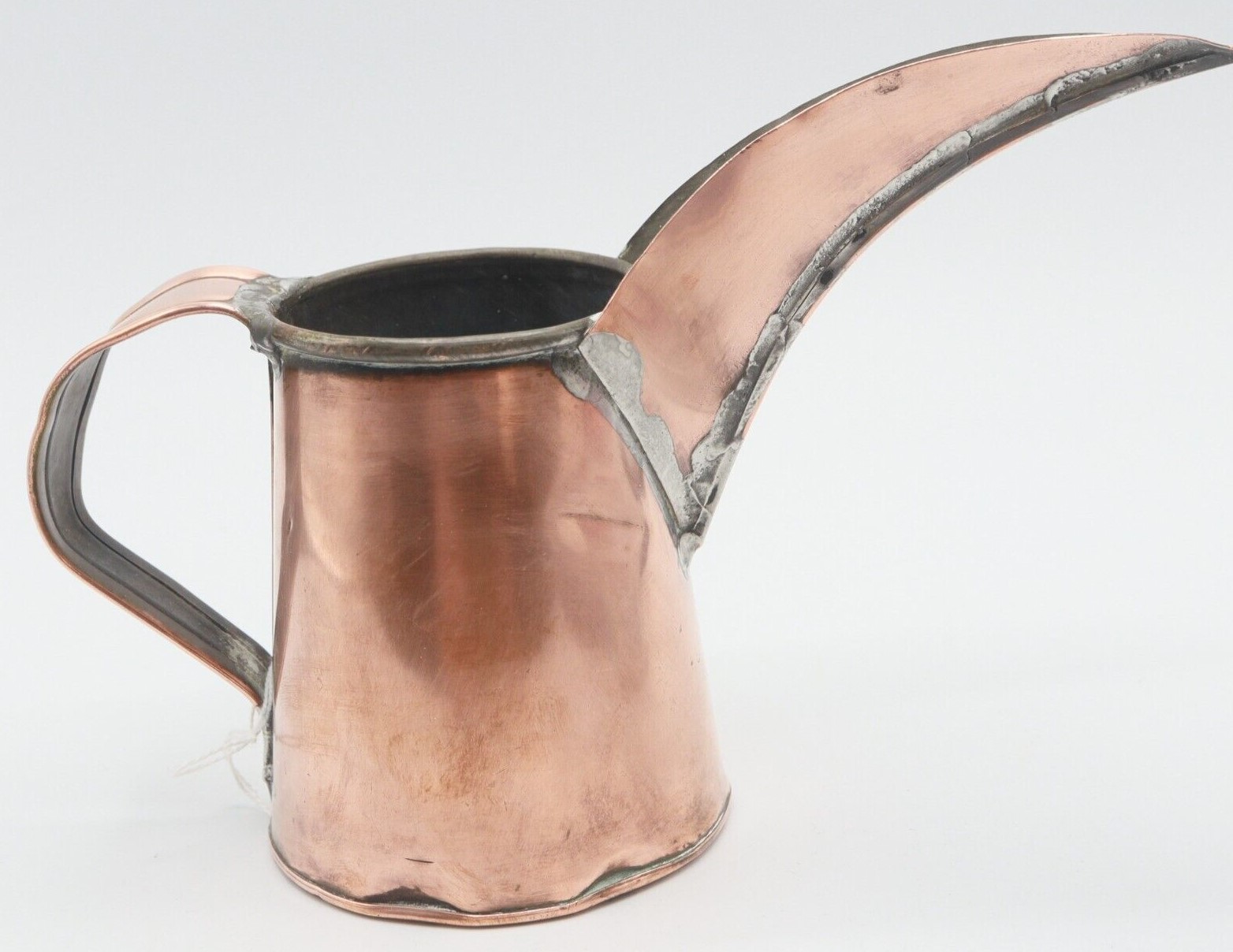 1800s primitive copper inkwell filler. It has a long spout, is flat bottomed, hand hammered, heavy solder seams. Likely dates to the Civil War era. Cleaned and polished, the last picture shows what it looked like before it was polished.