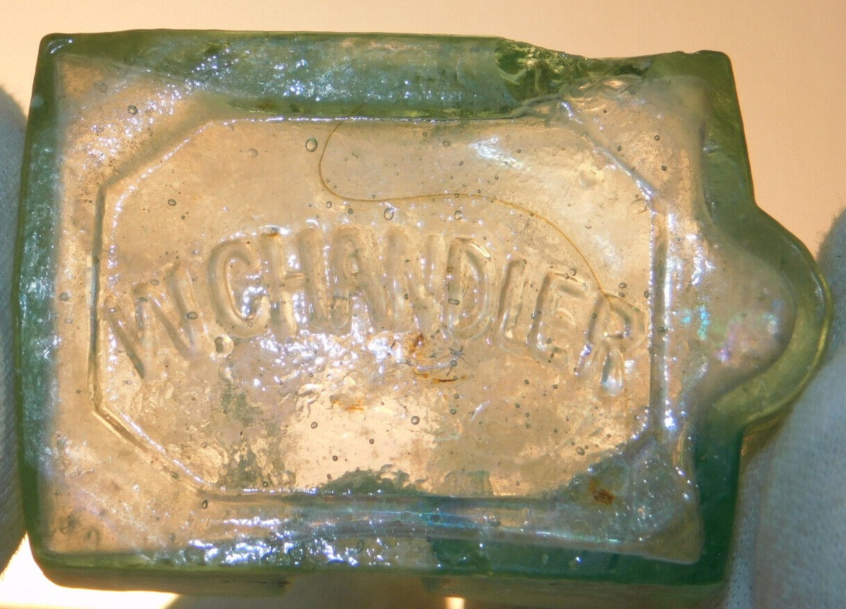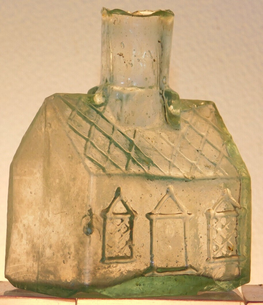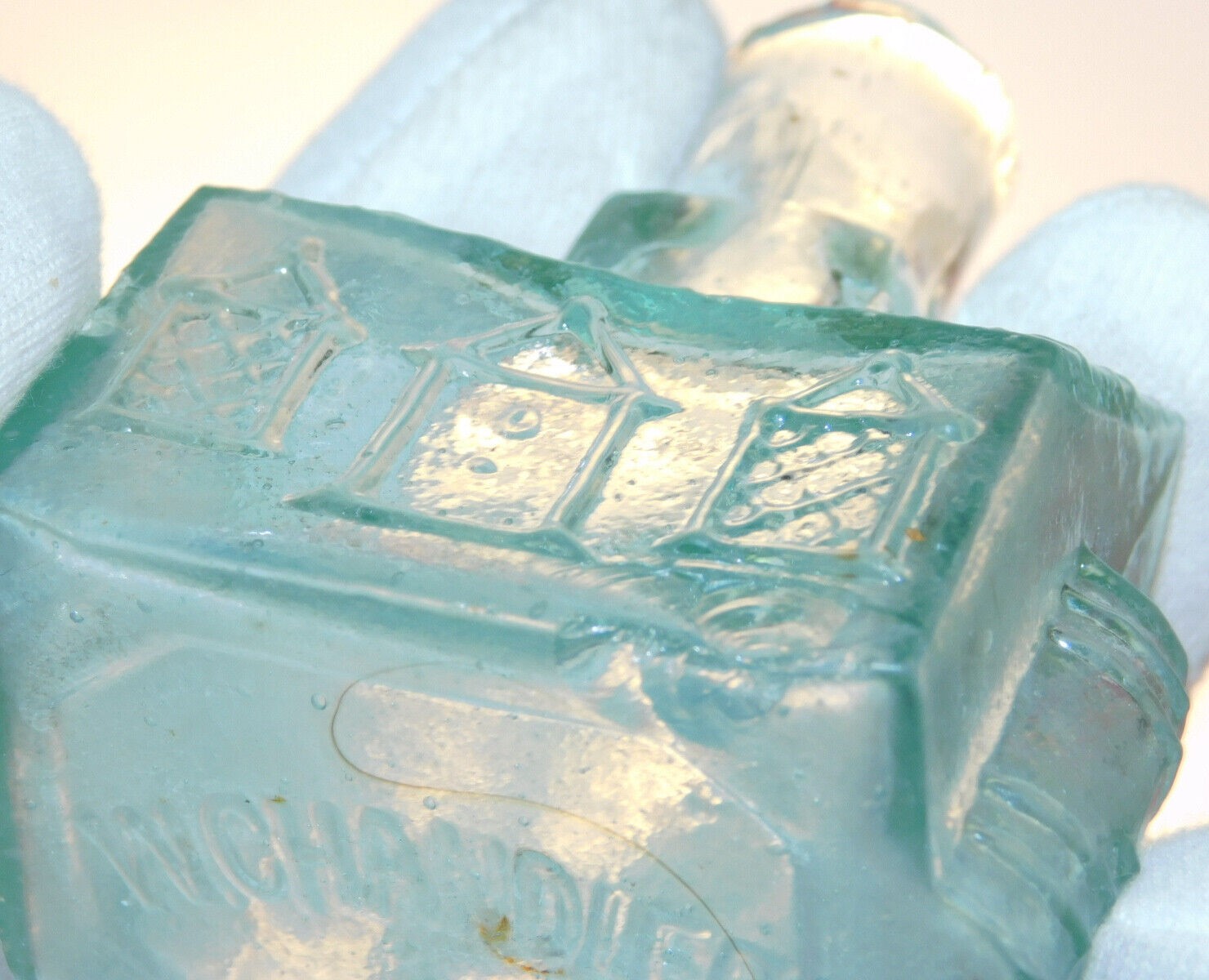 A cottage ink bottle with a diamond tiled roof and diamond lattice windows. There is a water tank on the side. Ornate windows and a tiny peep window on the front door. Embossed on the bottom “W. Chandler”.
