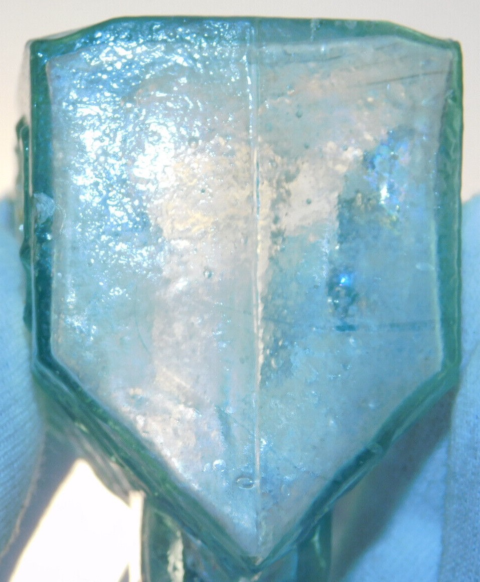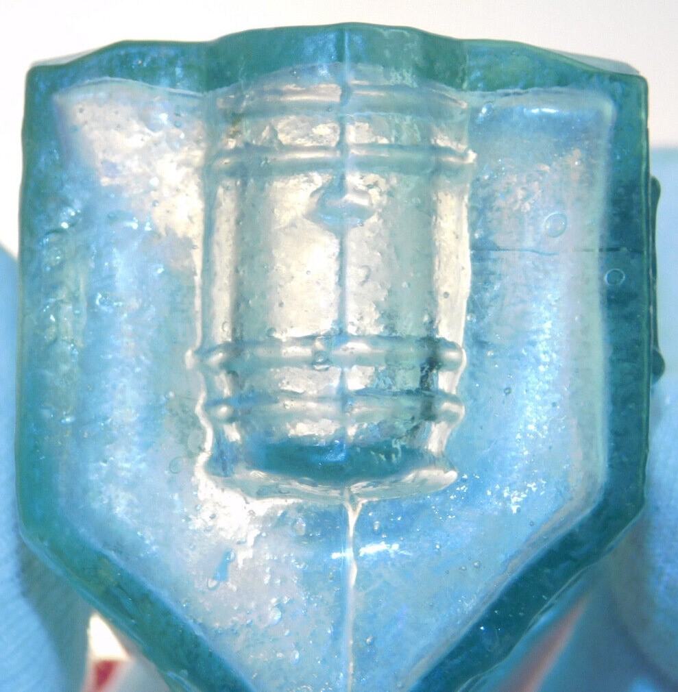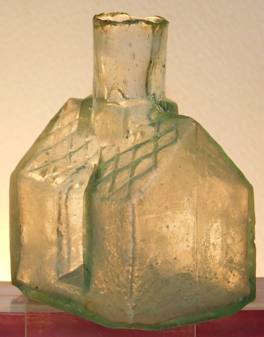 A cottage ink bottle with a diamond tiled roof and diamond lattice windows. There is a water tank on the side. Ornate windows and a tiny peep window on the front door. Embossed on the bottom “W. Chandler”.