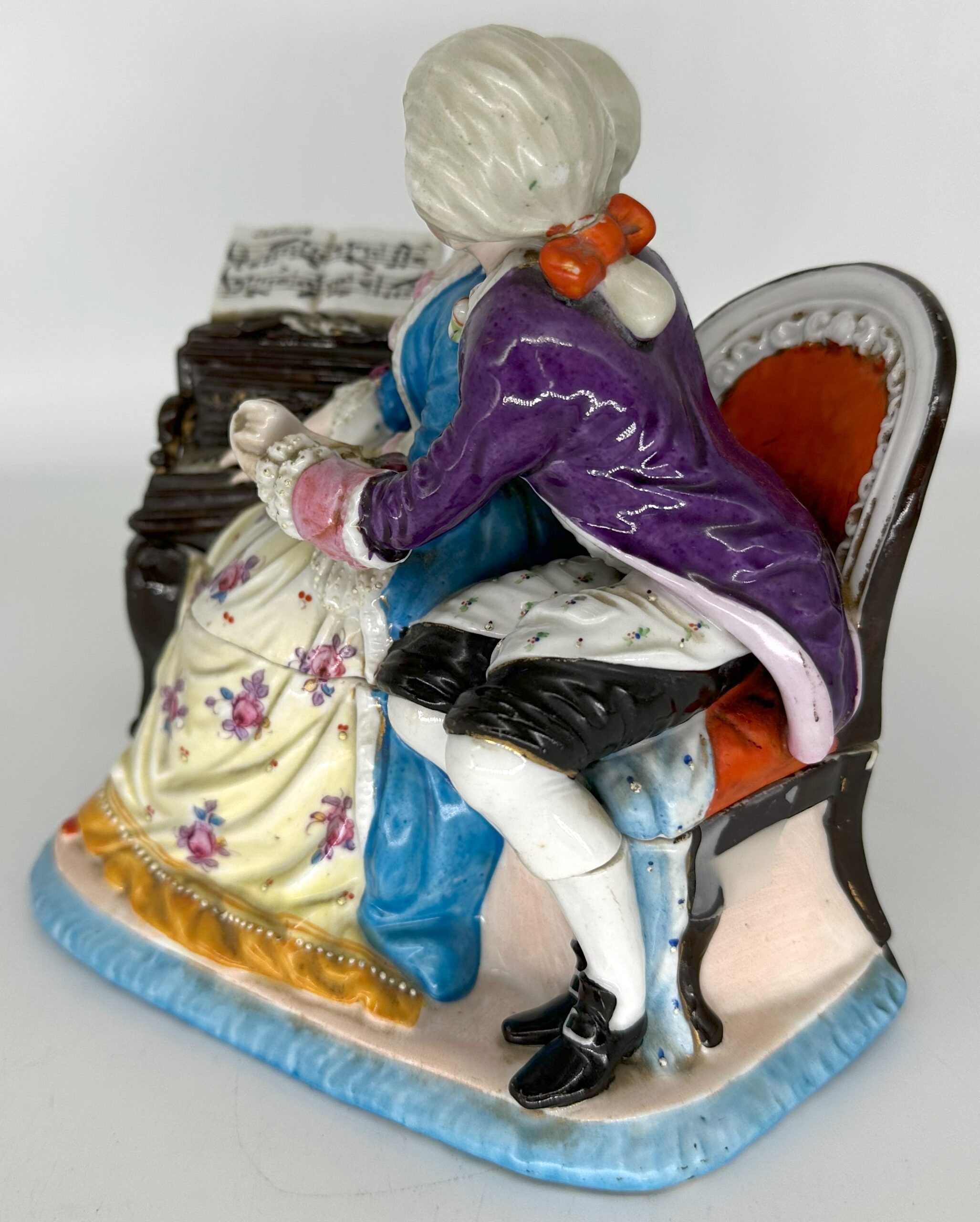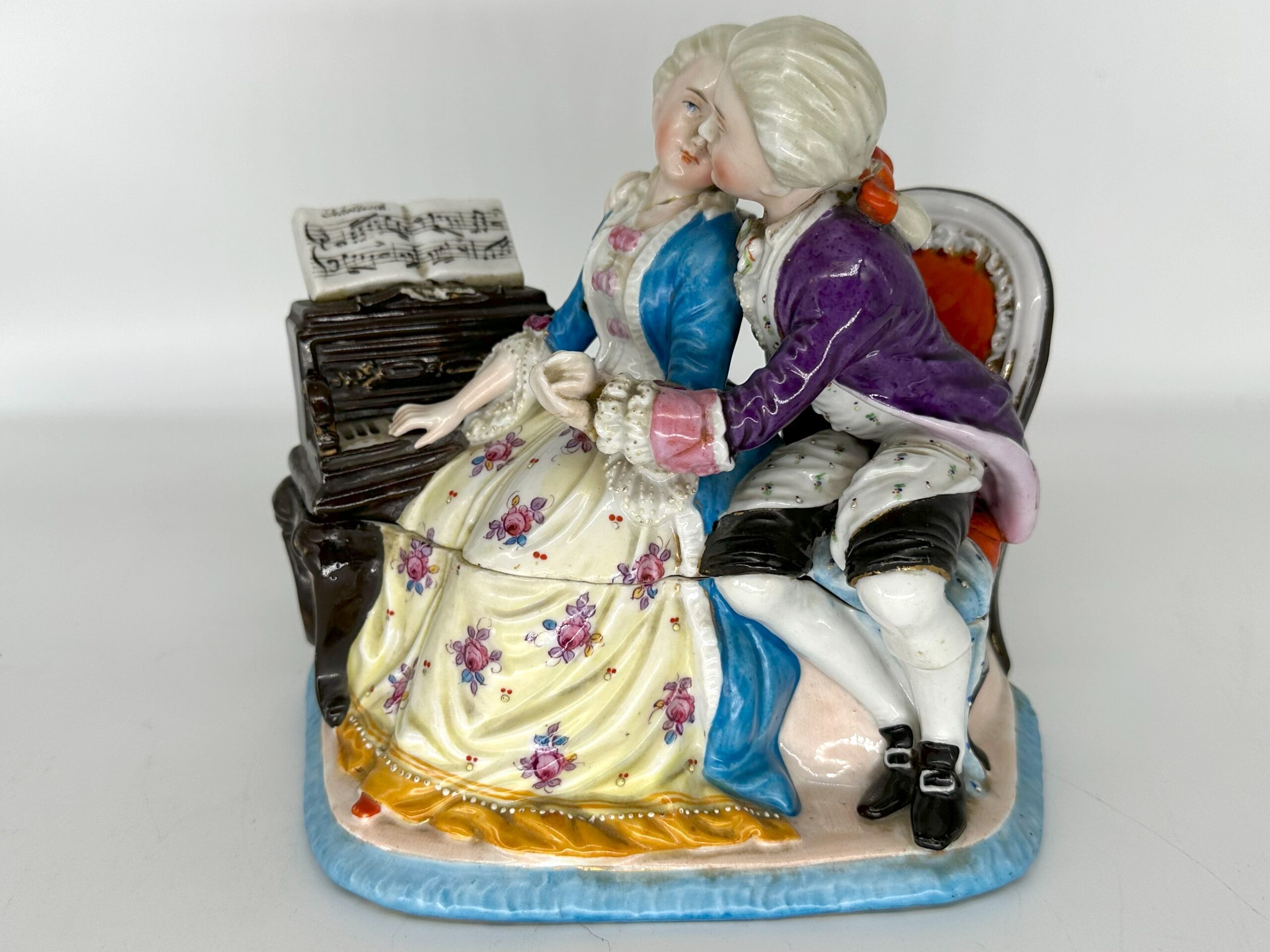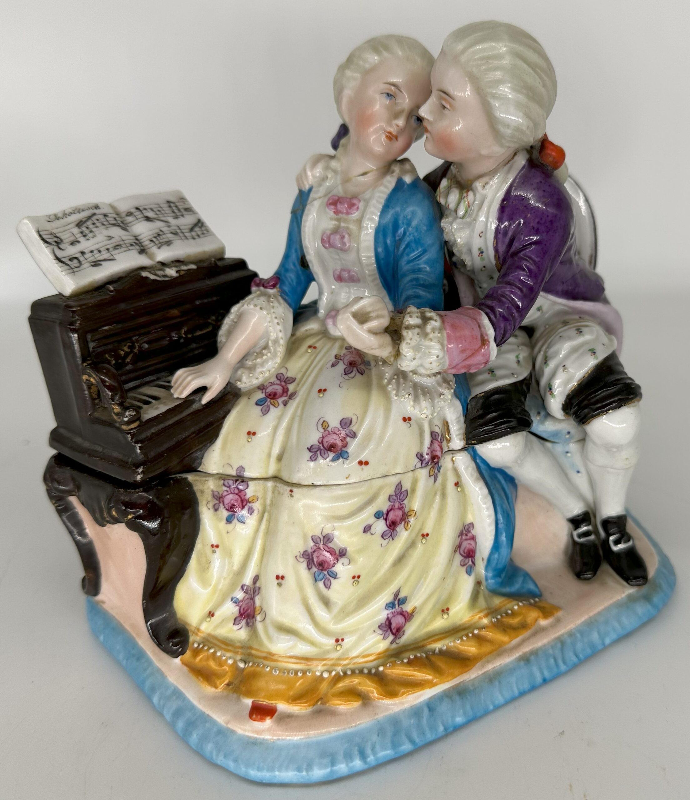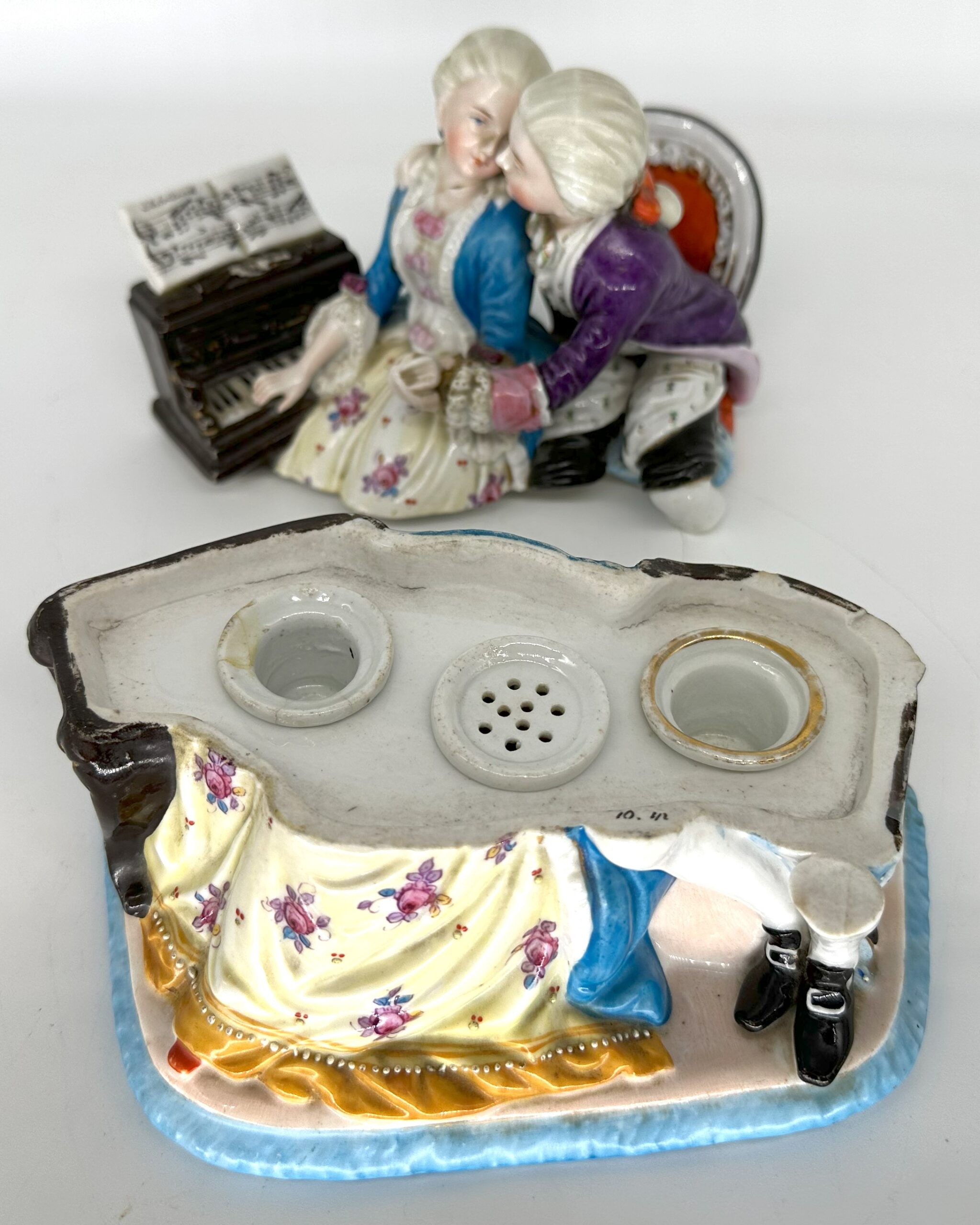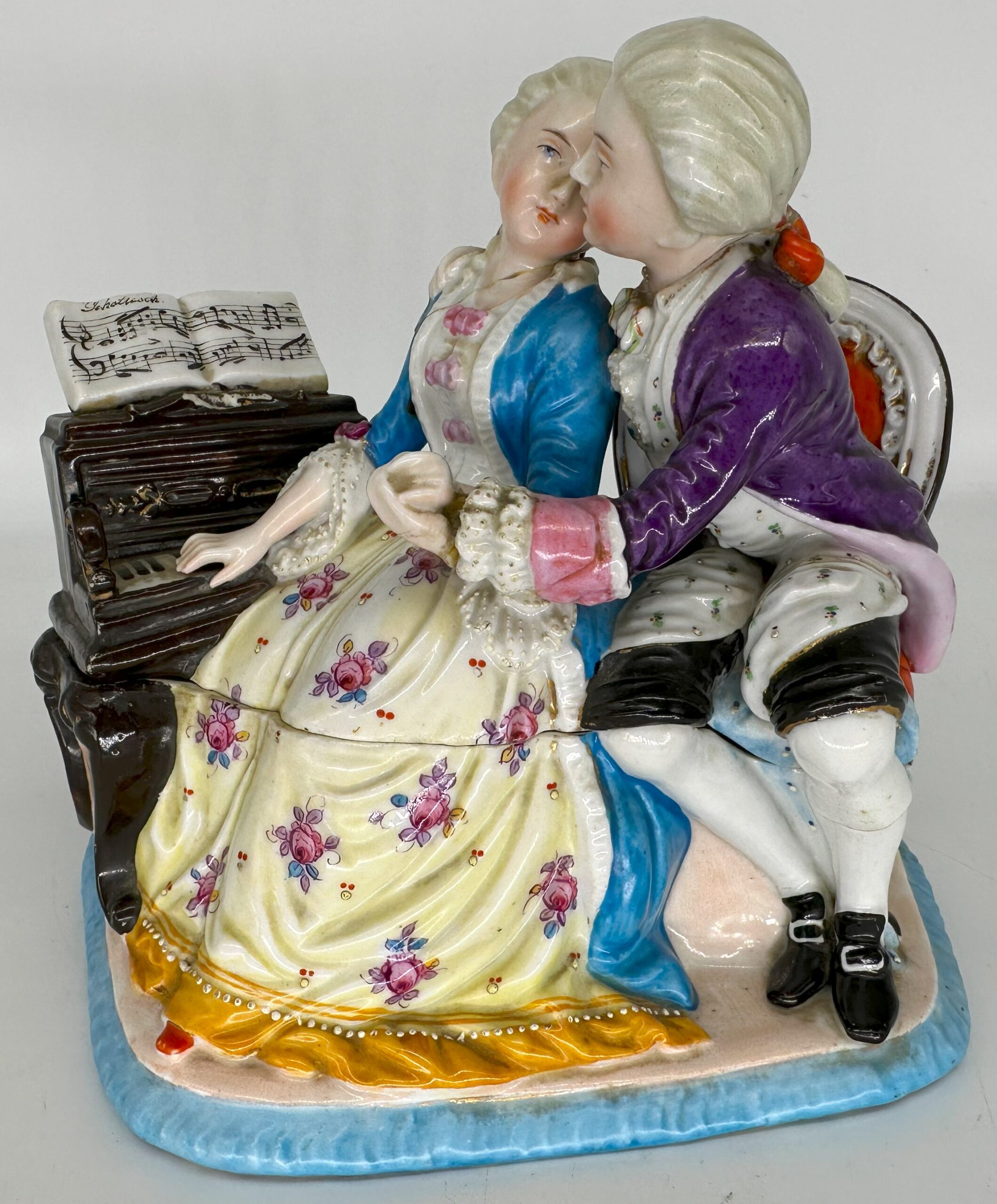 A woman is seated at a harpsichord (piano), her hands poised as if playing. Beside her sits a man with his arm affectionately around her shoulder. The inkstand is molded and hand-painted in detail. The woman wears a dress with intricate floral patterns and beading. The gentleman wears knee-length breeches, white stockings, and black shoes with buckles. Sheet music with distinct notes is on a stand above the keyboard.
