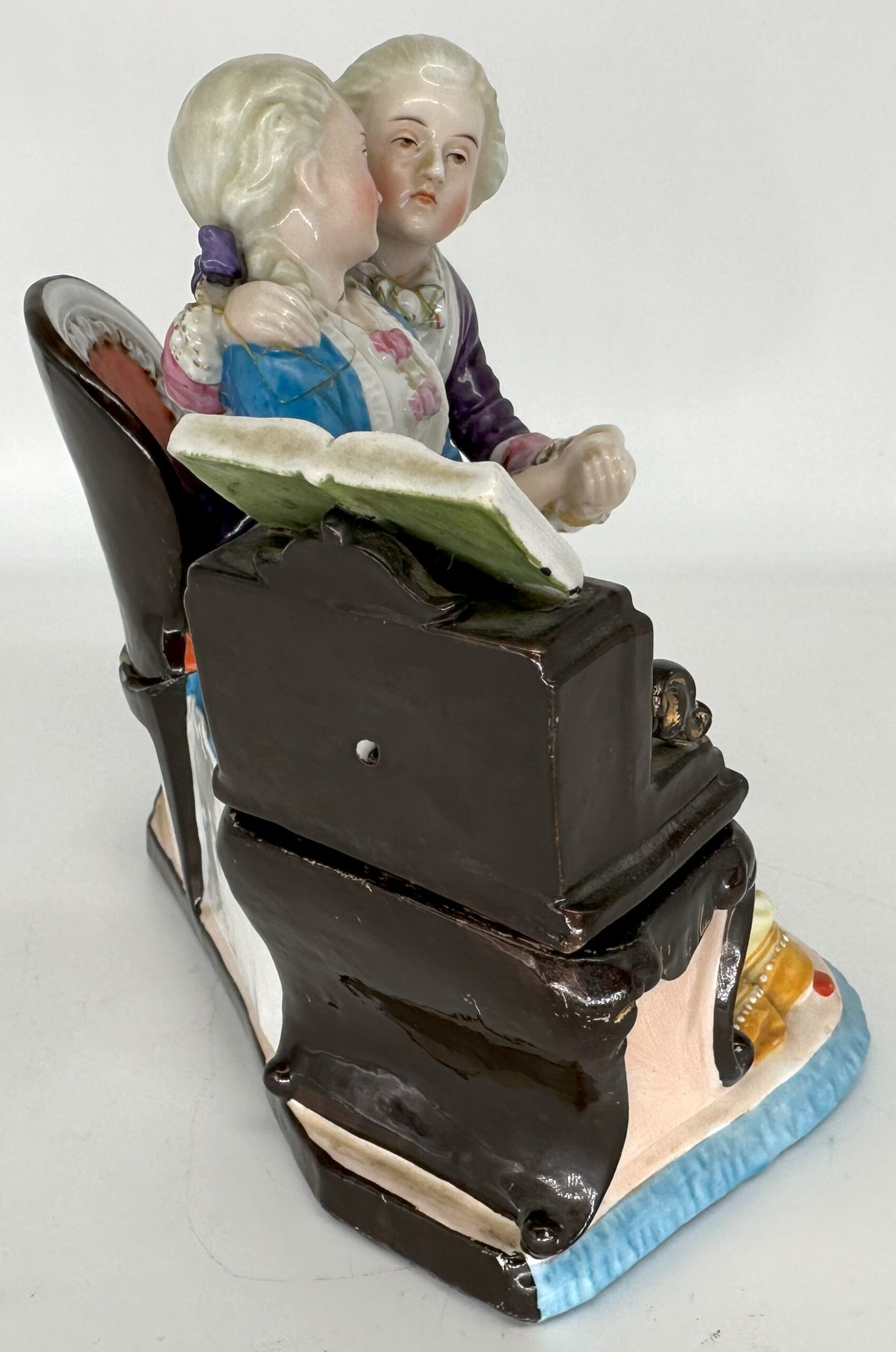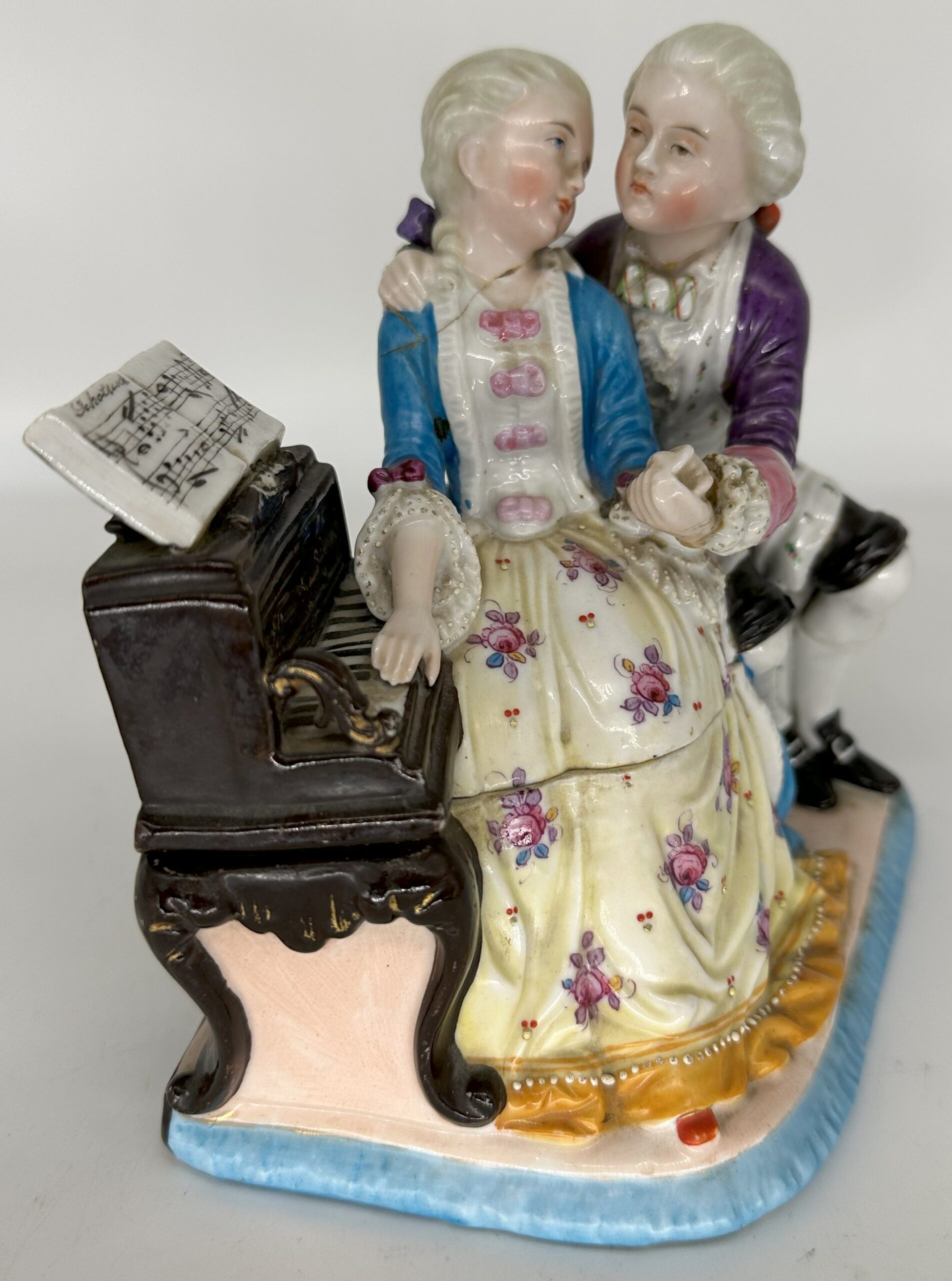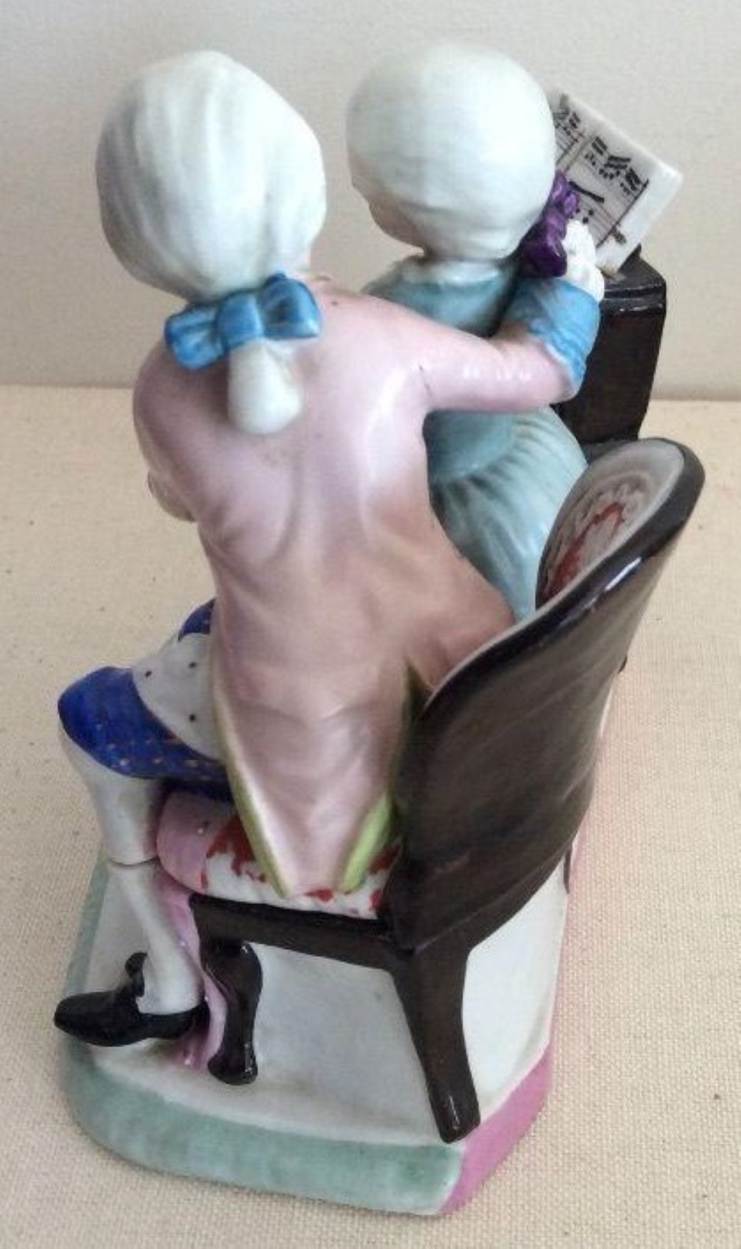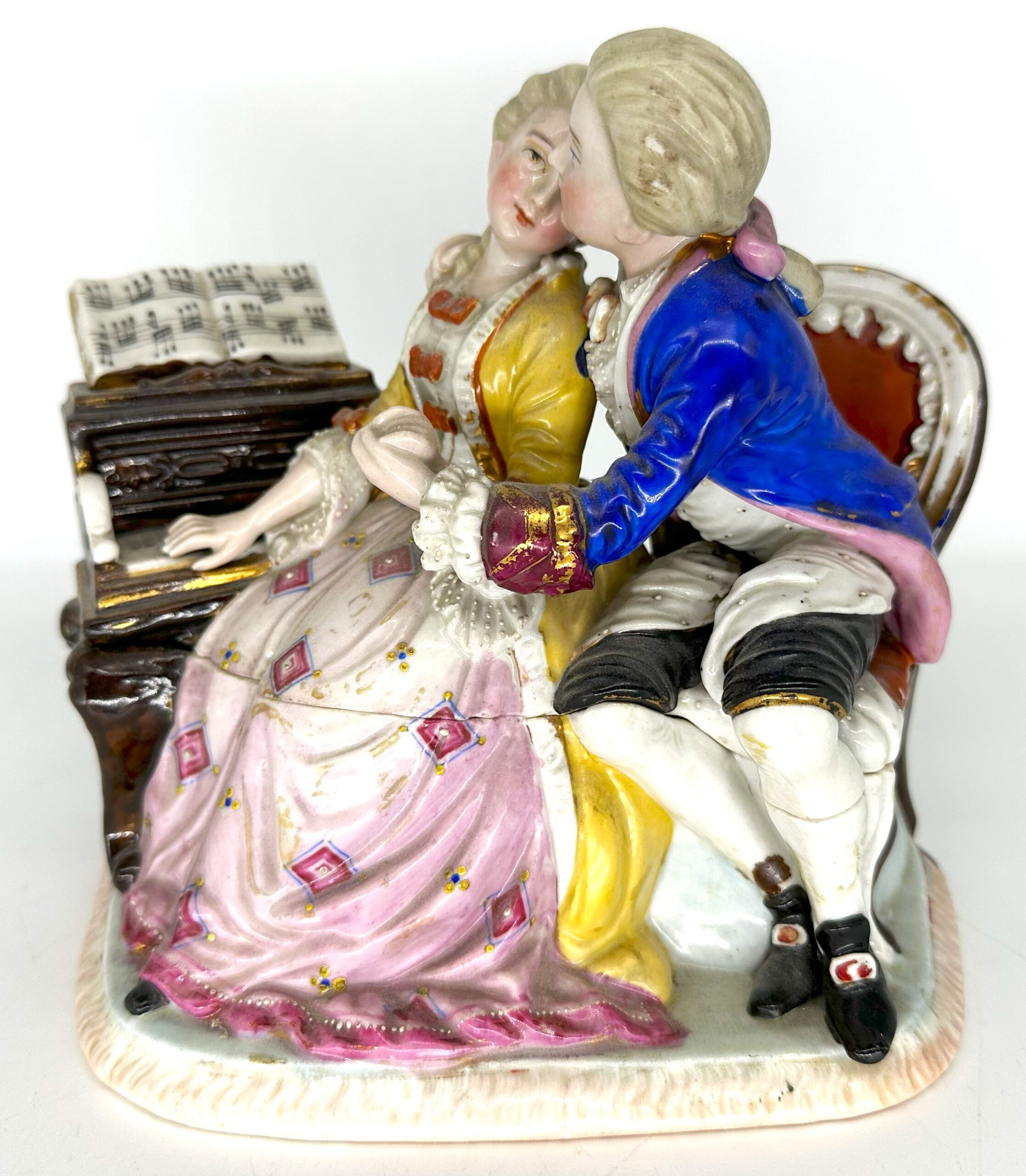 A woman is seated at a harpsichord (piano), her hands poised as if playing. Beside her sits a man with his arm affectionately around her shoulder. The inkstand is molded and hand-painted in detail. The woman wears a dress with intricate floral patterns and beading. The gentleman wears knee-length breeches, white stockings, and black shoes with buckles. Sheet music with distinct notes is on a stand above the keyboard.