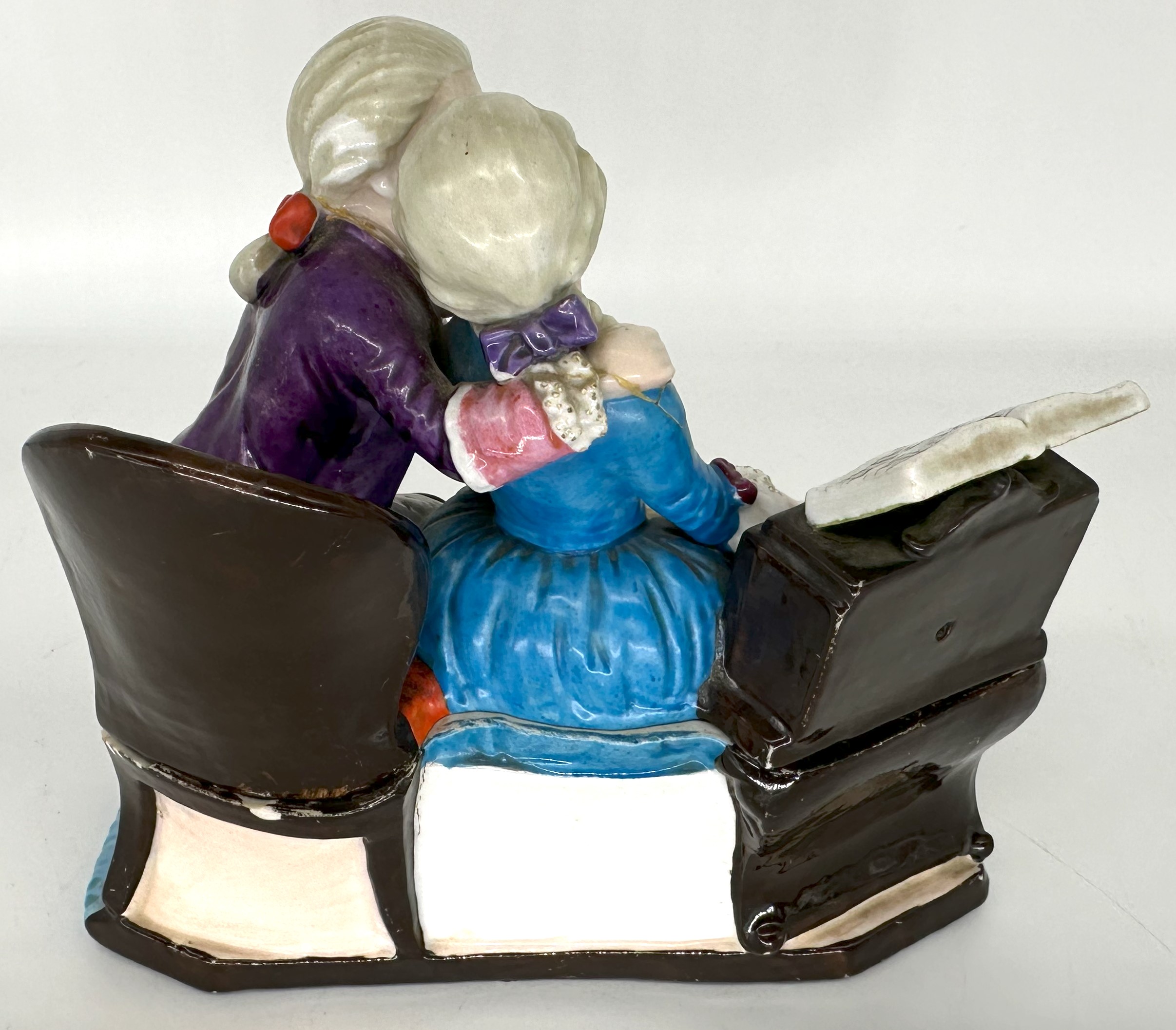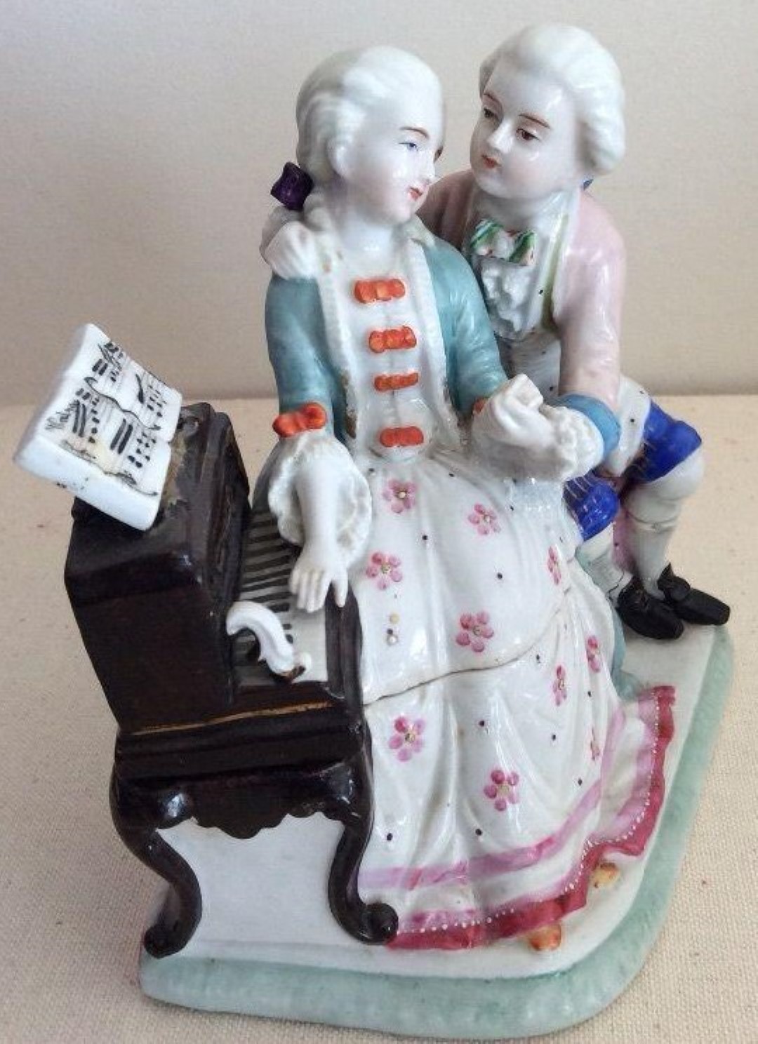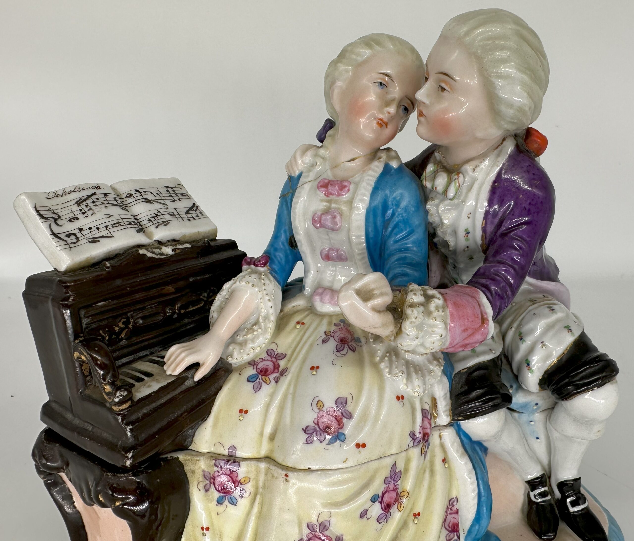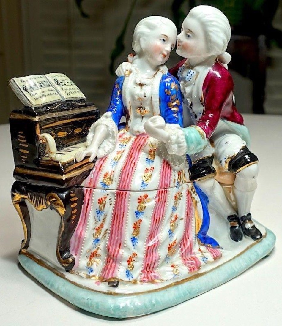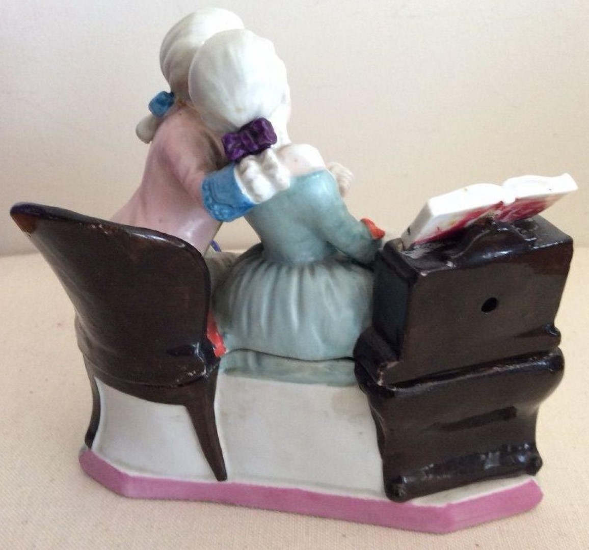 A woman is seated at a harpsichord (piano), her hands poised as if playing. Beside her sits a man with his arm affectionately around her shoulder. The inkstand is molded and hand-painted in detail. The woman wears a dress with intricate floral patterns and beading. The gentleman wears knee-length breeches, white stockings, and black shoes with buckles. Sheet music with distinct notes is on a stand above the keyboard.