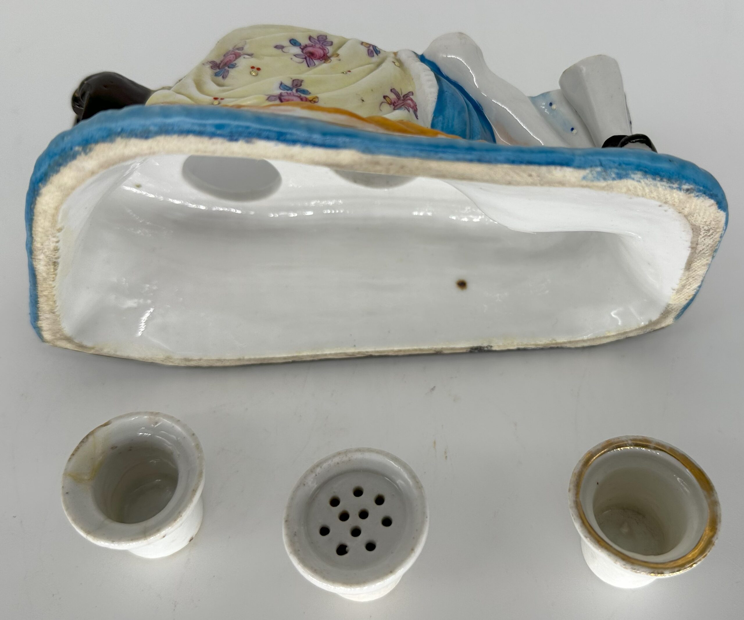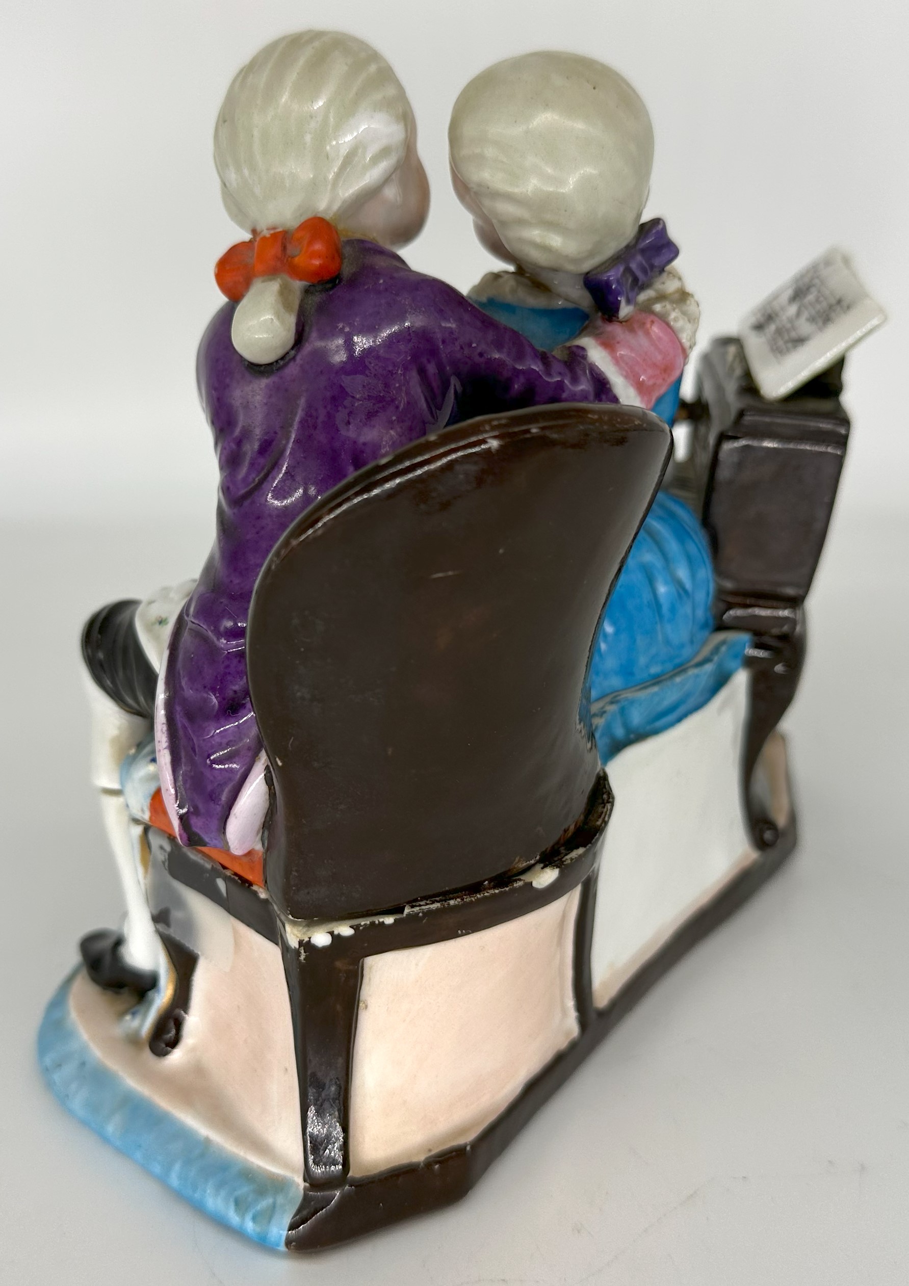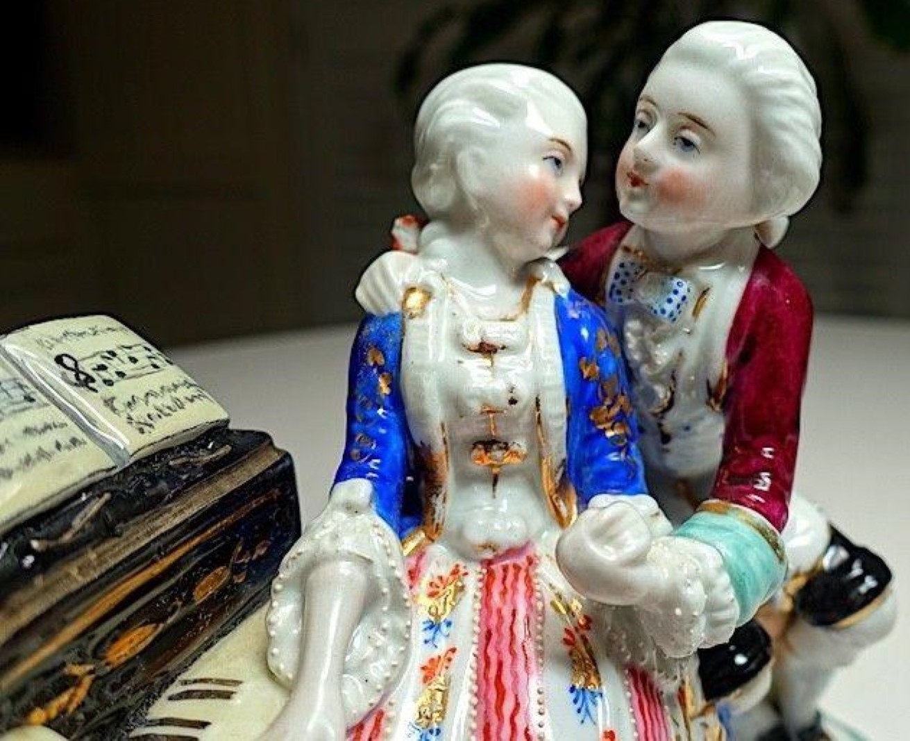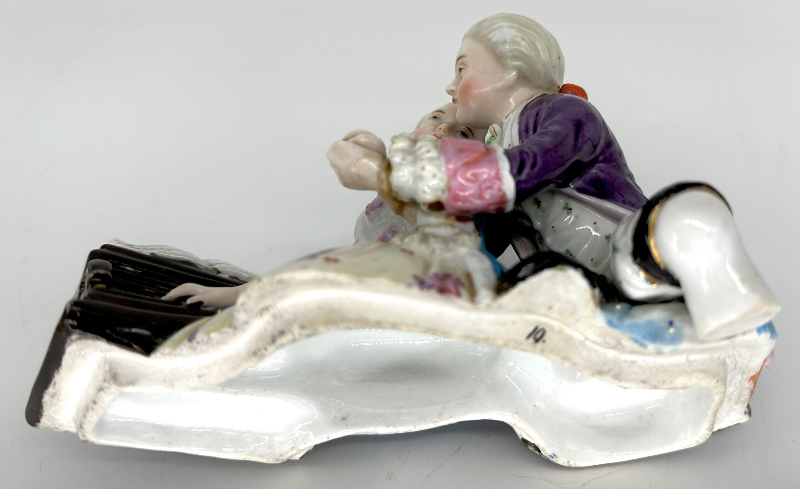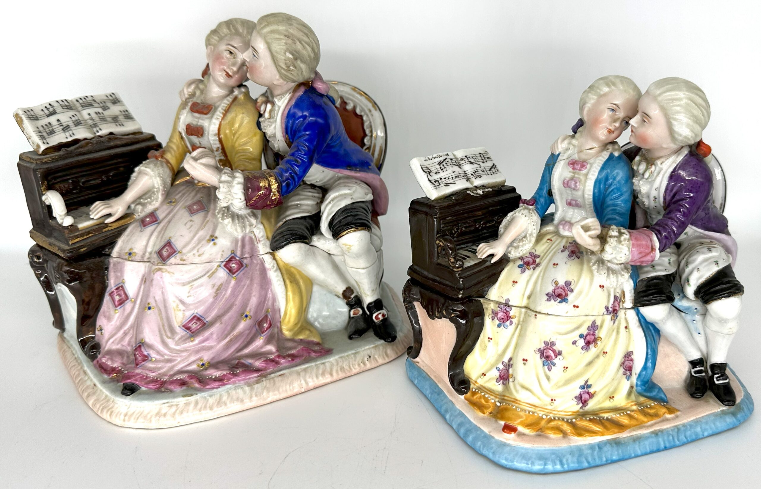A woman is seated at a harpsichord (piano), her hands poised as if playing. Beside her sits a man with his arm affectionately around her shoulder. The inkstand is molded and hand-painted in detail. The woman wears a dress with intricate floral patterns and beading. The gentleman wears knee-length breeches, white stockings, and black shoes with buckles. Sheet music with distinct notes is on a stand above the keyboard.