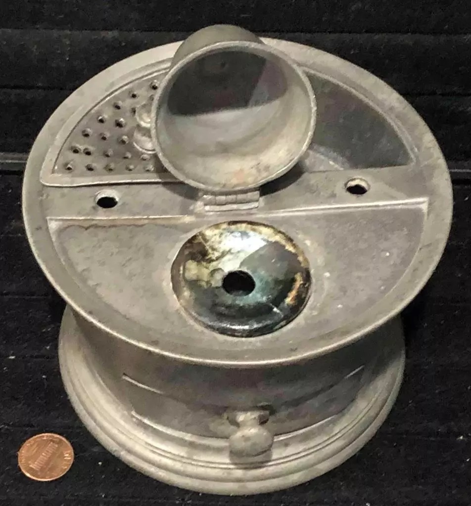 This pewter inkstand with one drawer comes with a history. Round in shape, it has a pull-out drawer, an inkwell covered with a hinged lid, a triangular-shaped sander, and two pen holes. Inscribed on its underside: COUTTS BANKING HOUSE 1775”. The Coutts Banking House is one of the oldest banks in England. Some of its history follows. The inkstand likely dates to the 1780 to 1800 period.