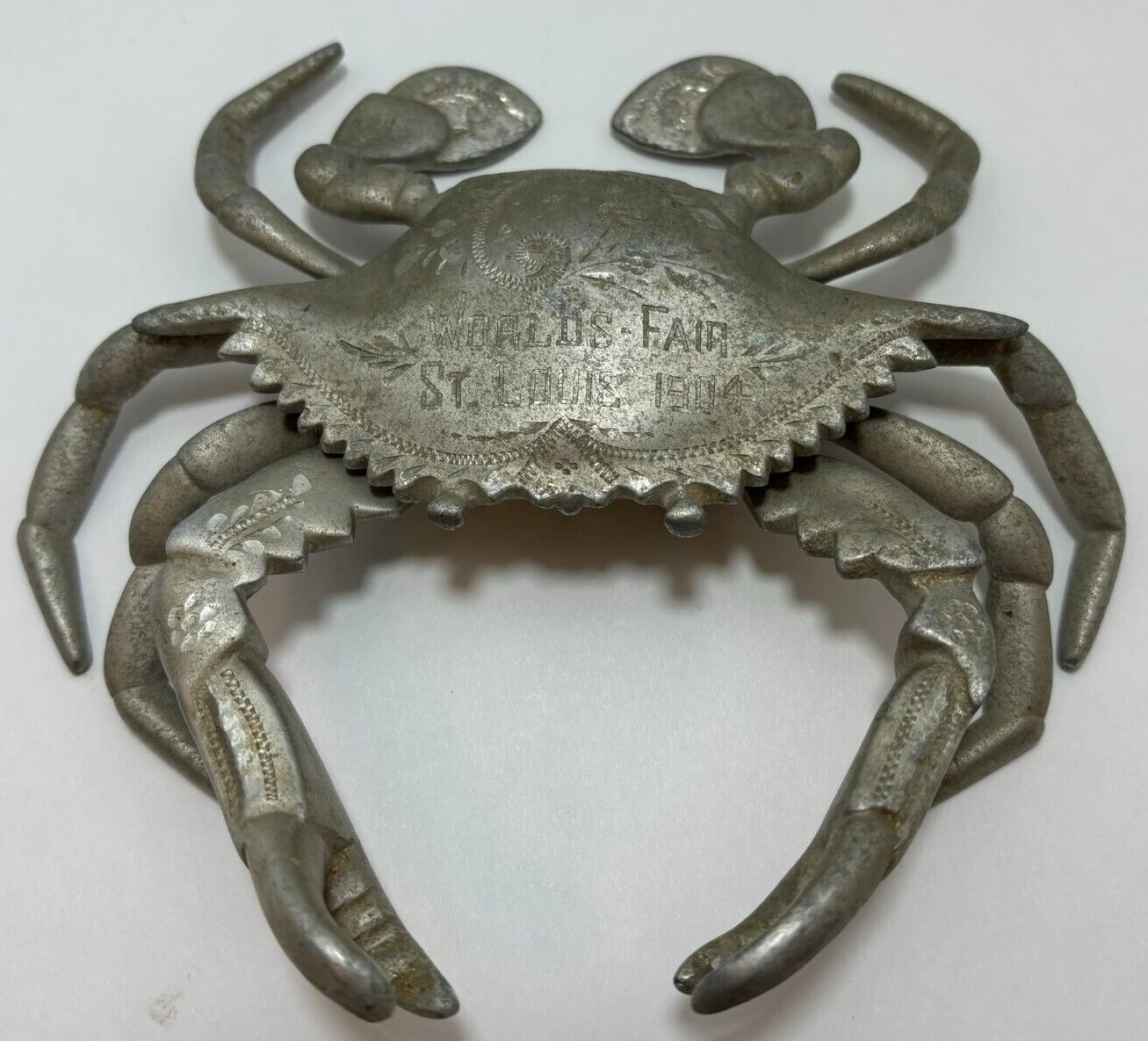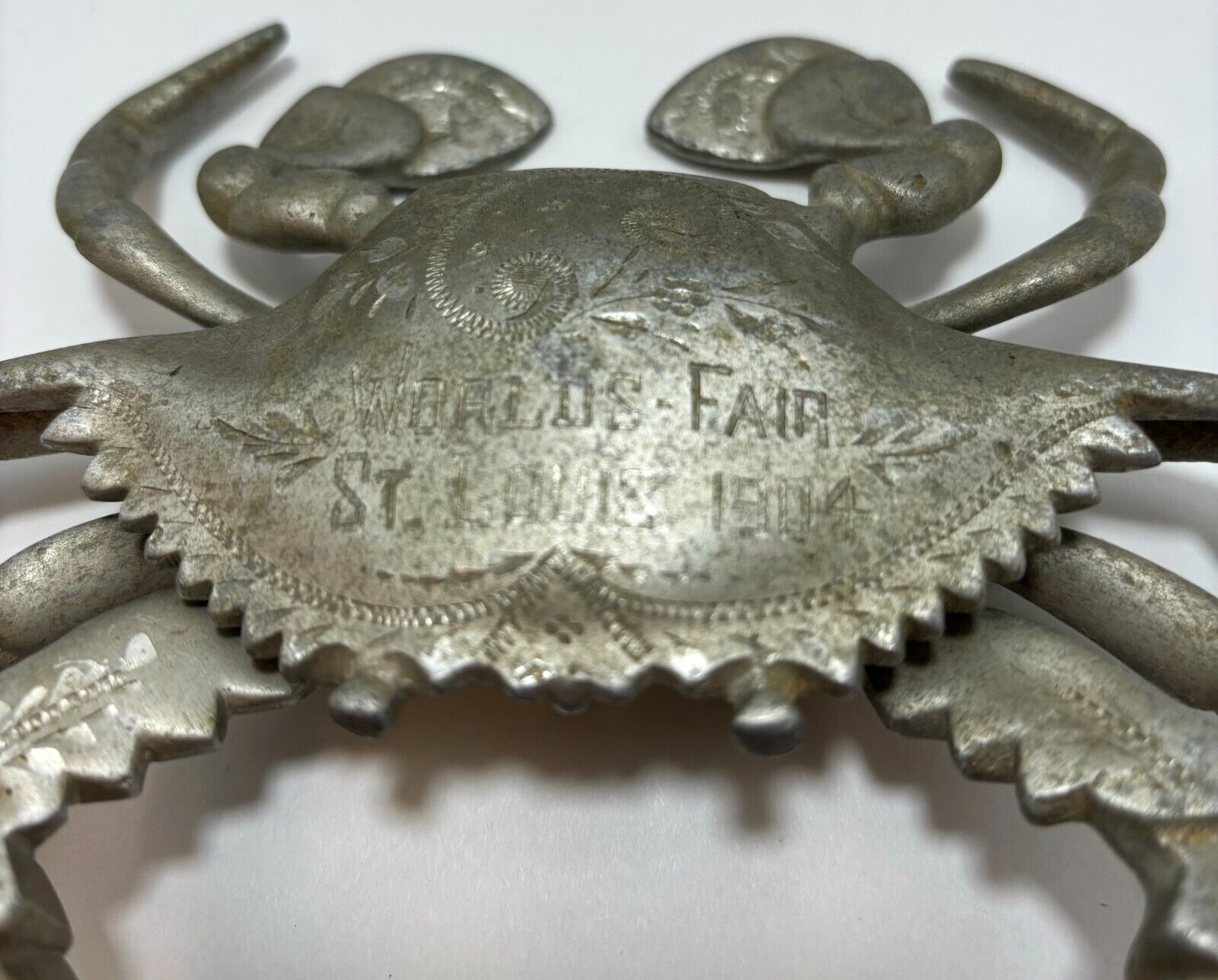 A figural inkwell in the form of a crab. Open the shell to access the ink pot. Inscribed on the top of the crab’s shell: “World’s Fair – St. Louis – 1904”.