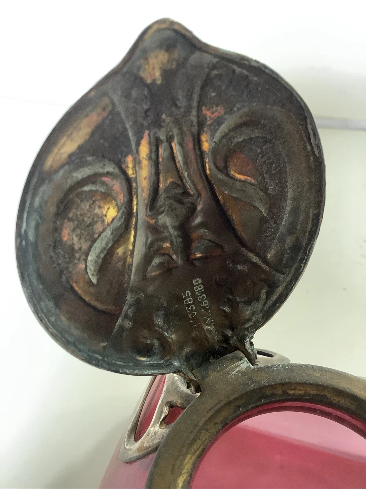 This inkwell is attributed to Stölzle & Sons. The body of the inkwell is made from cranberry iridescent glass. Its ornamental brass mounting features an intricate, organic design inspired by foliage. The brass elements wrap around the glass body. The hinged lid is shaped like a Satyr’s head.