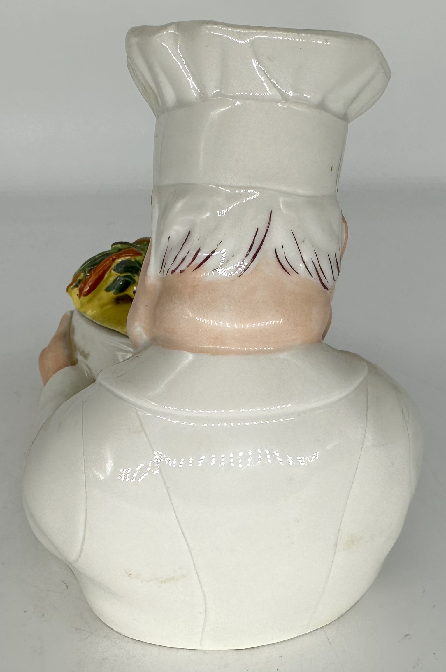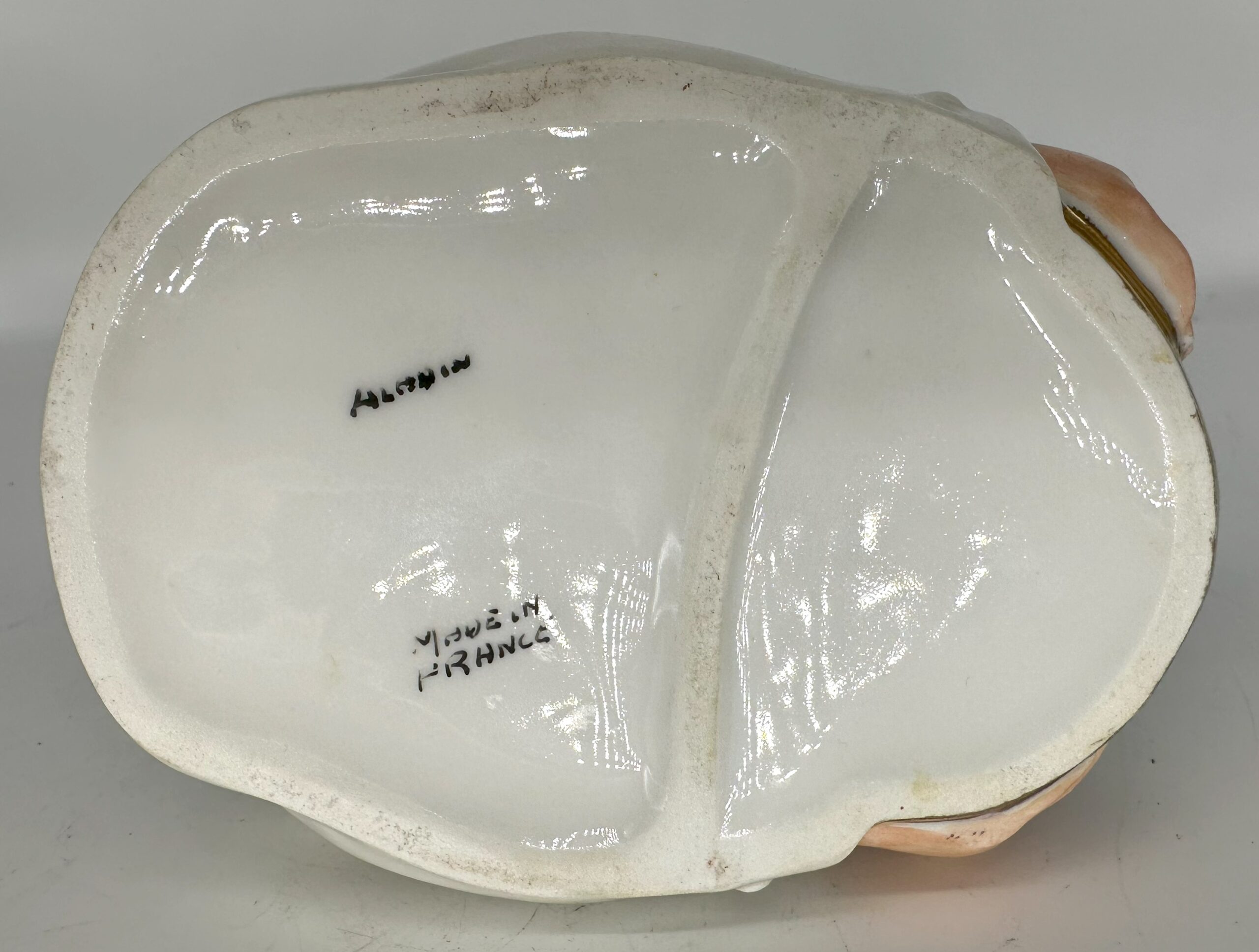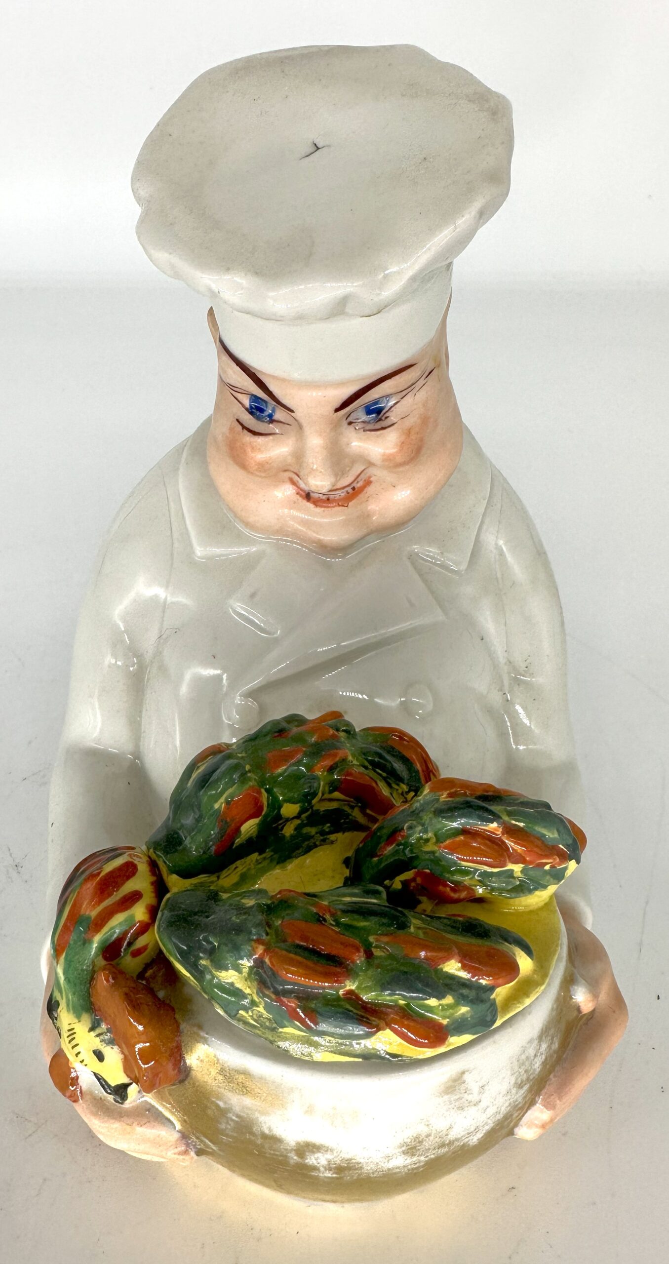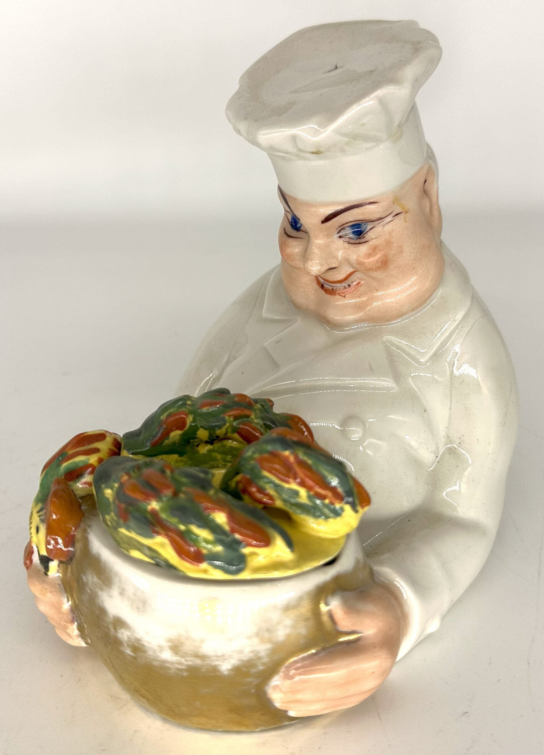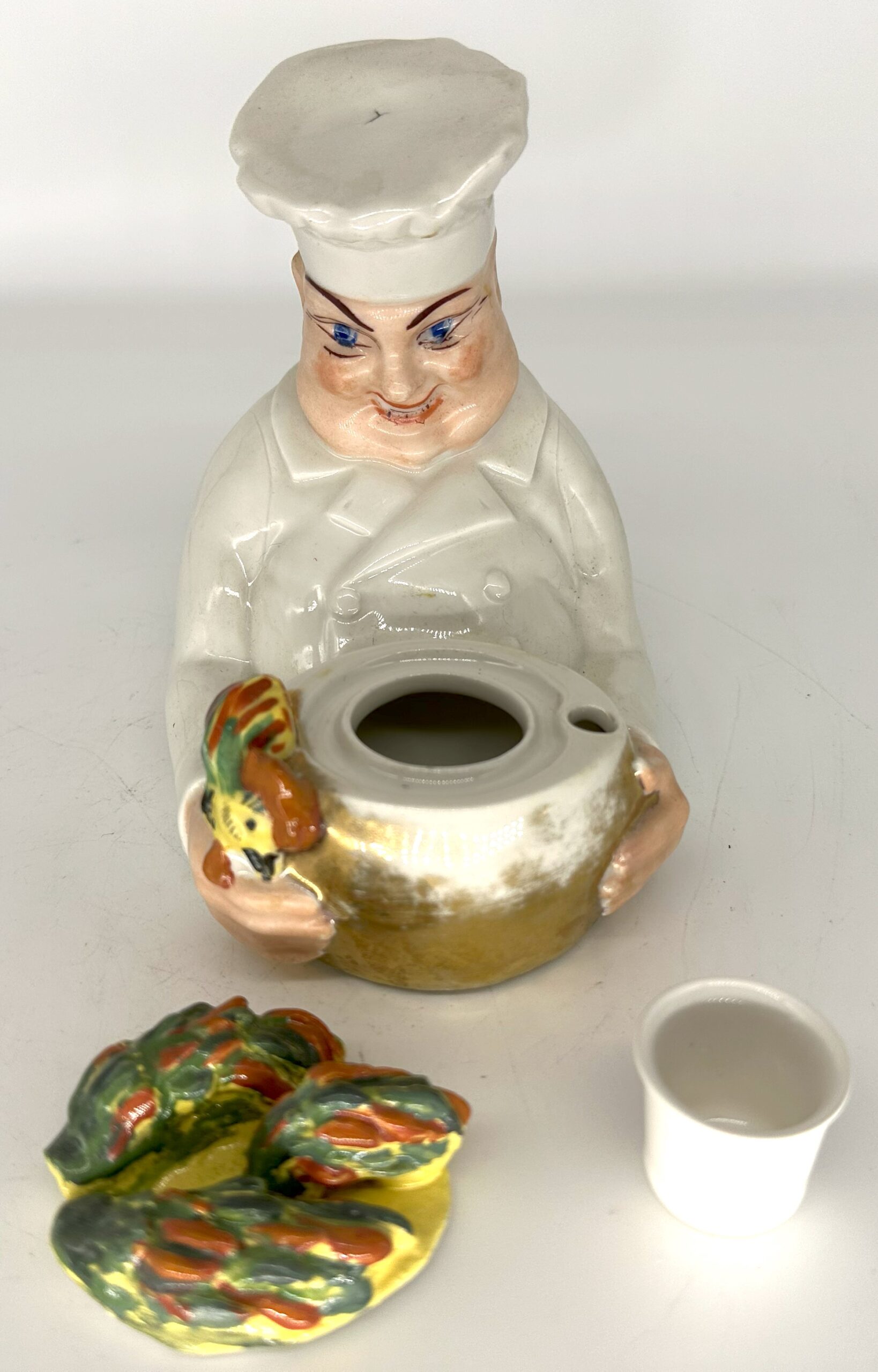 Here is an amusing sculpture of a chef with a gleeful expression, hands wrapped around a cooking pot with a rooster inside. Marked “Aladin” and “Made in France”.