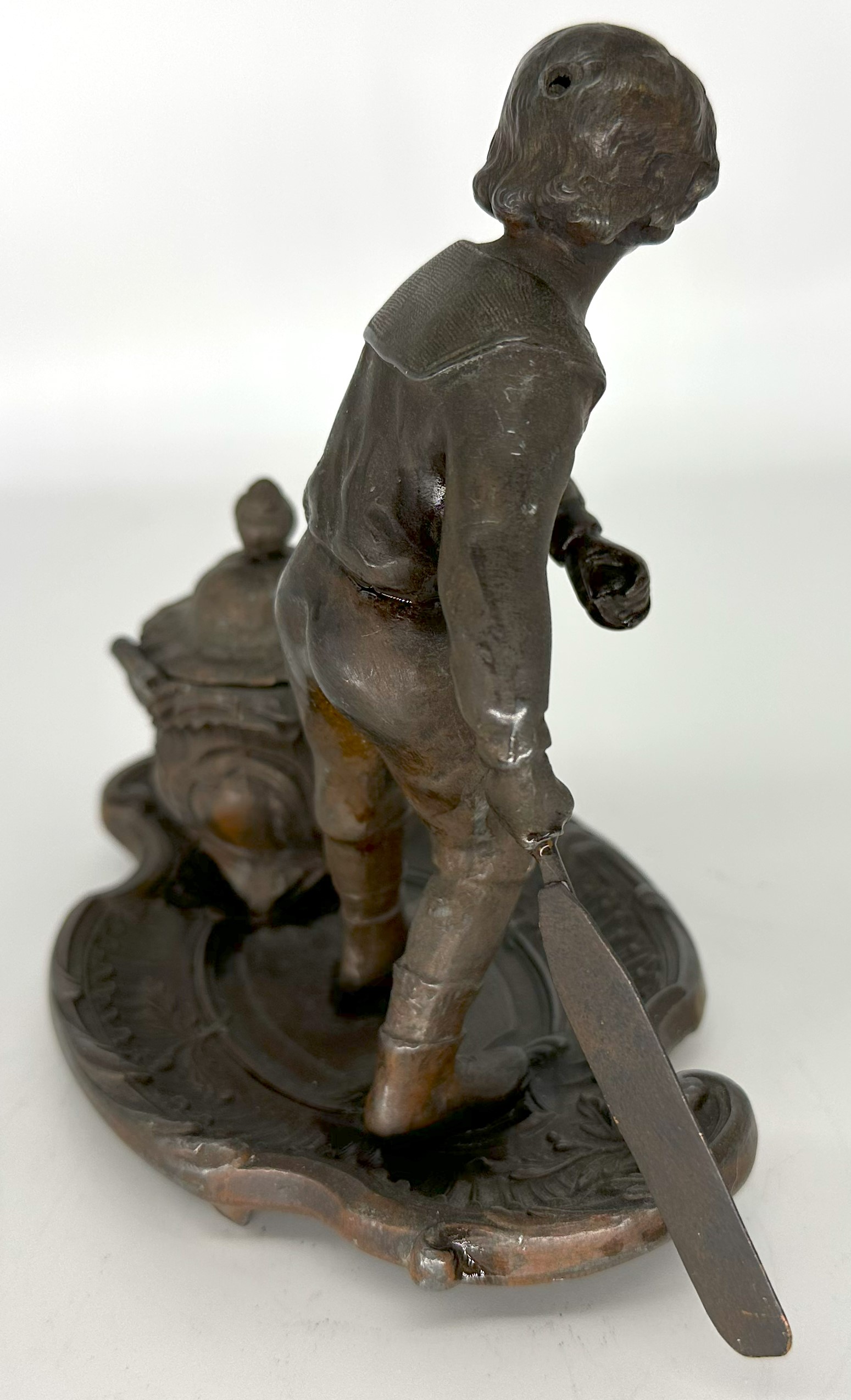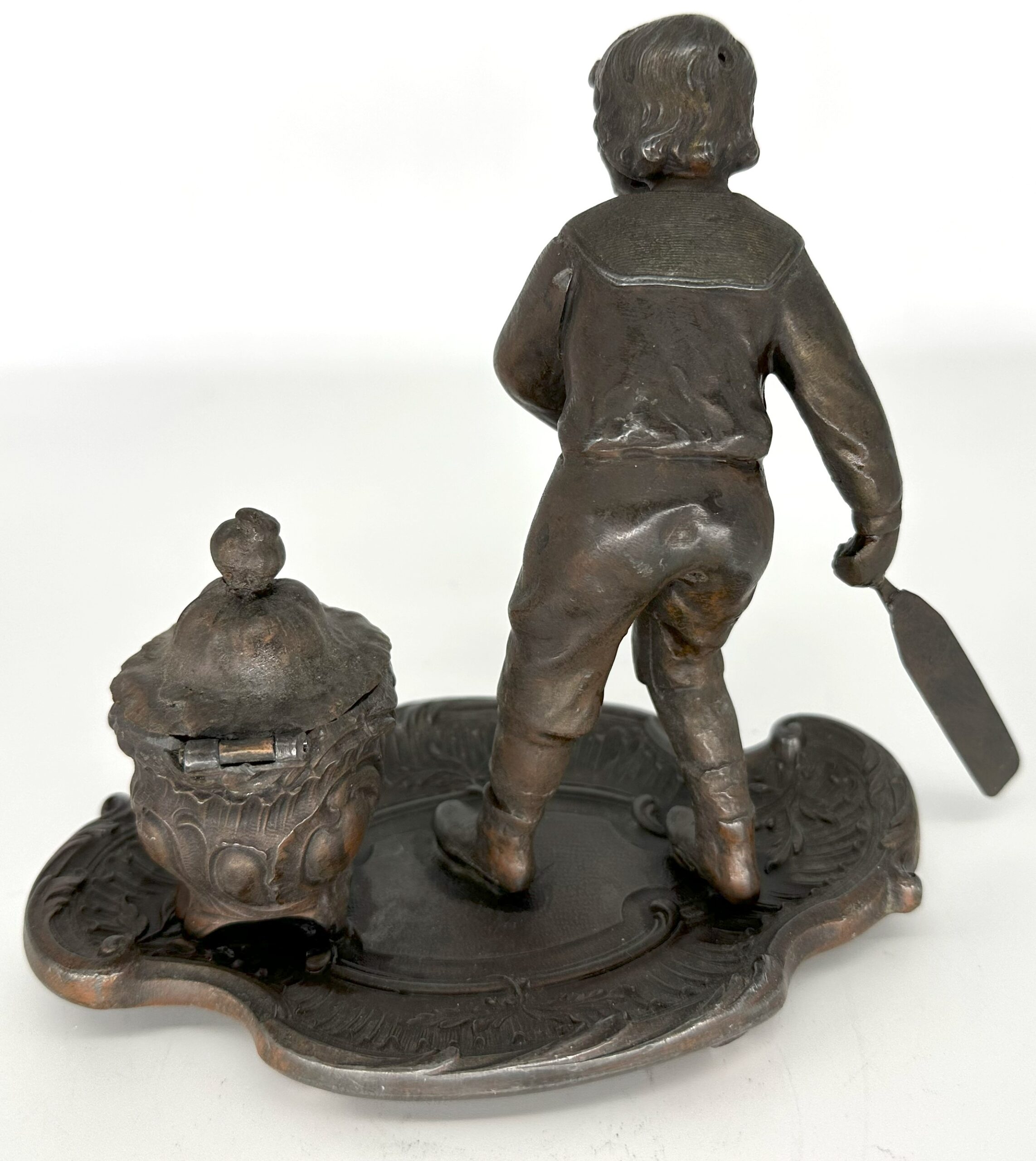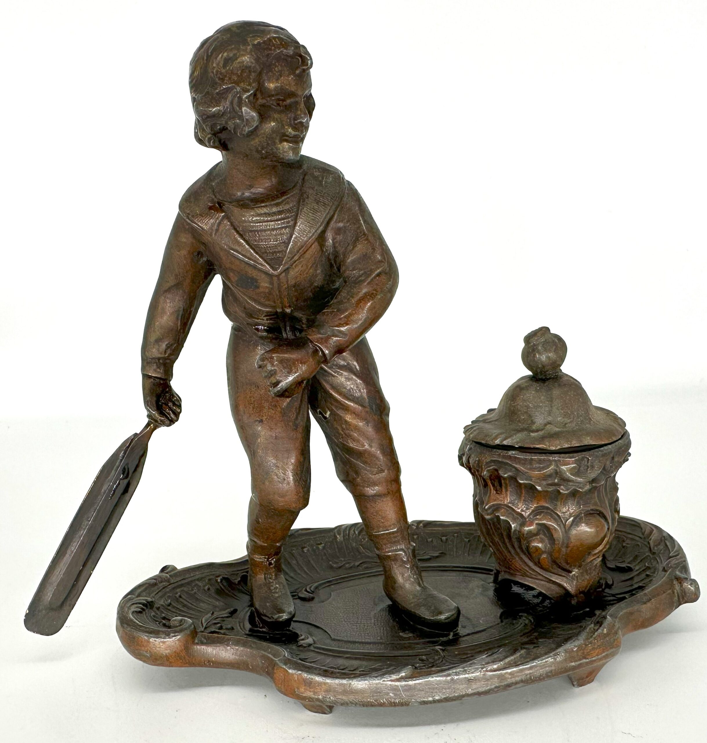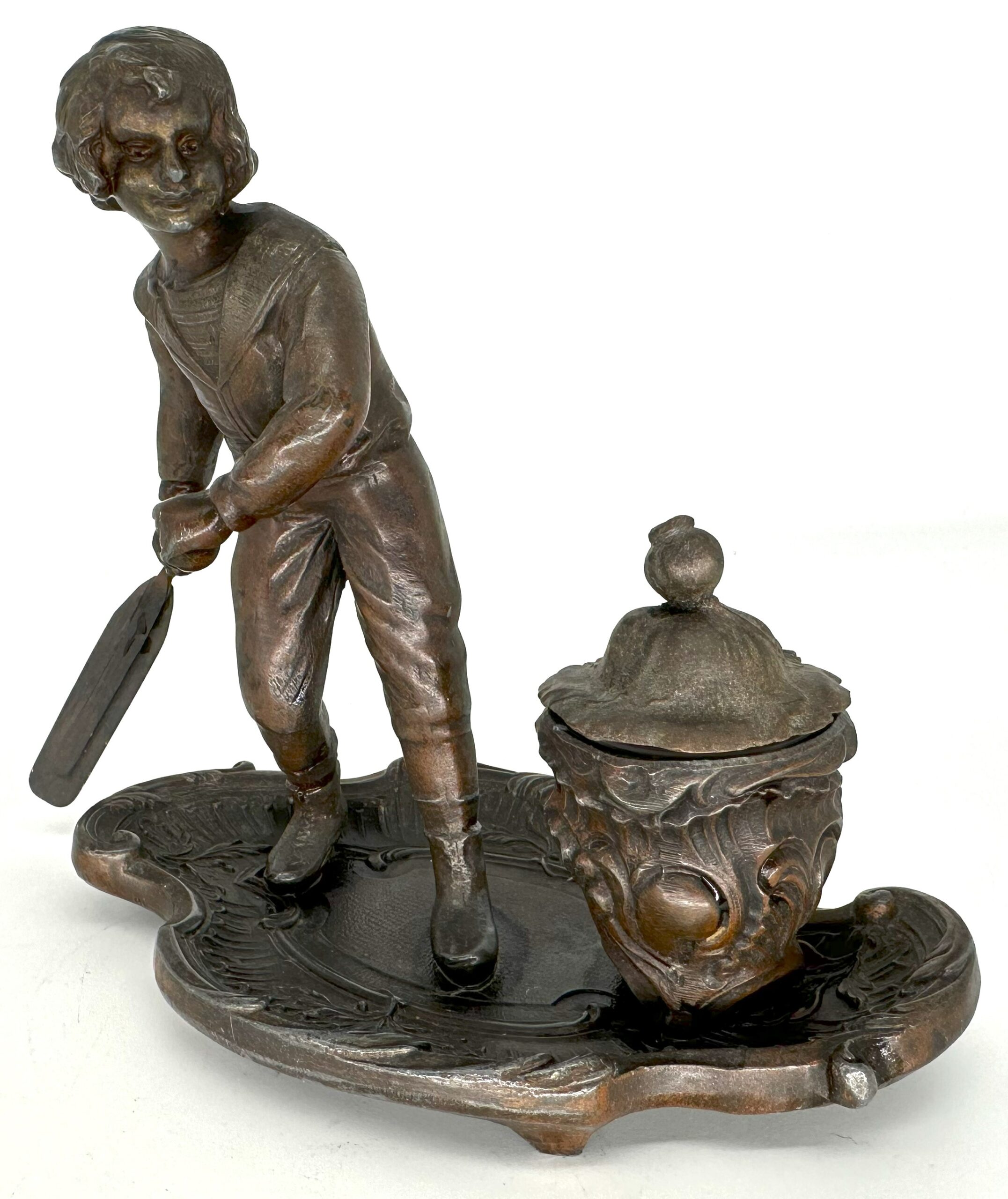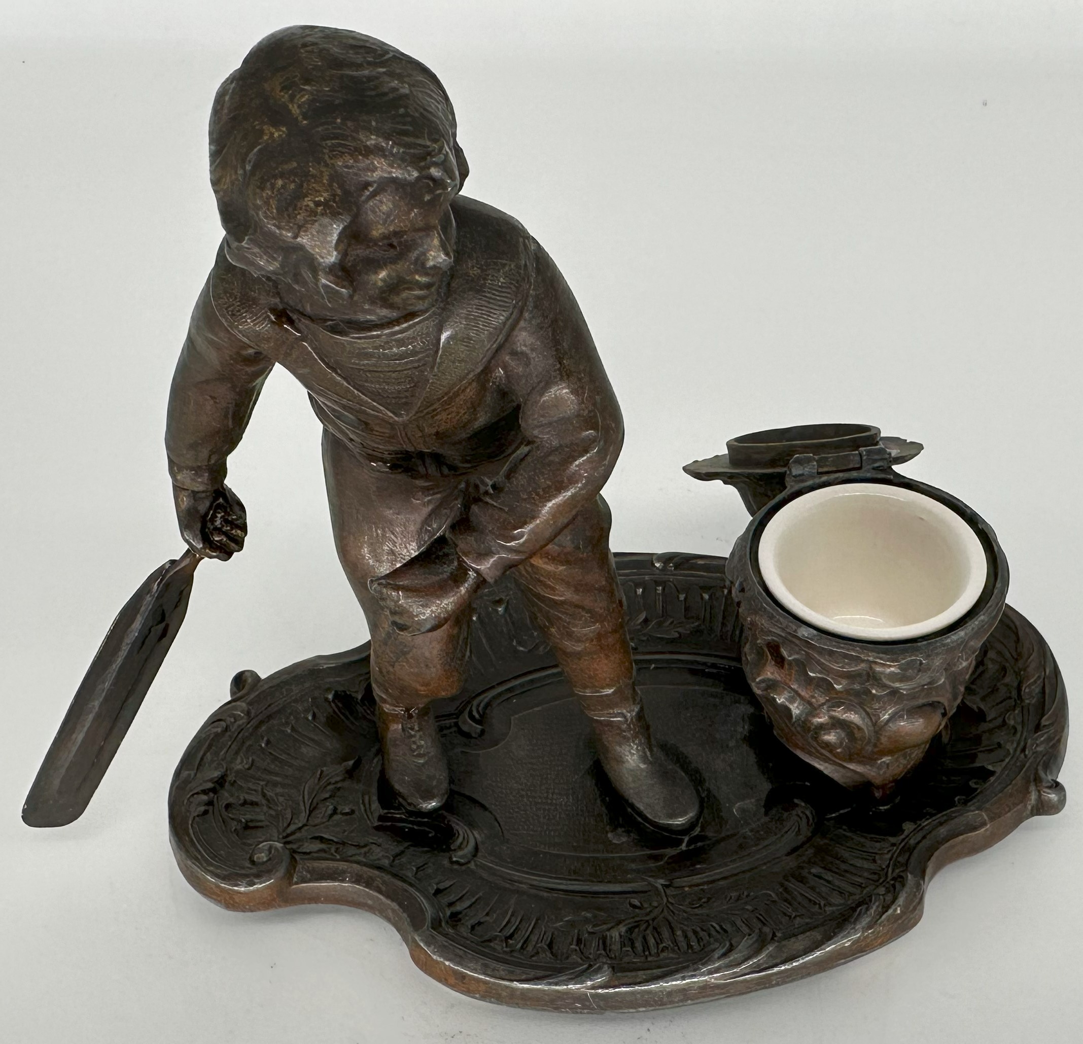 Bronze-patinated white metal inkstand with standing figure of a cricket player swinging his bat.