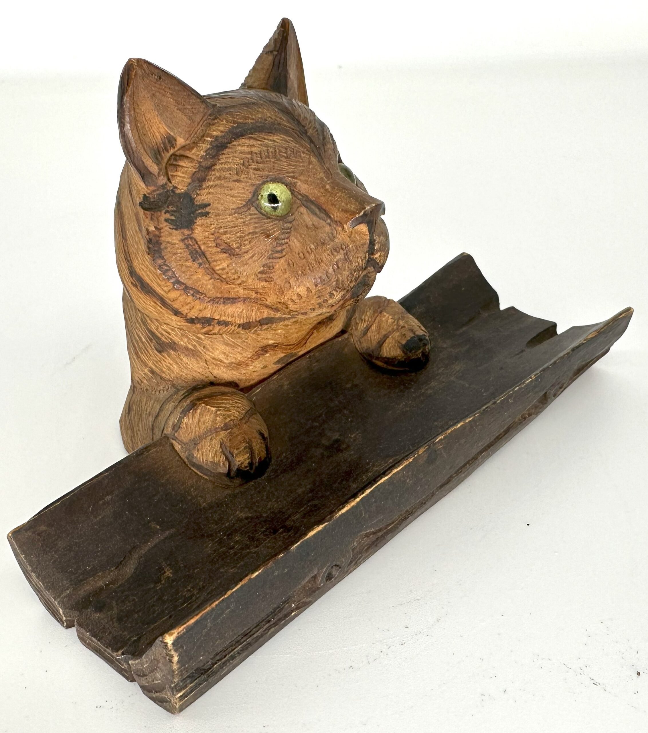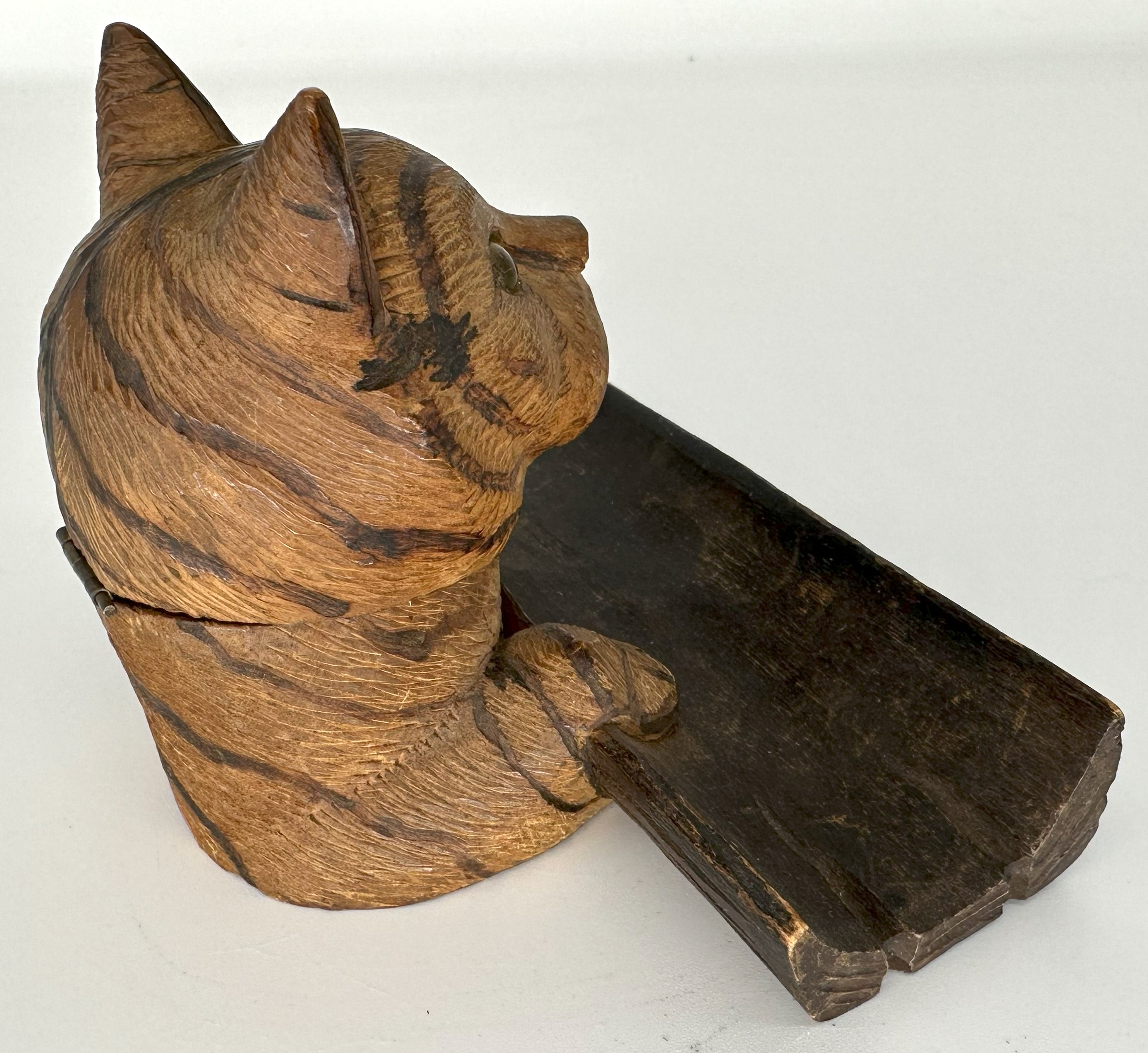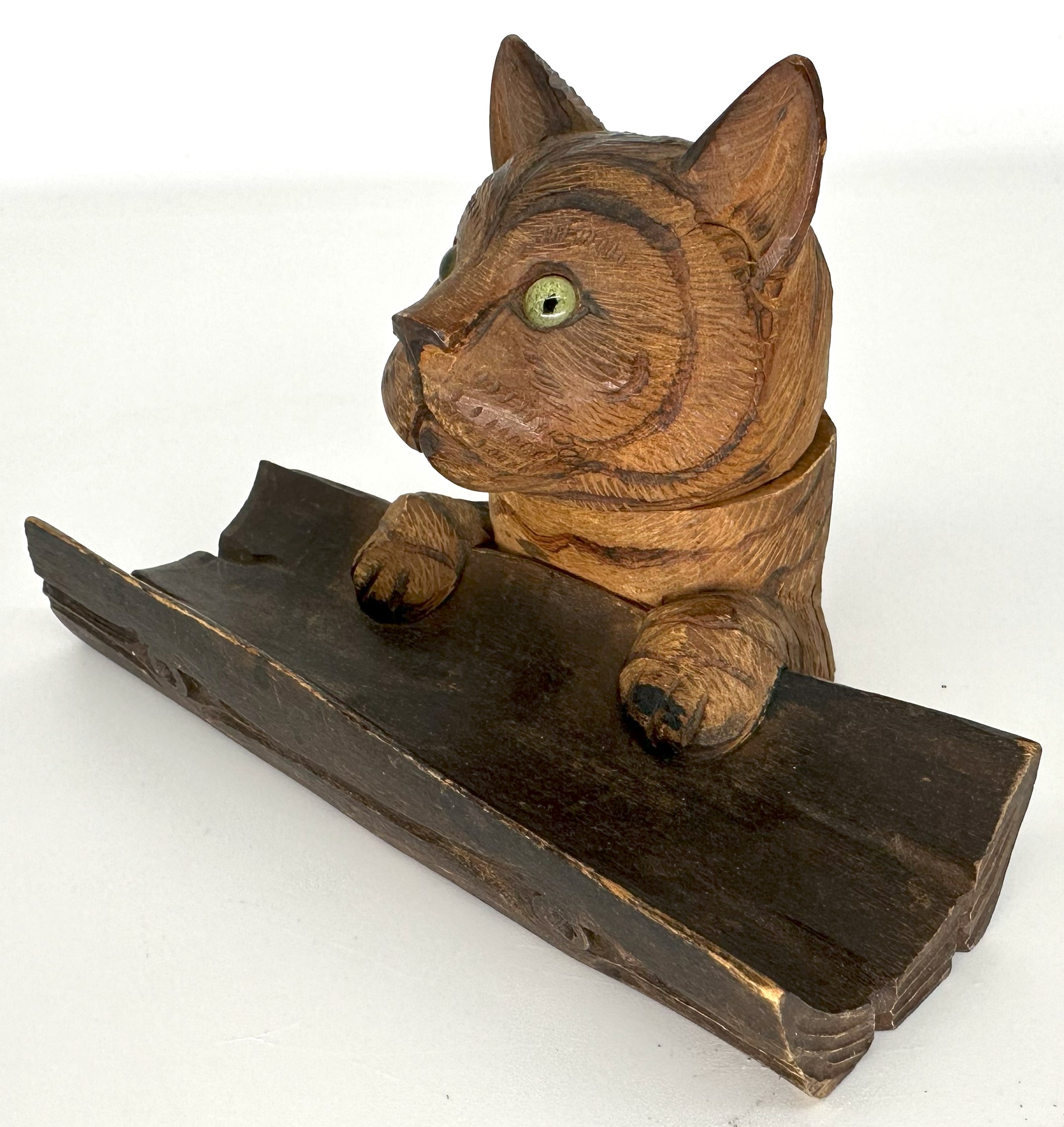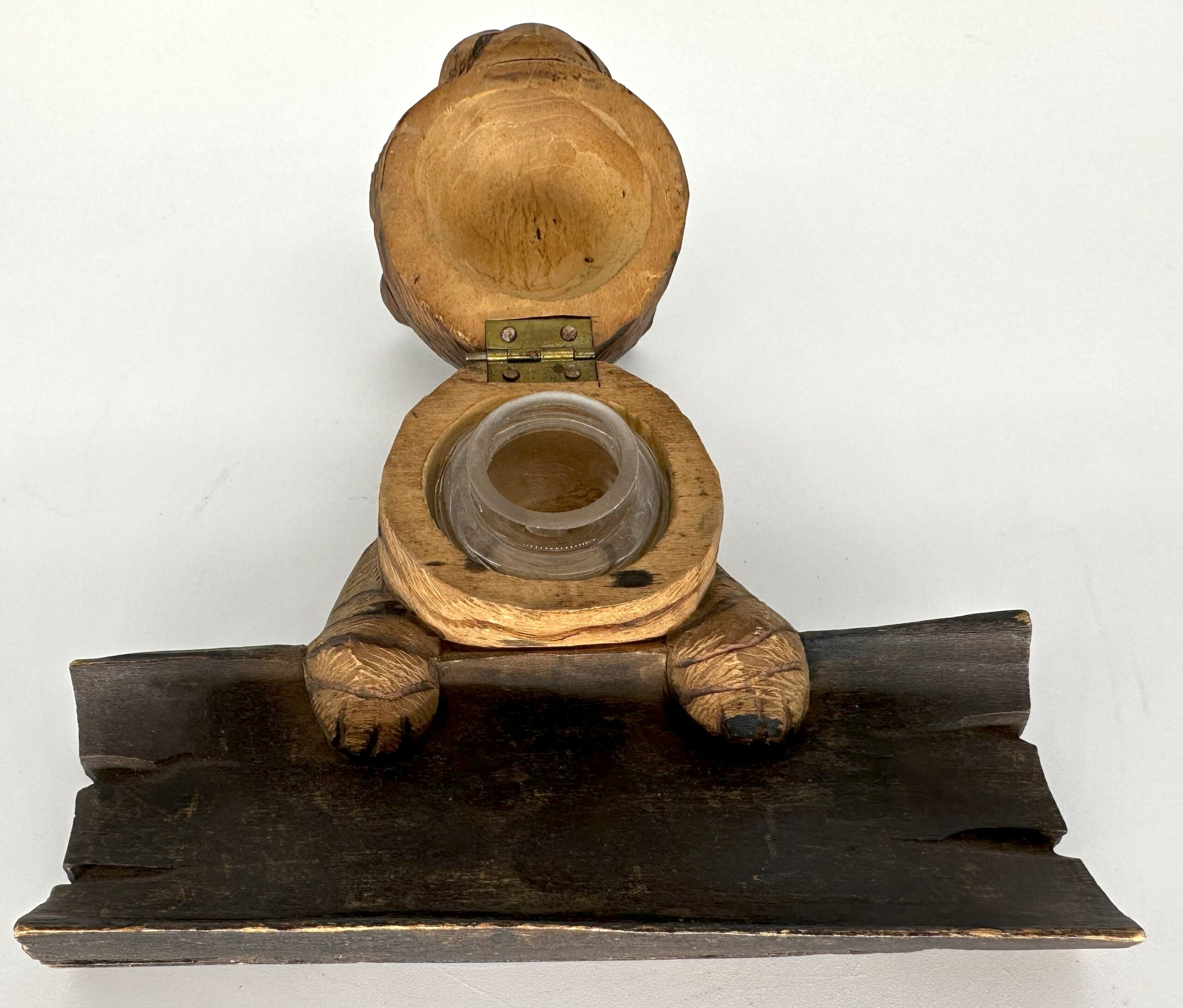 With its paws draped over a hollowed-out log (pen rest), this crazy carved cat will inspire creative writing. There’s nice detail all over, front and back. But it’s the glass eyes, looking cross-eyed, that complete the charm. The cat’s hinged head opens to the ink bottle.