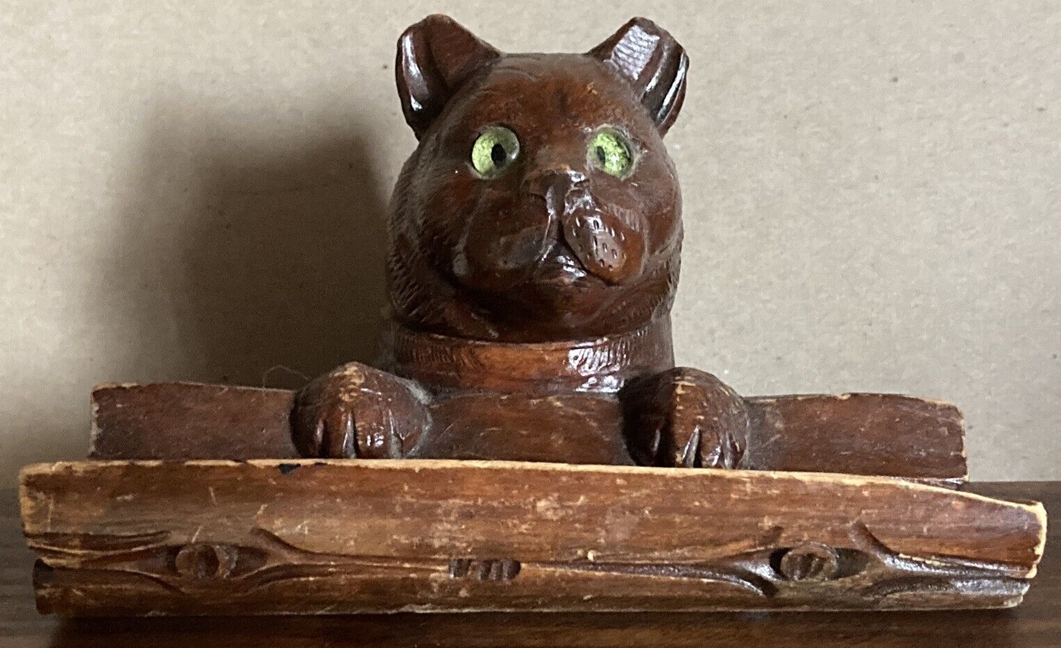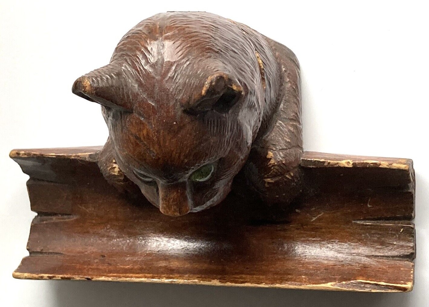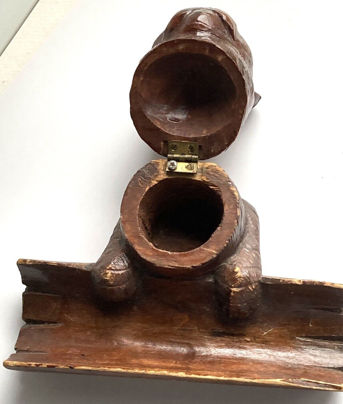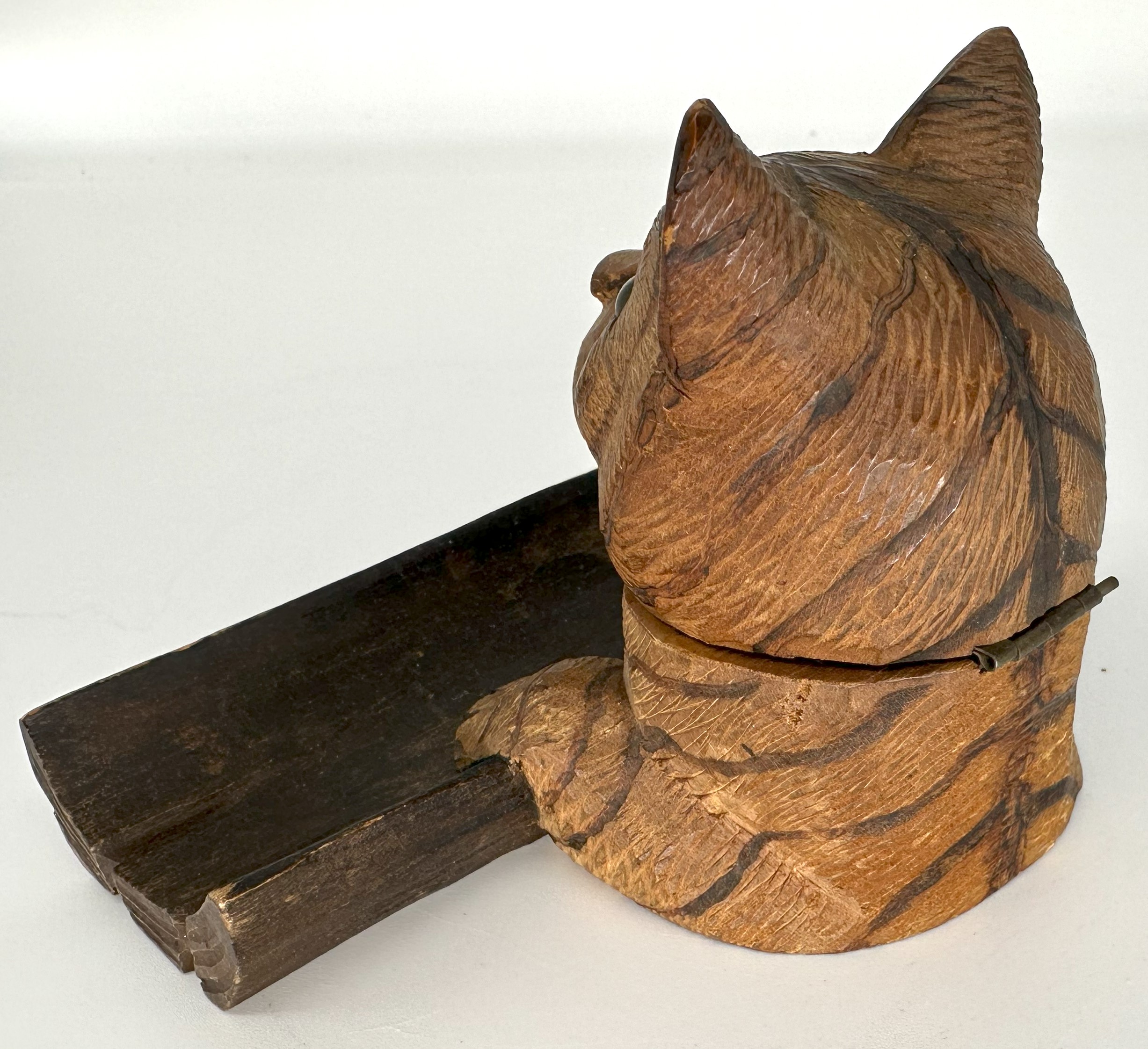 With its paws draped over a hollowed-out log (pen rest), this crazy carved cat will inspire creative writing. There’s nice detail all over, front and back. But it’s the glass eyes, looking cross-eyed, that complete the charm. The cat’s hinged head opens to the ink bottle.