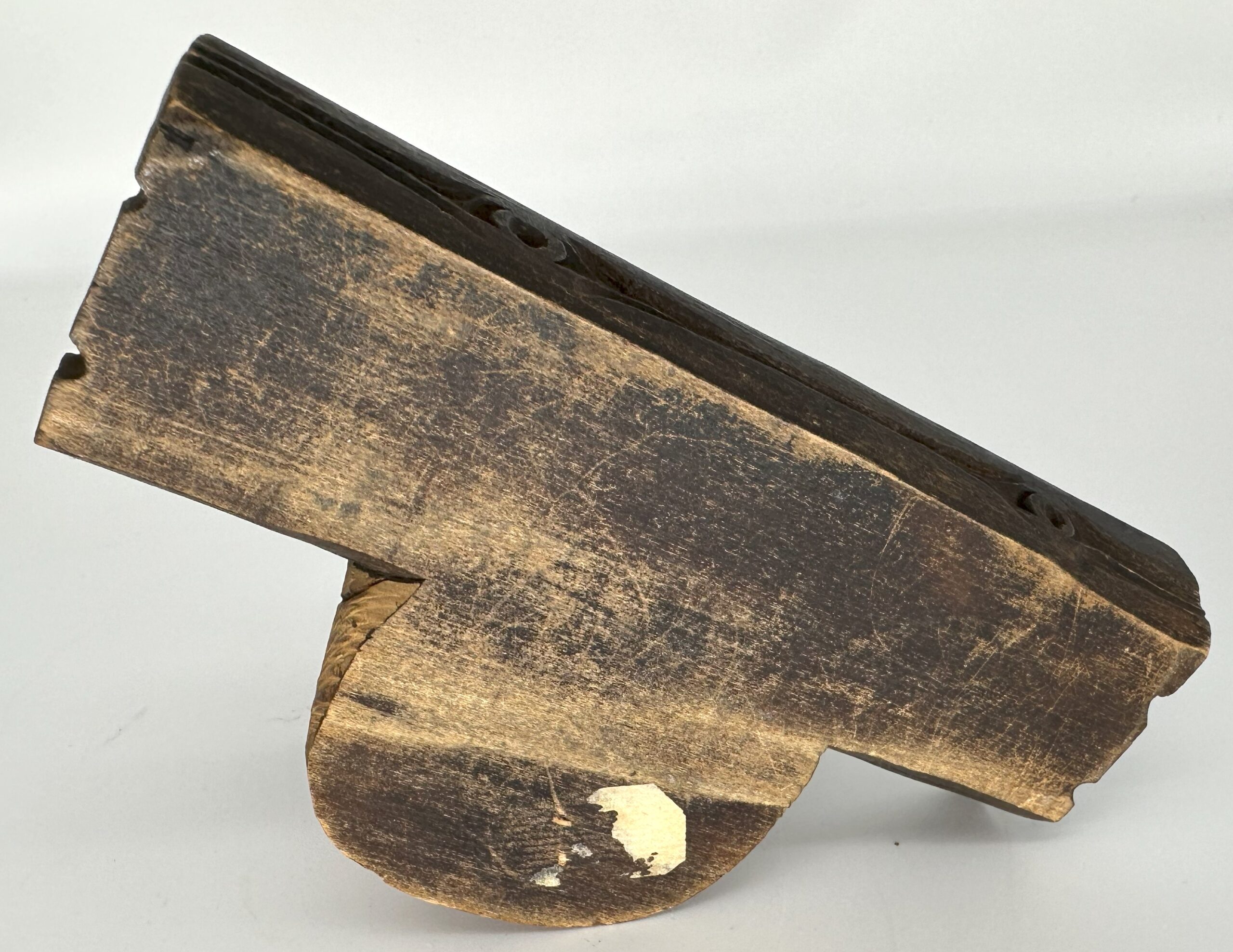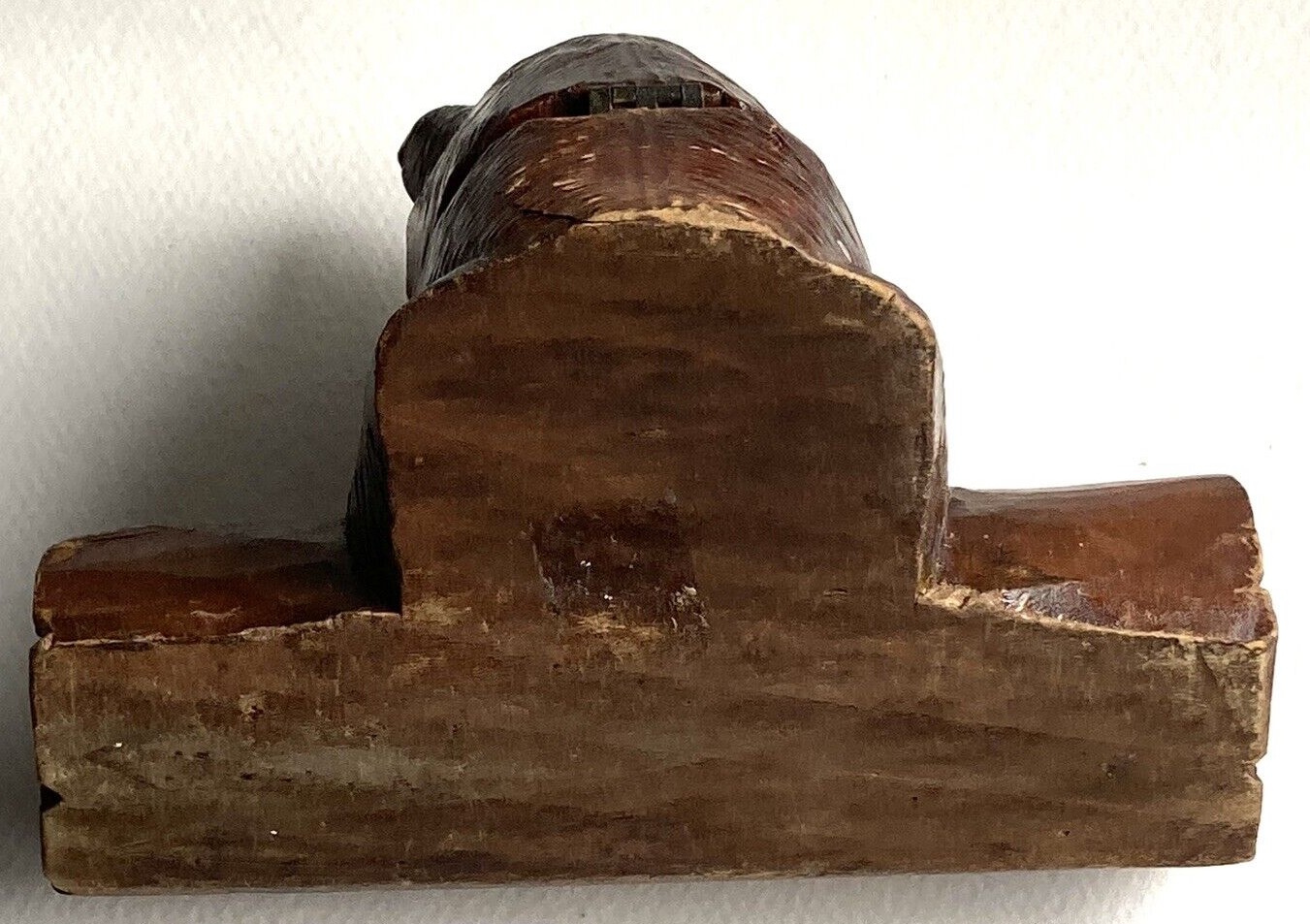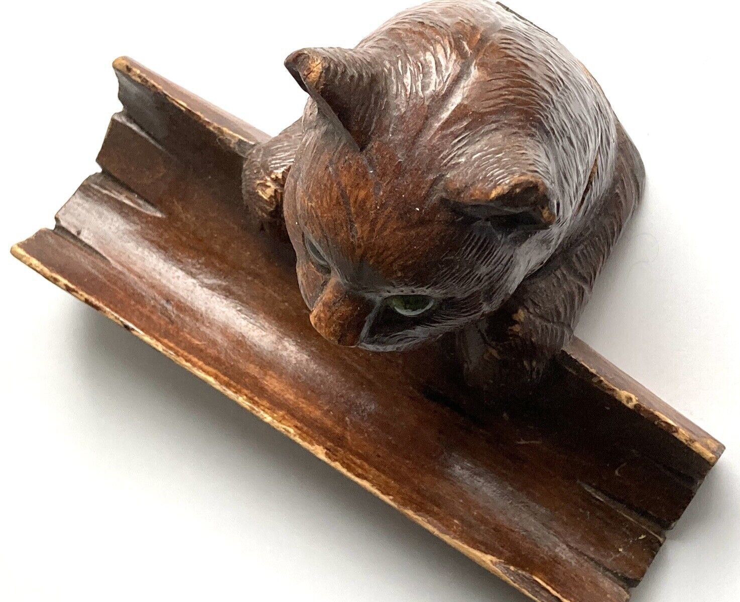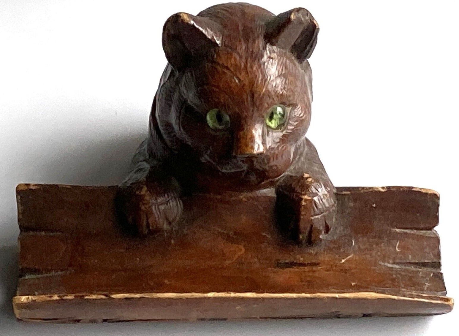 With its paws draped over a hollowed-out log (pen rest), this crazy carved cat will inspire creative writing. There’s nice detail all over, front and back. But it’s the glass eyes, looking cross-eyed, that complete the charm. The cat’s hinged head opens to the ink bottle.