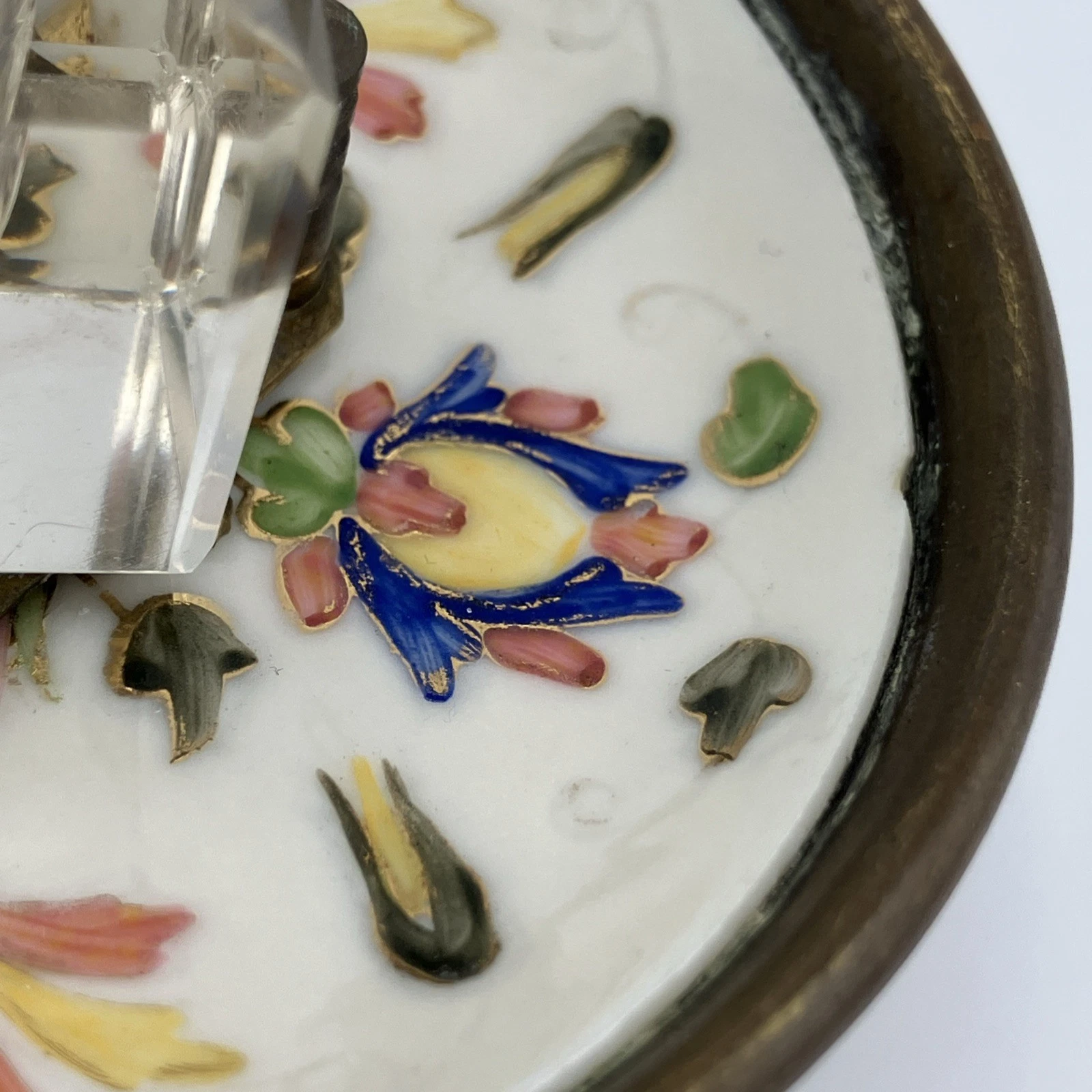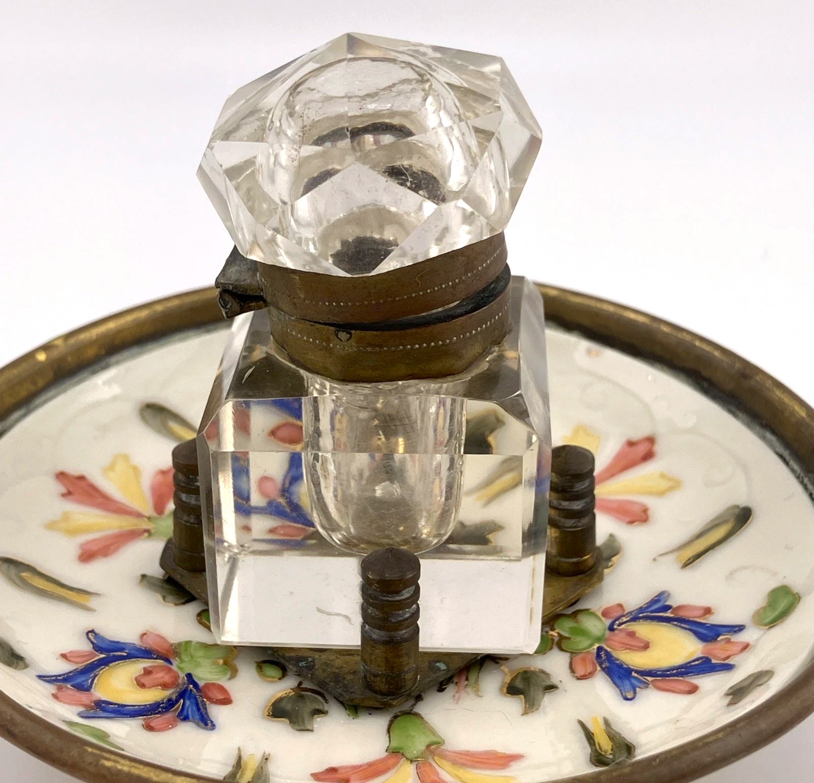 • Where was it made? This piece is likely French in origin. The combination of high-quality faceted crystal with colorful, raised hand-painted enamels is a hallmark of late 19th-century Continental desk accessories. The floral patterns on the porcelain resemble “Paris porcelain” (Vieux Paris).