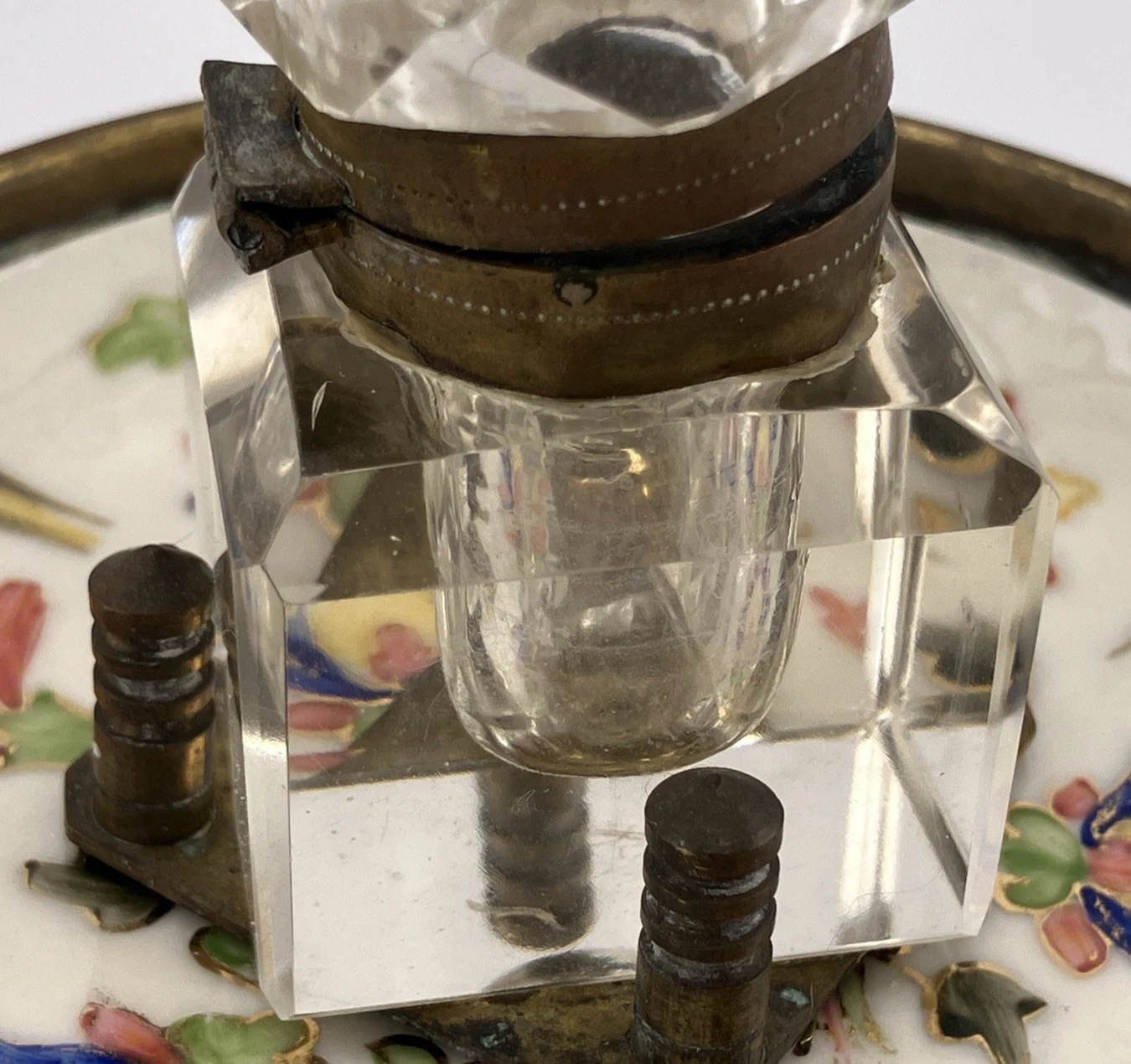 • The Base: The inkwell is secured to a saucer-shaped brass bowl by three turned brass posts. These posts act as a “cradle” to keep the heavy glass cube from shifting.