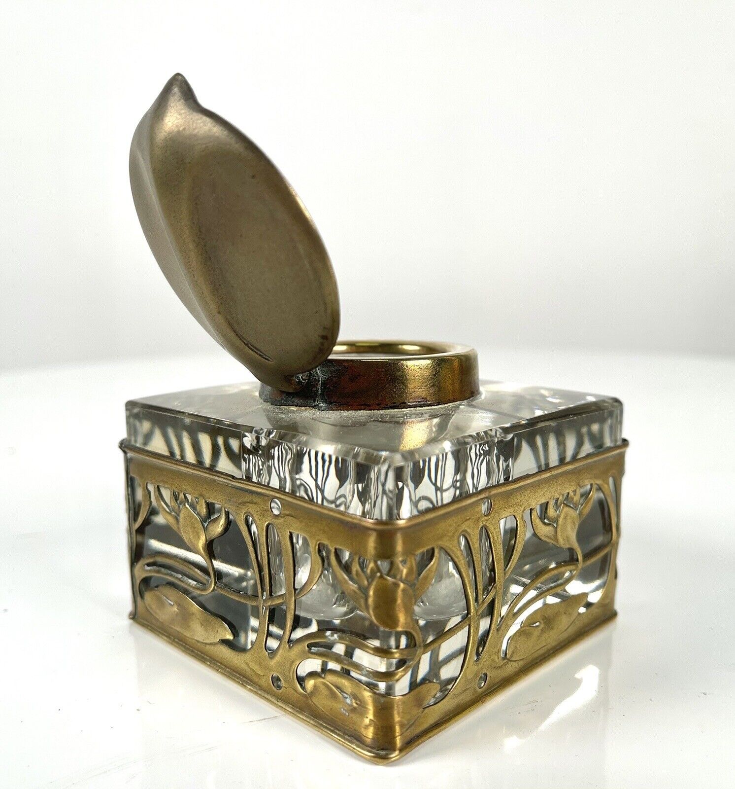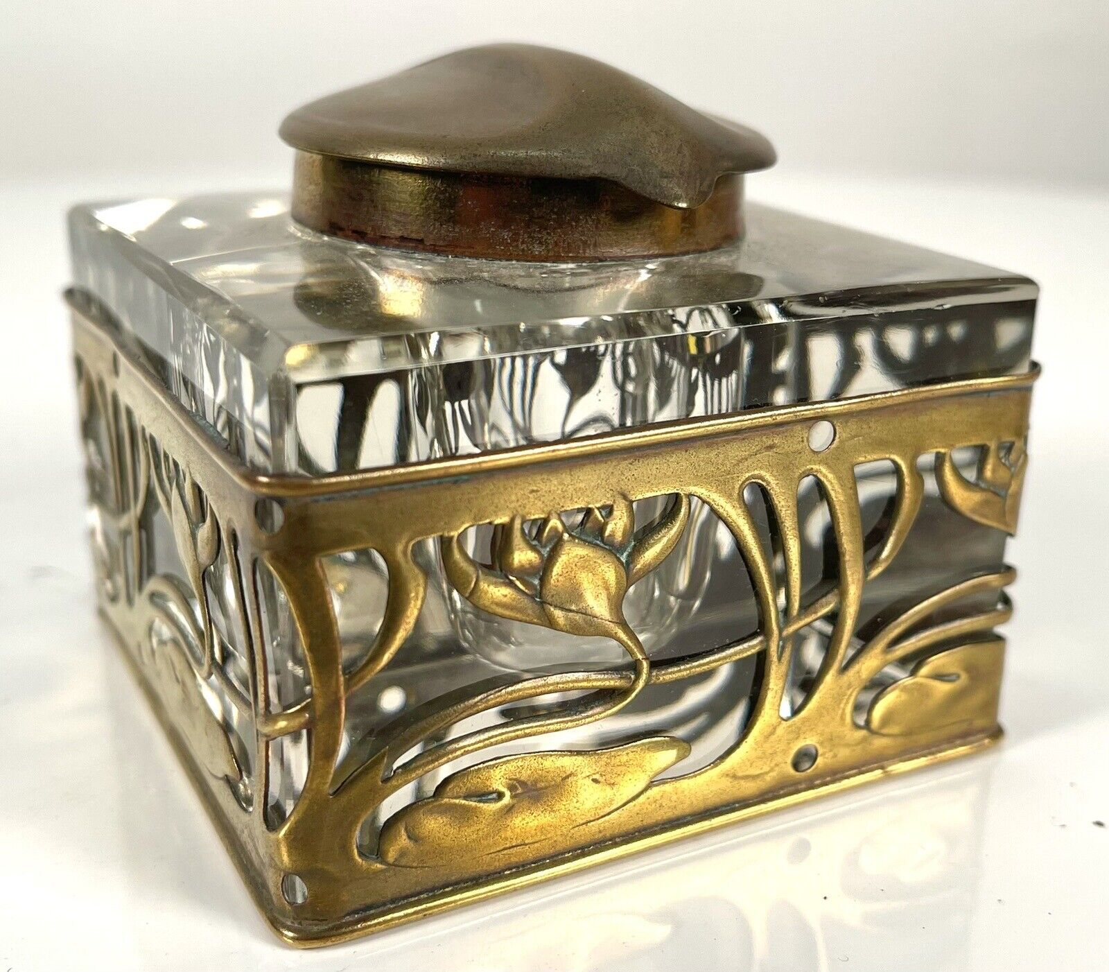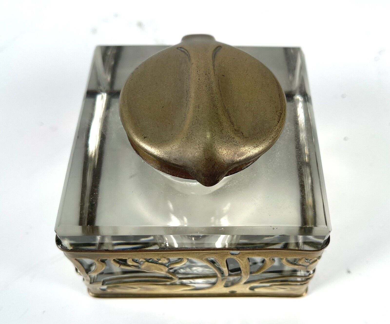 A crystal inkwell with a bronze, leaf-shaped lid which is marked “DEP 10385 and DRGM 168180”. The glass is overlaid with a decorative bronze casing with sweeping waterlily tendrils.
