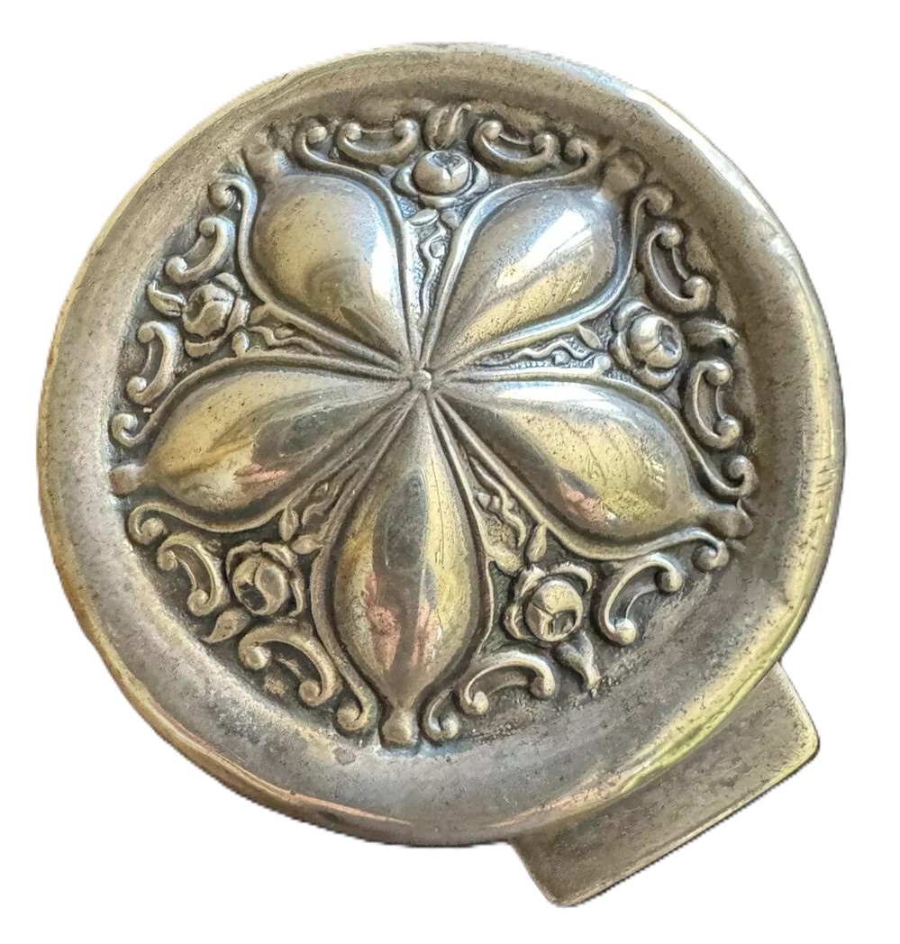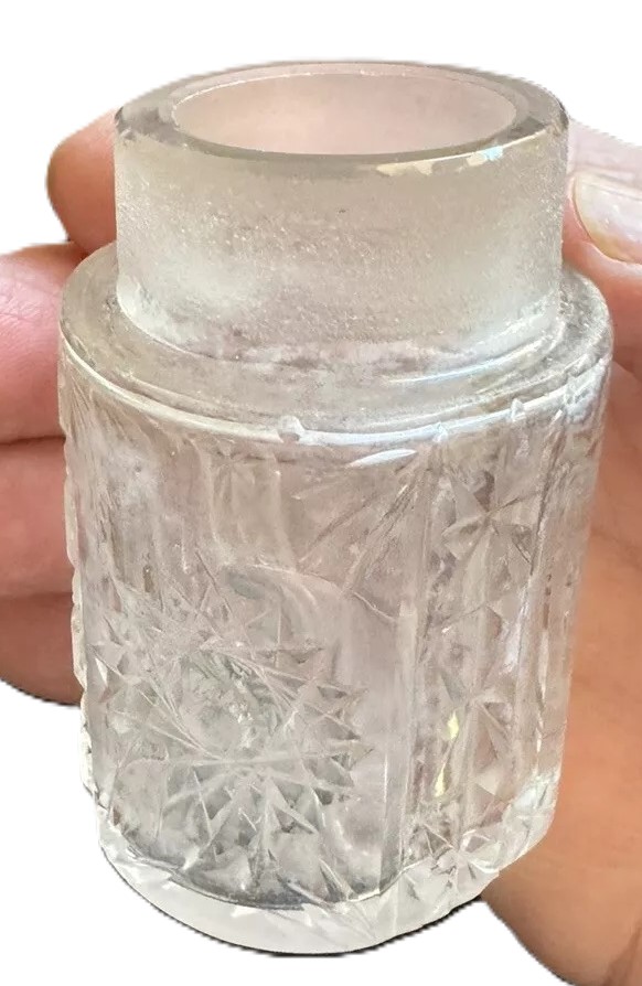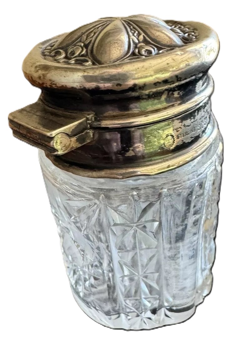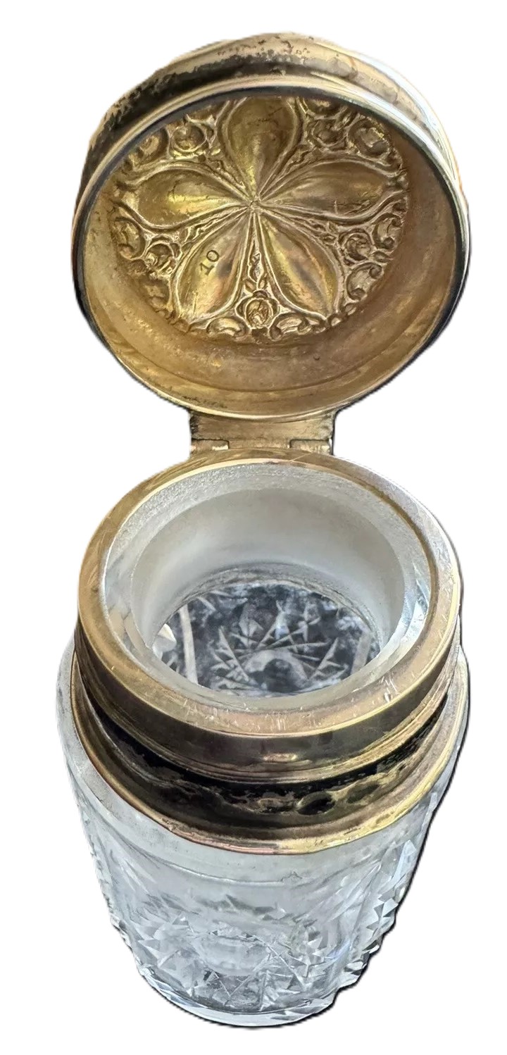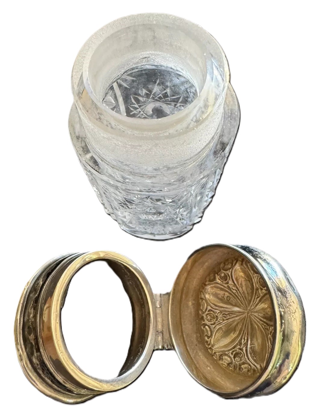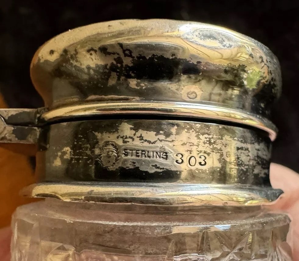 This cut crystal inkwell features a repoussé sterling silver lid, marked “Sterling 303.” The lid is adorned with an intricate floral pattern, typical of the repoussé technique, where the design is hammered into relief from the reverse side. The crystal pattern features geometric shapes, primarily triangles and diamonds, arranged symmetrically to create star-like designs and intricate cross-hatching effects.