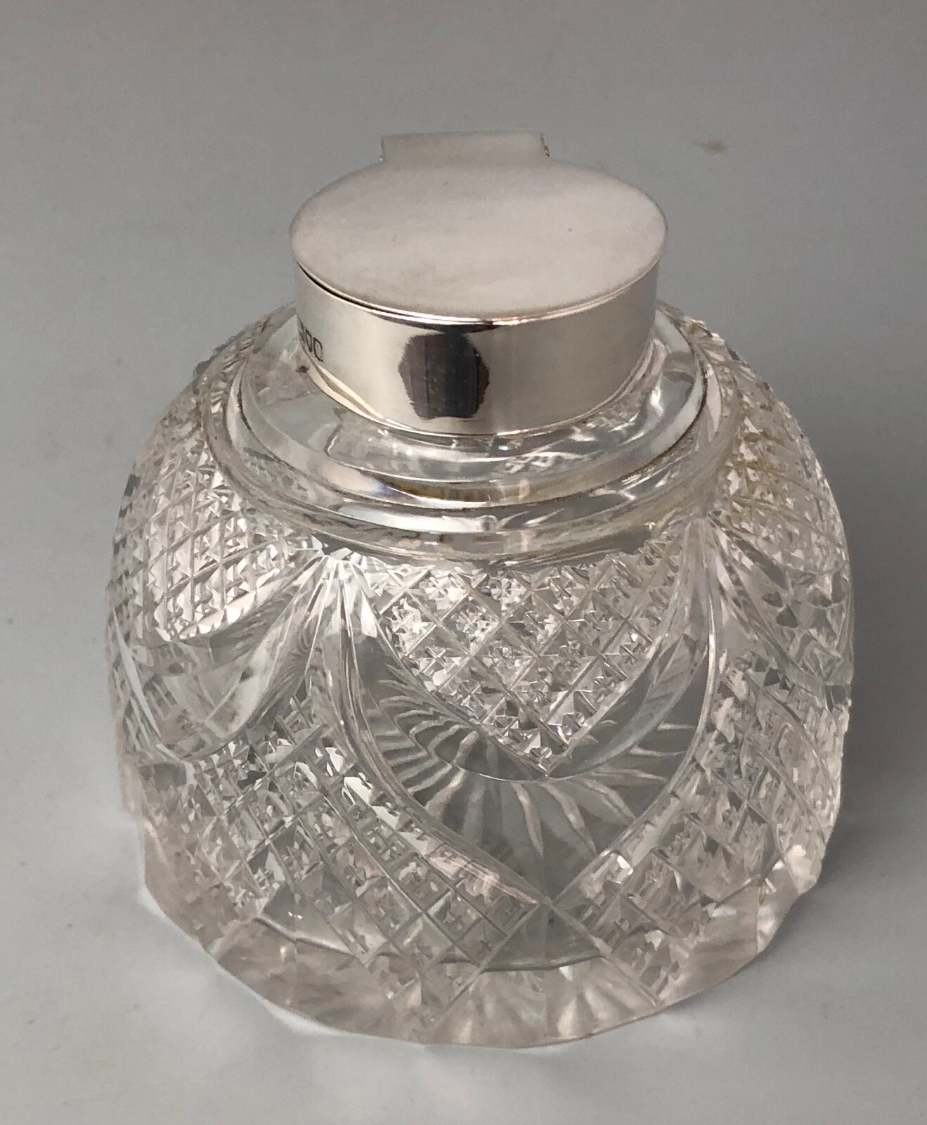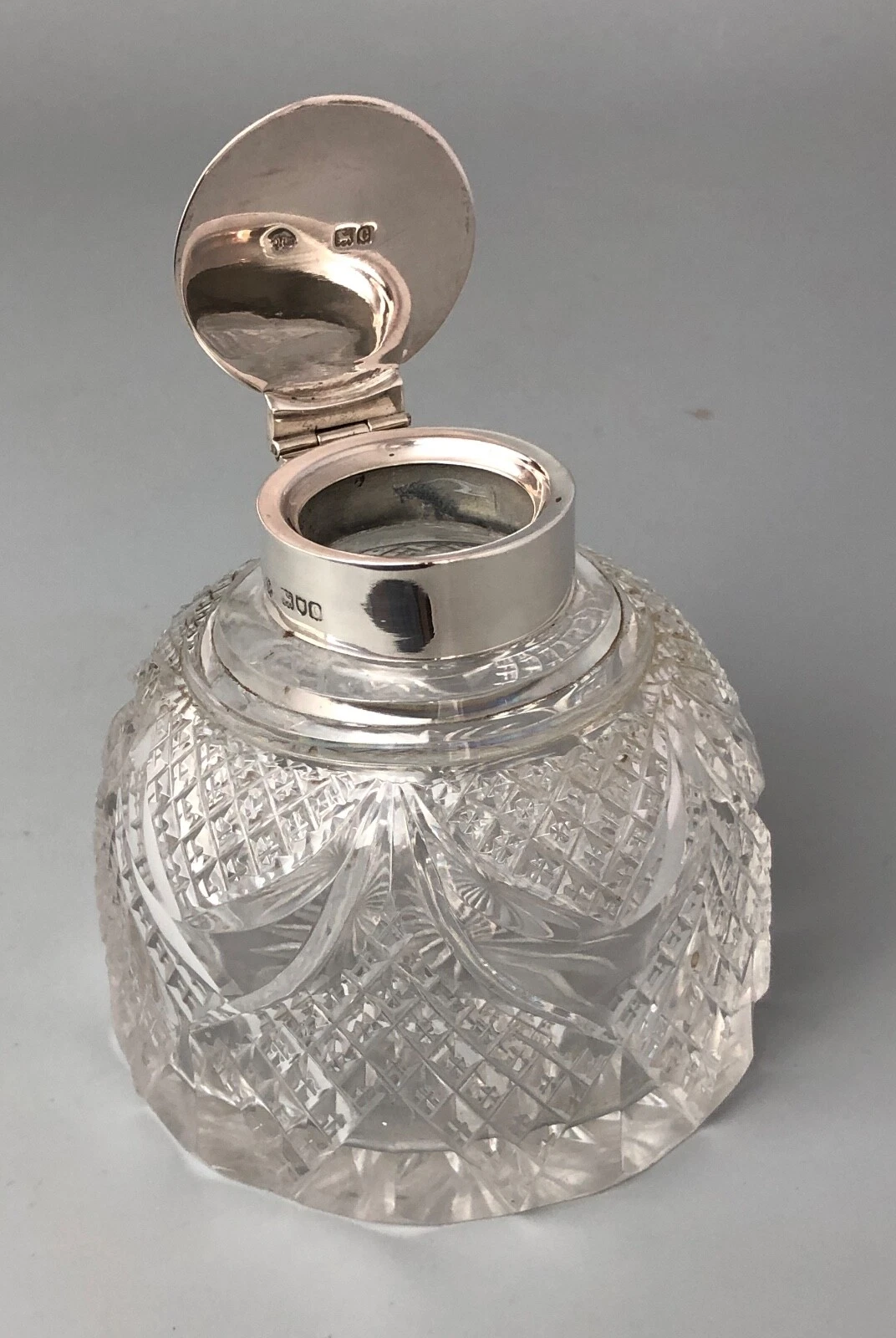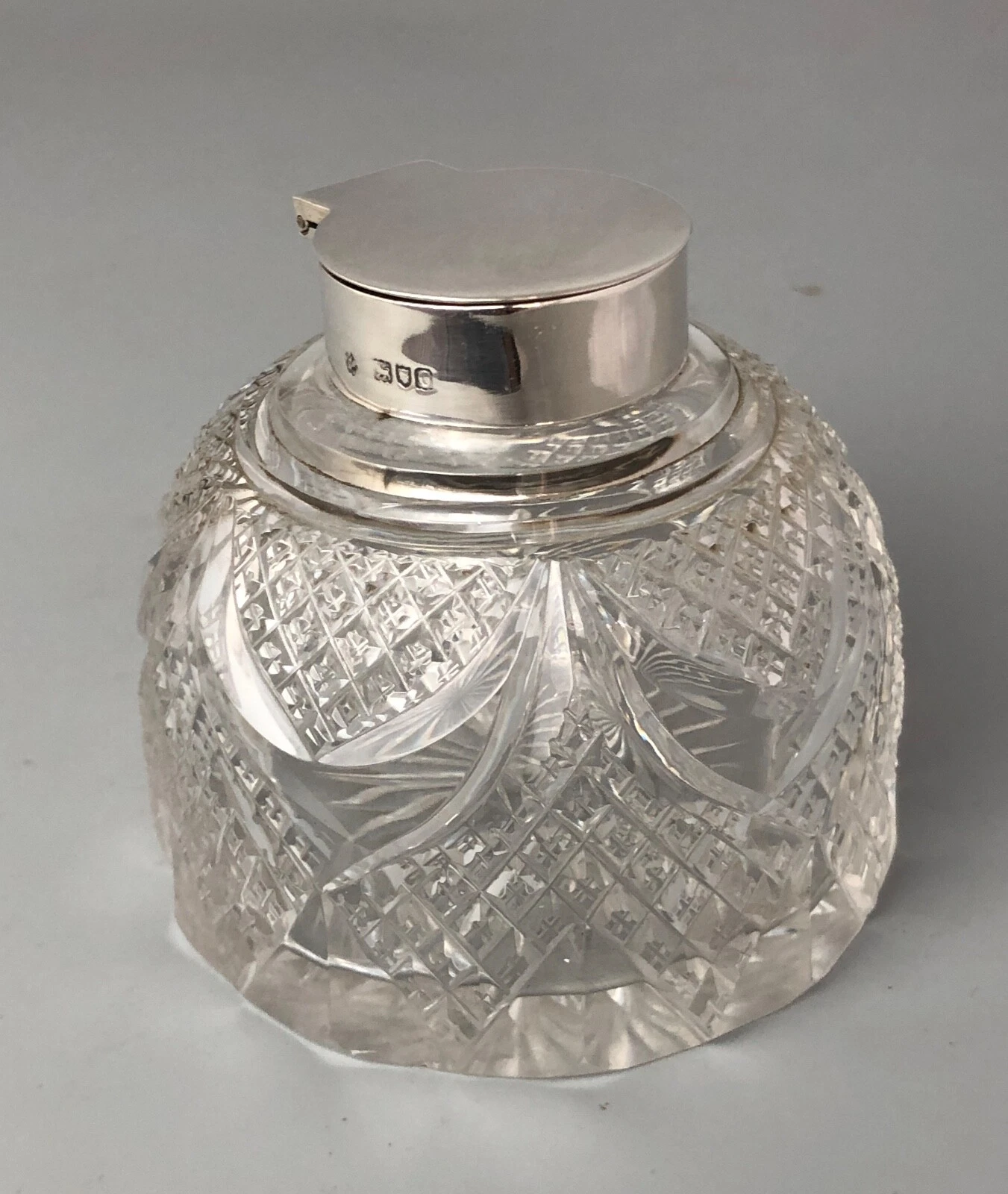 This late-Victorian cut glass inkwell, dating from the turn of the century, combines the artistry of the London silversmithing trade with high-quality English lead crystal.