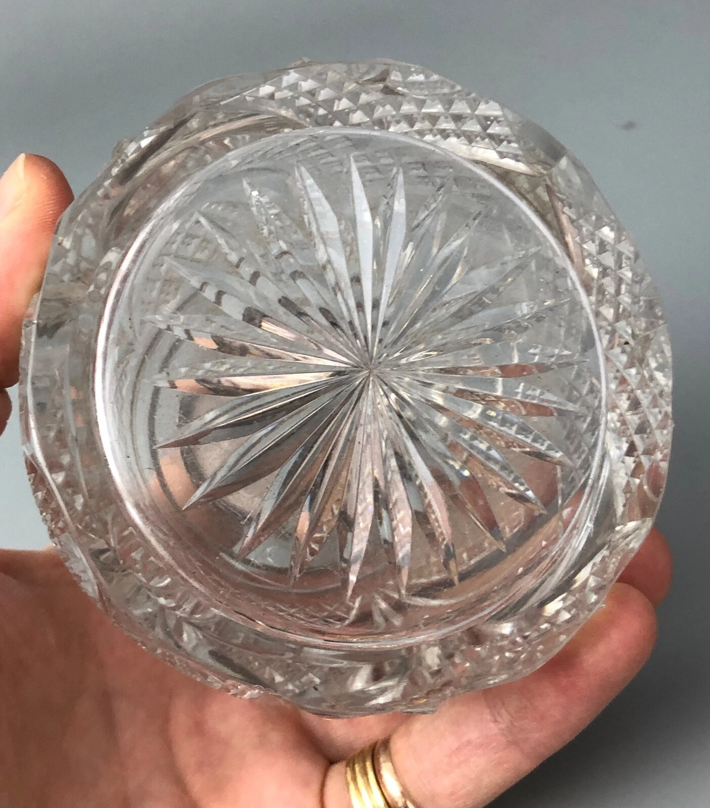• The Glass Body: The inkwell is made from heavy lead crystal, featuring a “Strawberry Diamond and Fan” pattern. The deeply cut facets are designed to catch and refract light, creating a shimmering effect known as “fire” in antique glass.