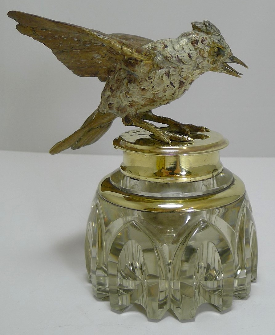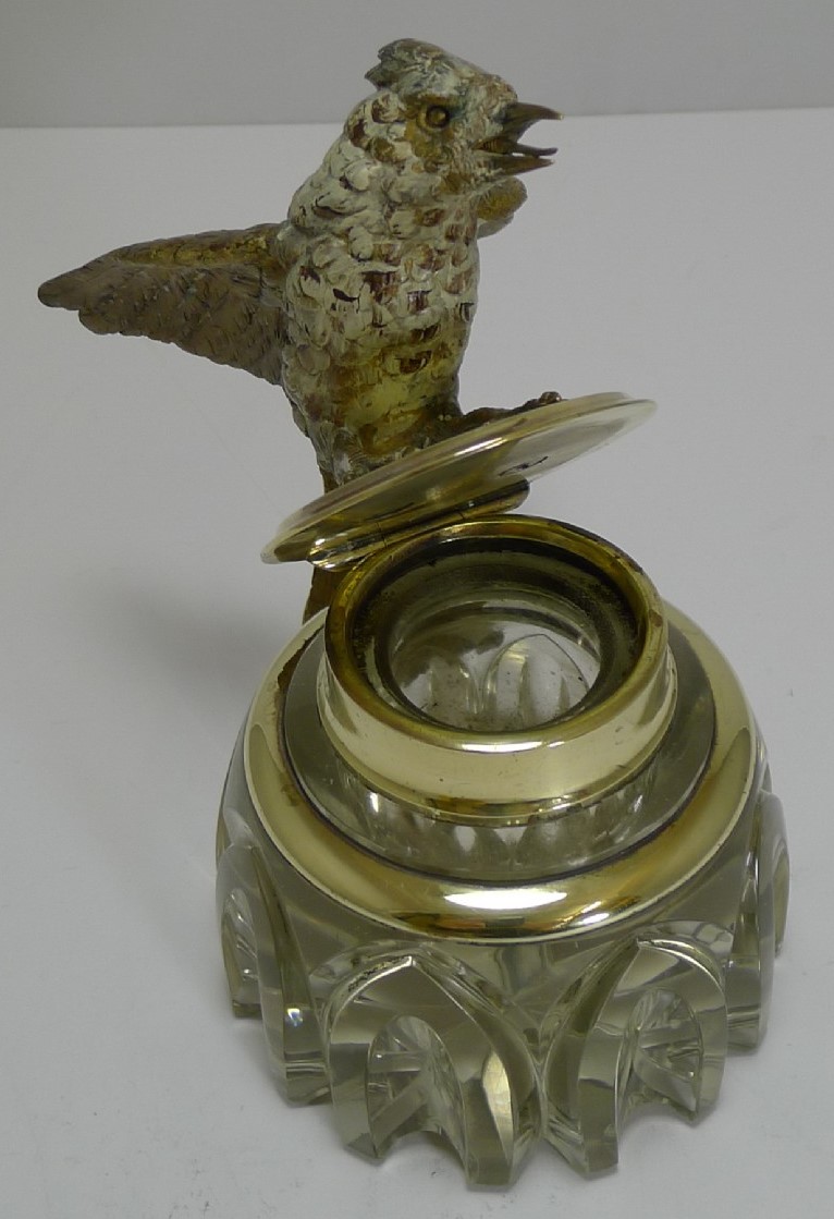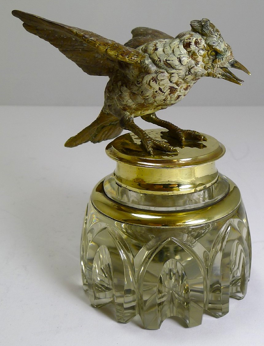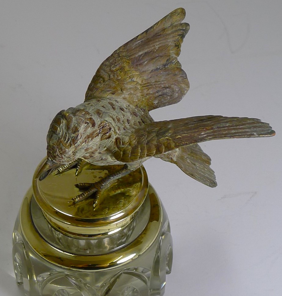 This hand-cut crystal inkwell has a top that is adorned with a cast, cold painted Vienna bronze bird. The bird appears to be in mid-flight, with its wings spread and beak open.