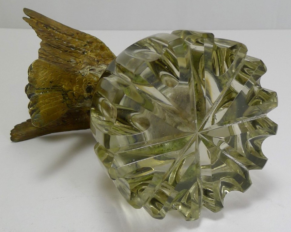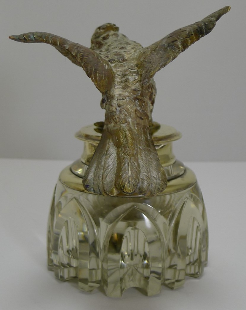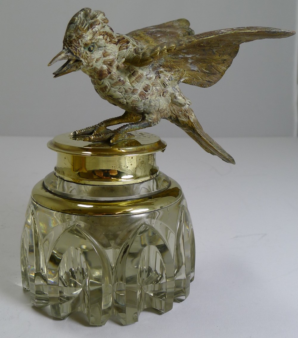 This hand-cut crystal inkwell has a top that is adorned with a cast, cold painted Vienna bronze bird. The bird appears to be in mid-flight, with its wings spread and beak open.