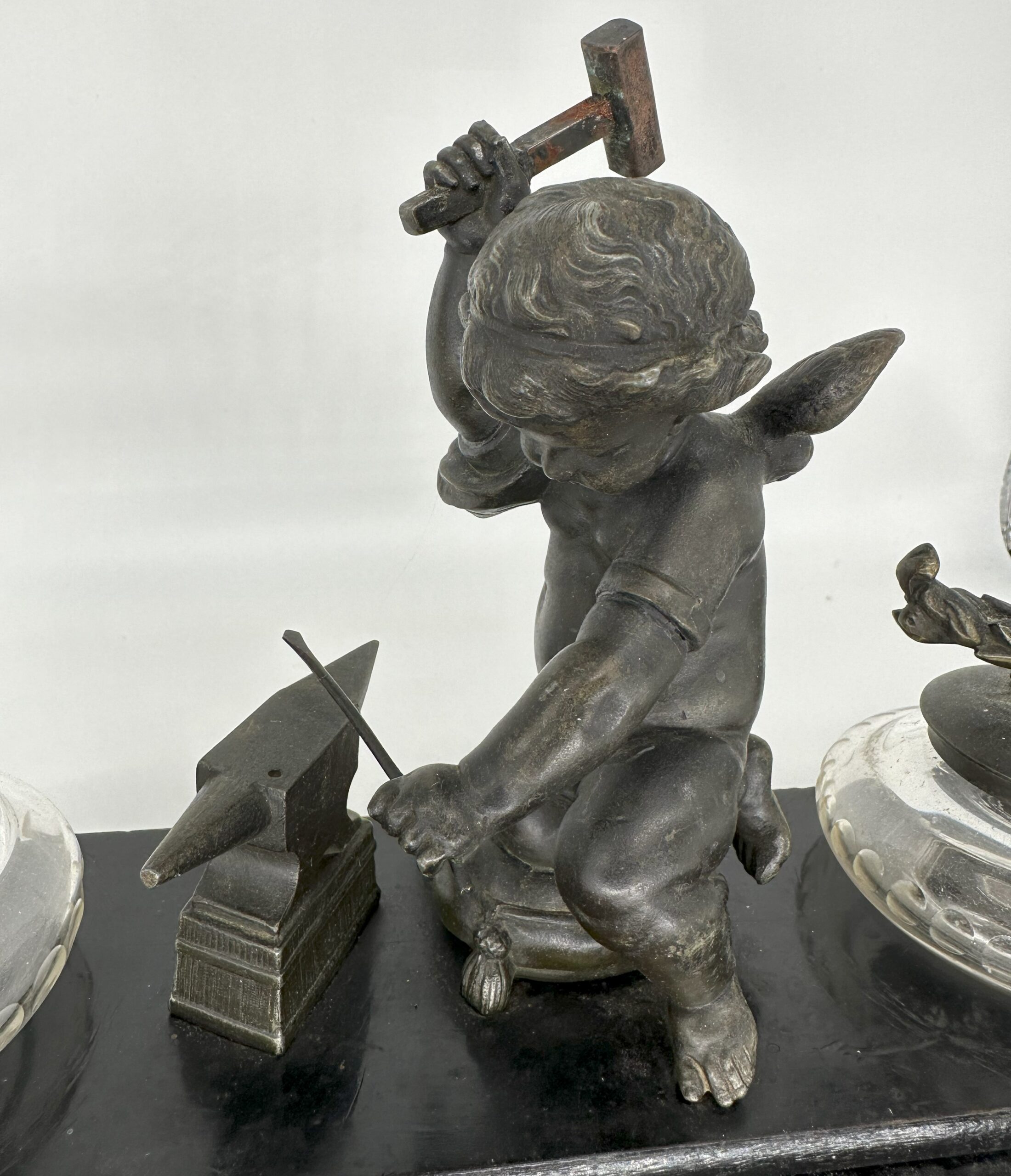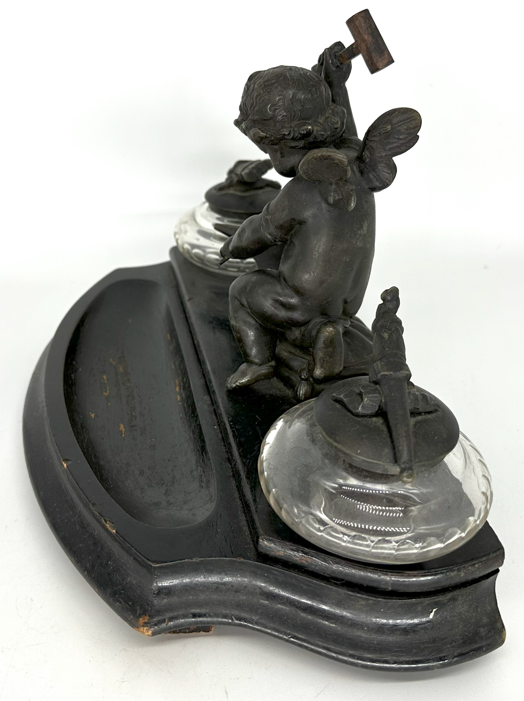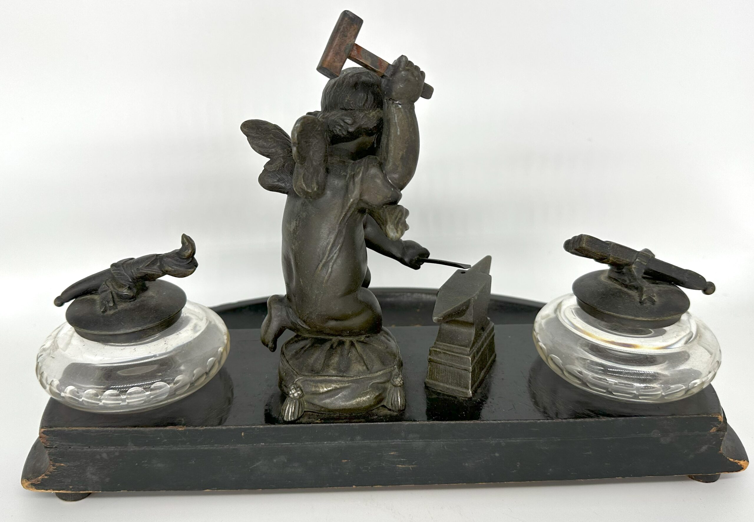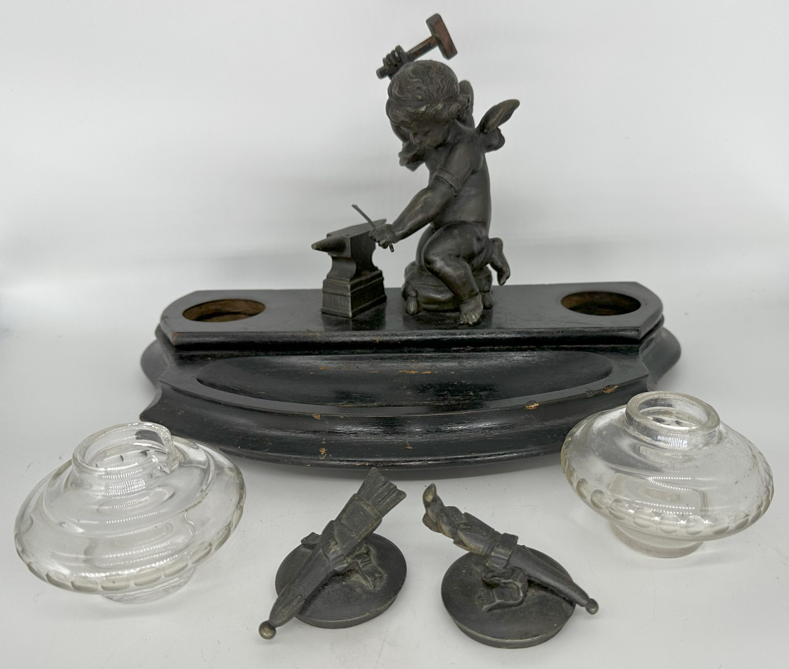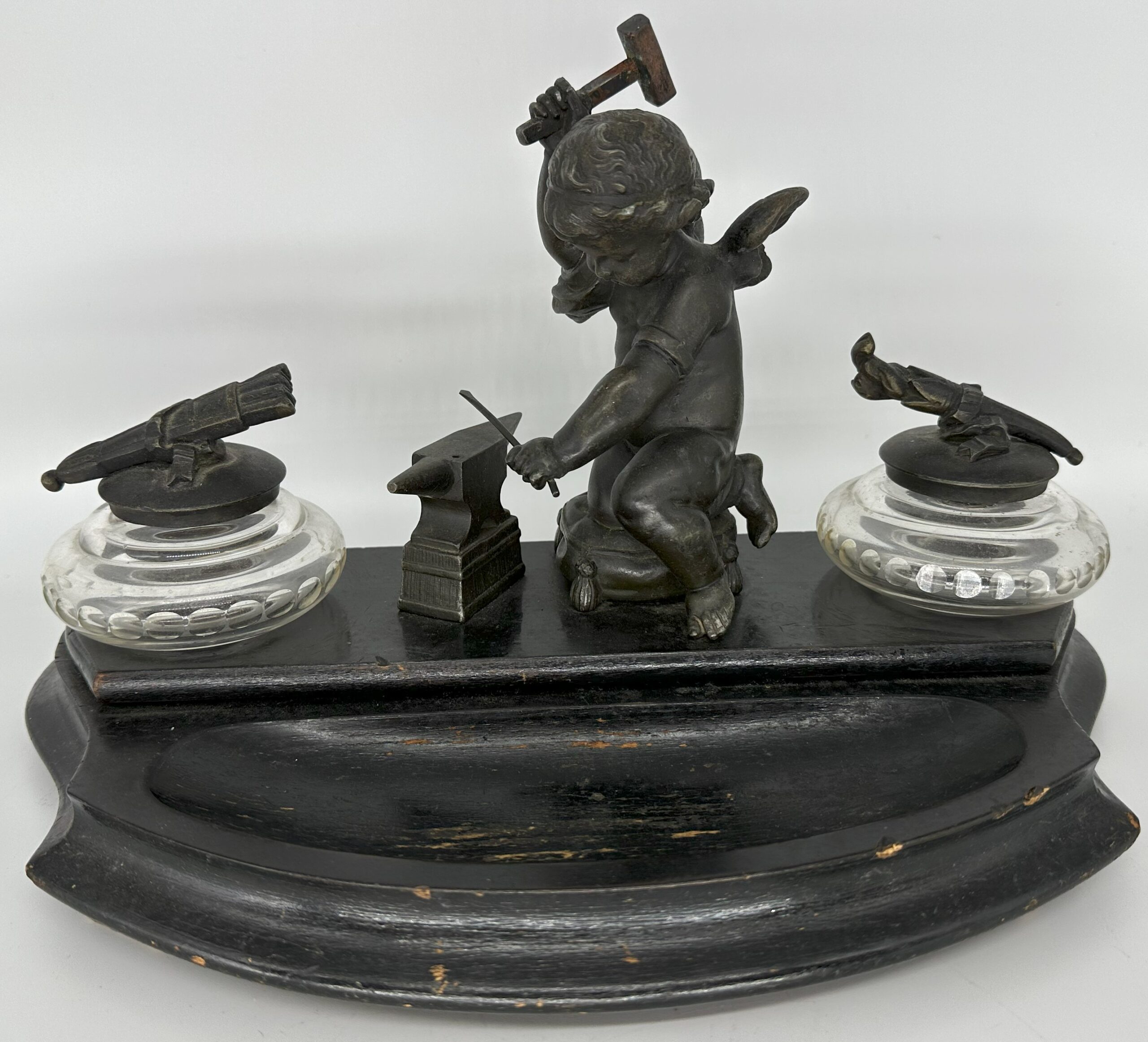 Winged cupid, holding a mallet, is hard at work forging an arrow on an anvil, readying to cast his love spell. He kneels on a tasseled pillow between two stemmed glass inkwells, all on a wooden base painted black. The lid on one of the inkwells is a figural torch. The other lid is a quiver of arrows.